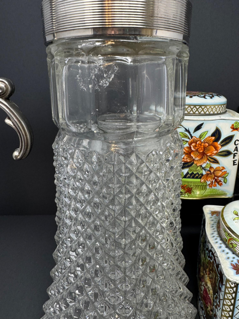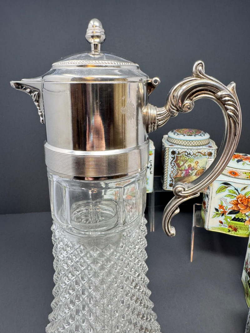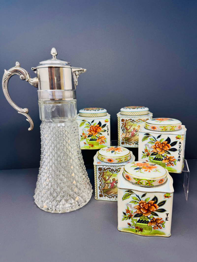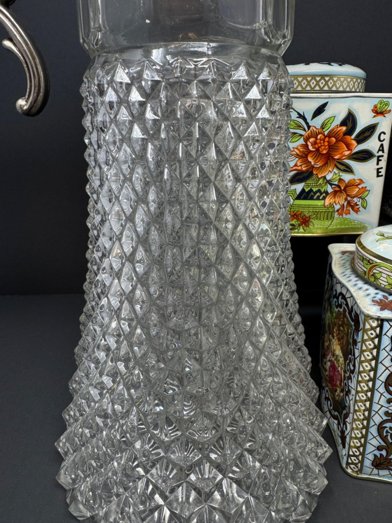 5 Daher Floral Tin Boxes + Diamond Point Glass & Silverplate Carafe. Pitcher 13.5” Tall (Inside Has Glass Insert For Ice) Vintage Tea Runs Have Normal Wear Consistent With Age. Lettering Is Stickers And Can Easily Be Peeled Off
