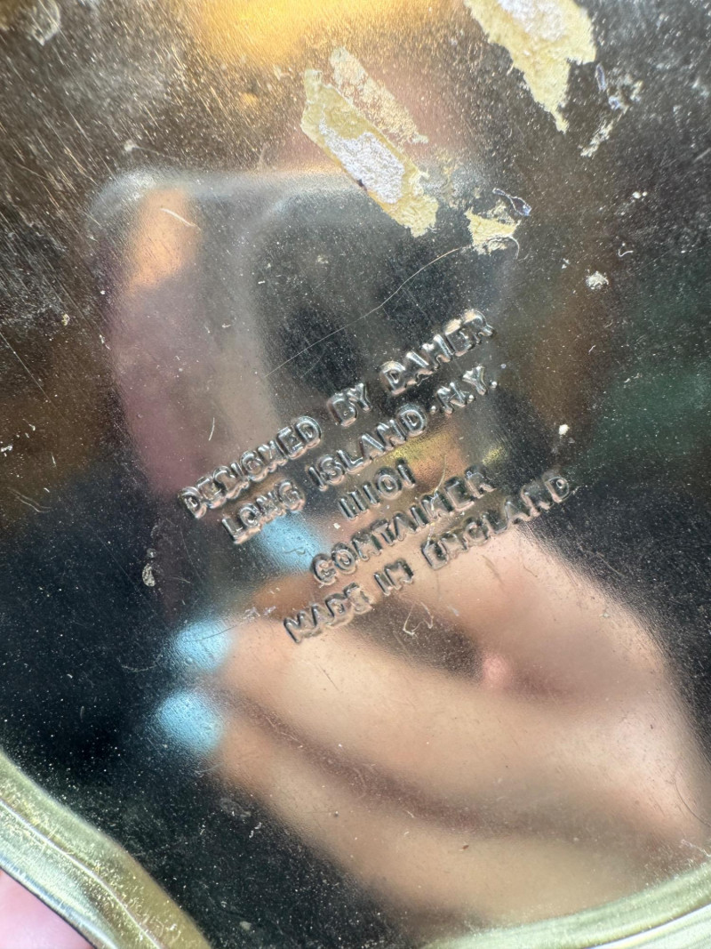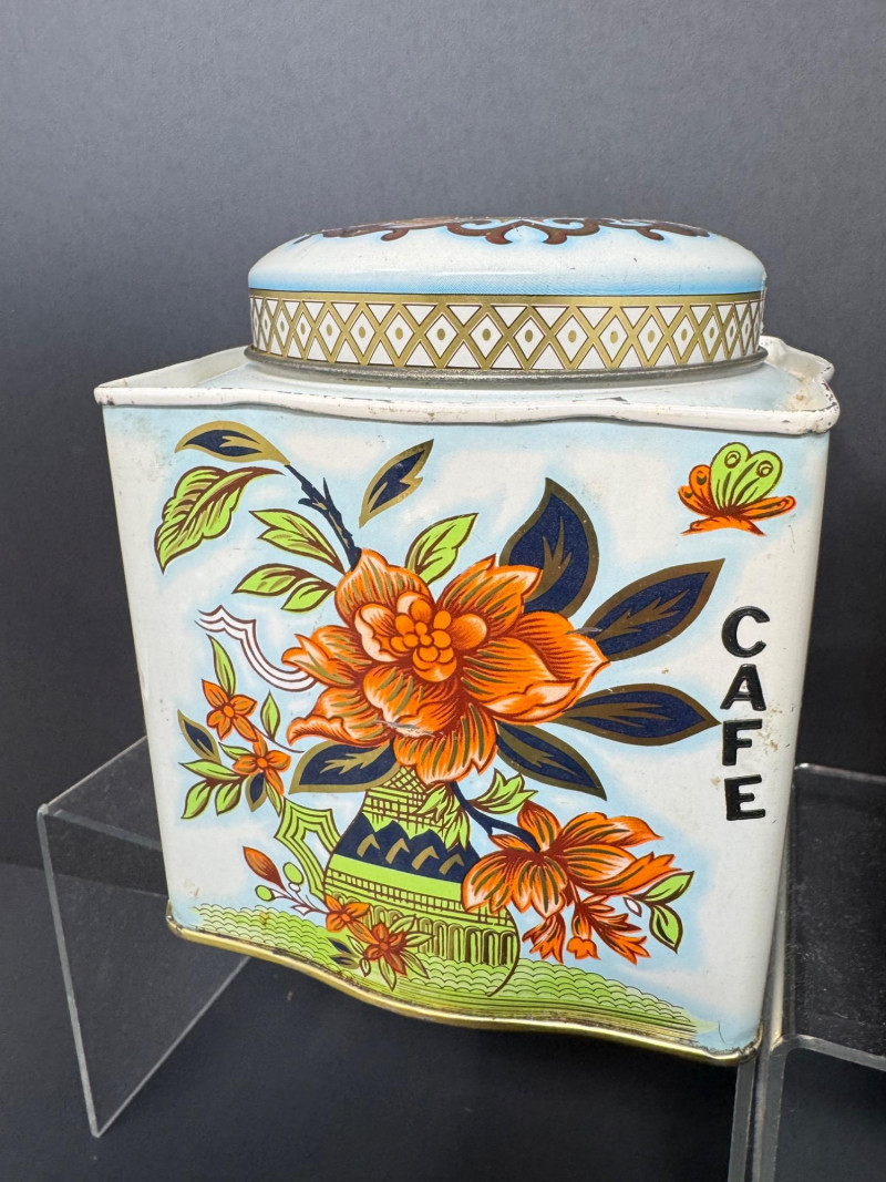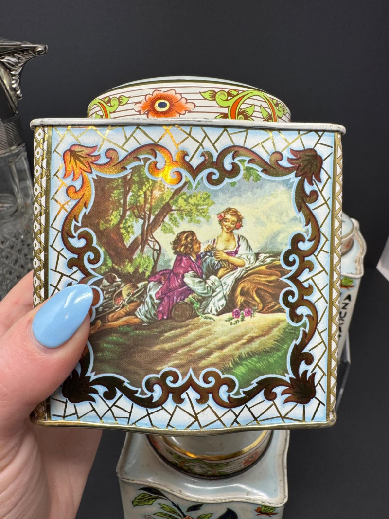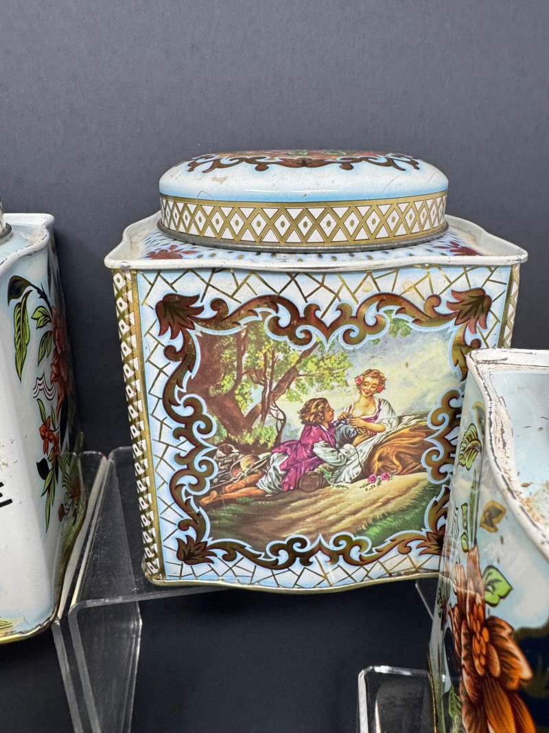 5 Daher Floral Tin Boxes + Diamond Point Glass & Silverplate Carafe. Pitcher 13.5” Tall (Inside Has Glass Insert For Ice) Vintage Tea Runs Have Normal Wear Consistent With Age. Lettering Is Stickers And Can Easily Be Peeled Off