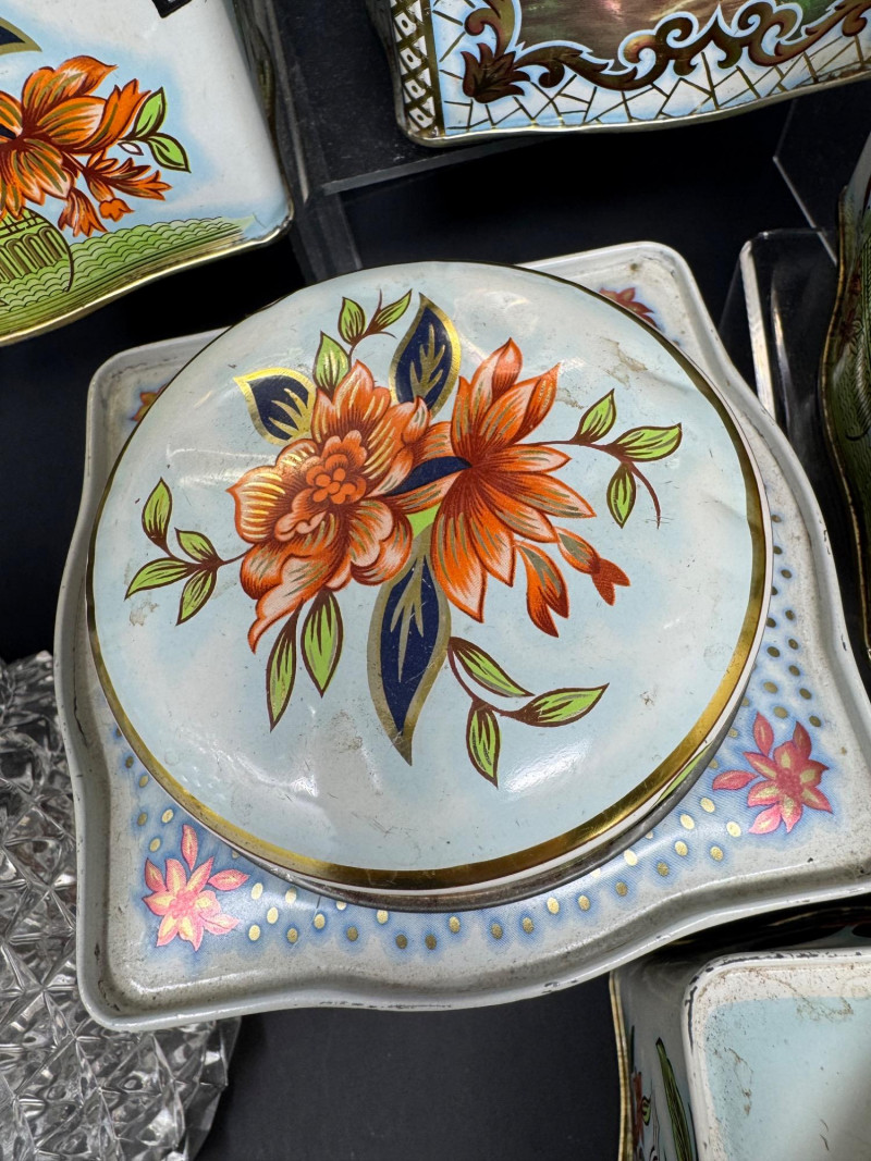 Lot # 9 - 5 Daher Floral Tin Boxes + Diamond Point Glass & Silverplate Carafe