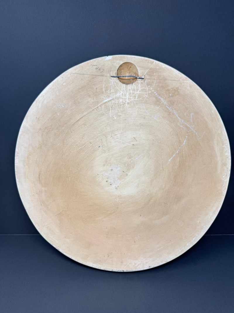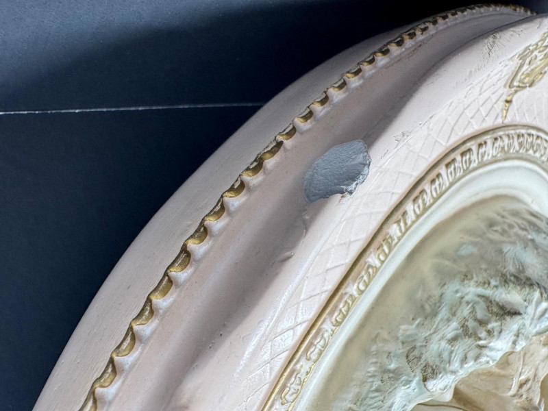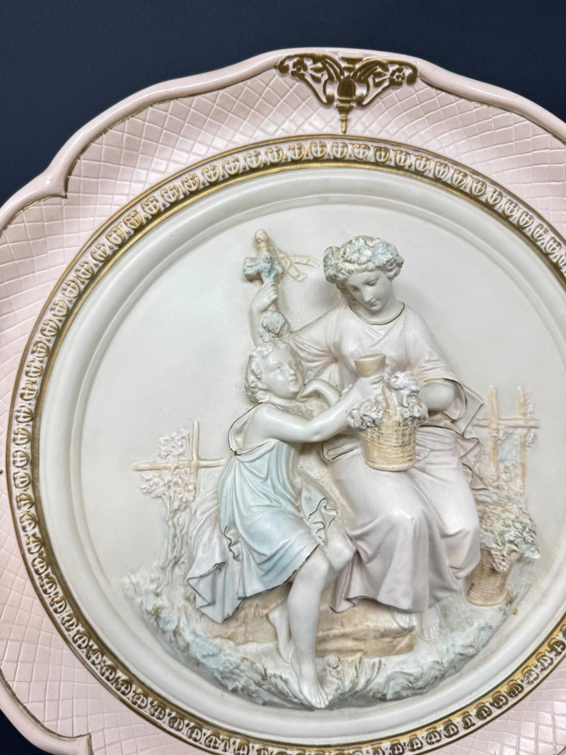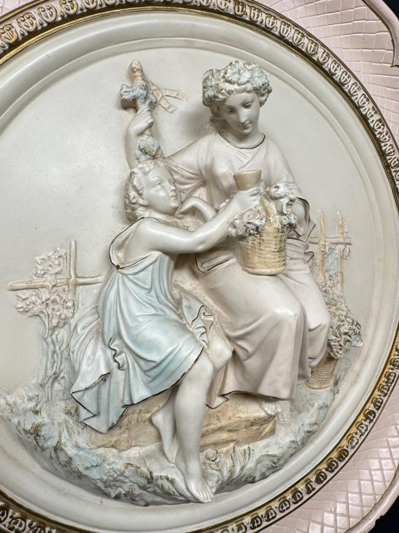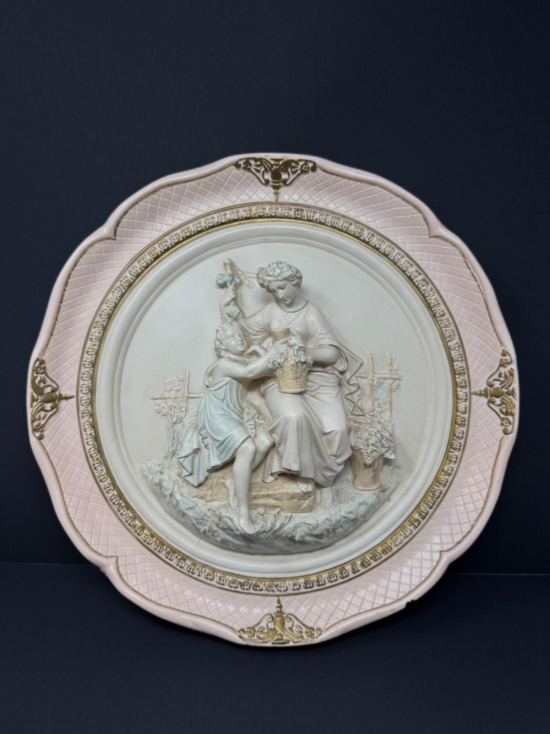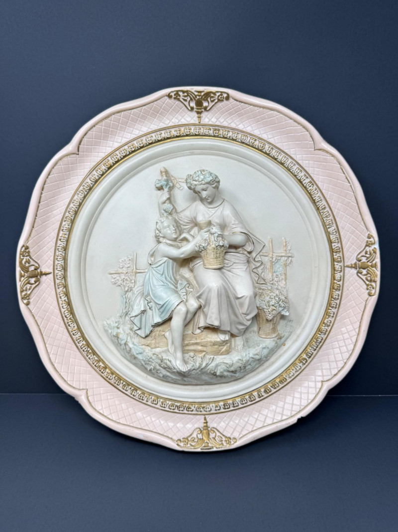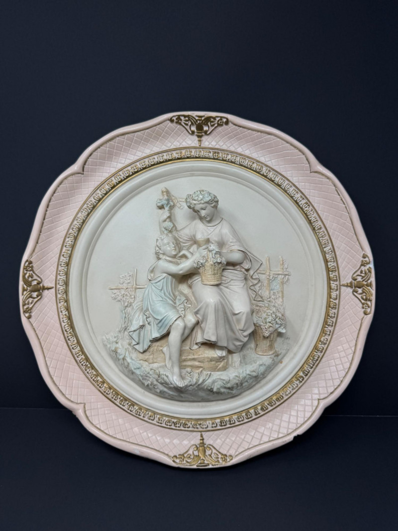 Alexander Backer Wall Plaque – 3D Victorian Mother & Child. Baby Pink Chalkware Mother-Child Wall Art 15” Diameter Note: Two chips are present on this item.