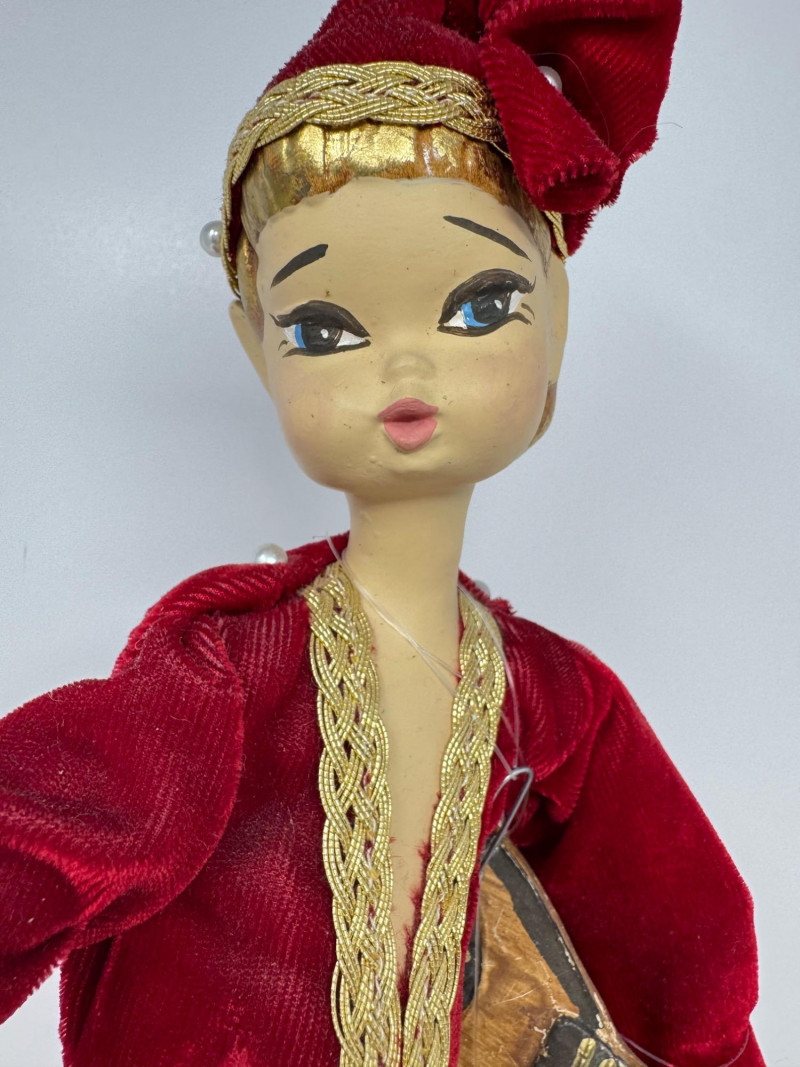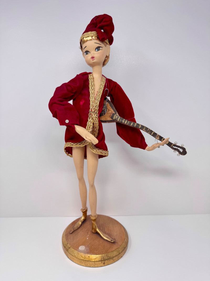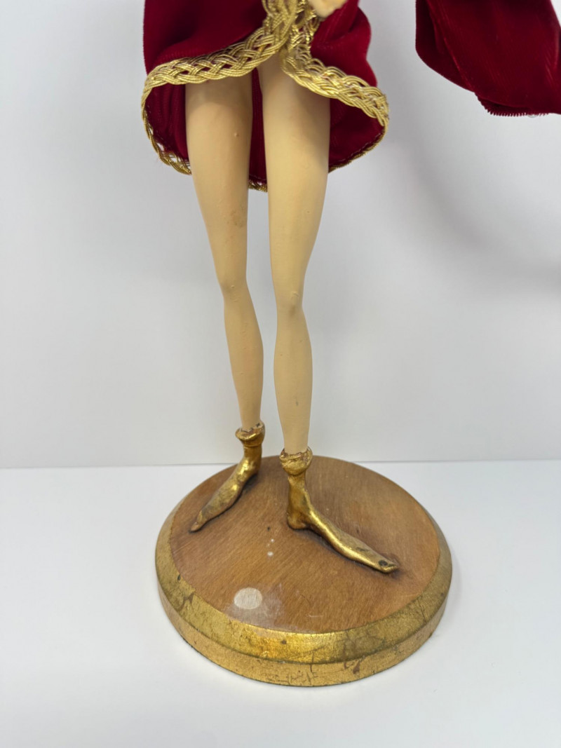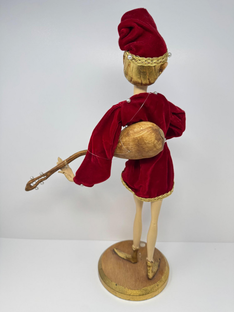 Vintage Musician Doll w/ Red Velvet Costume on Wood Base. 18” Tall Two Broken Fingers