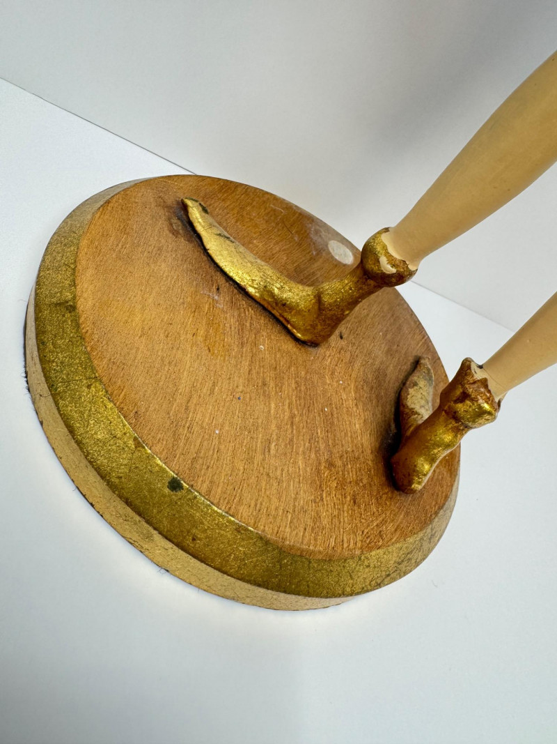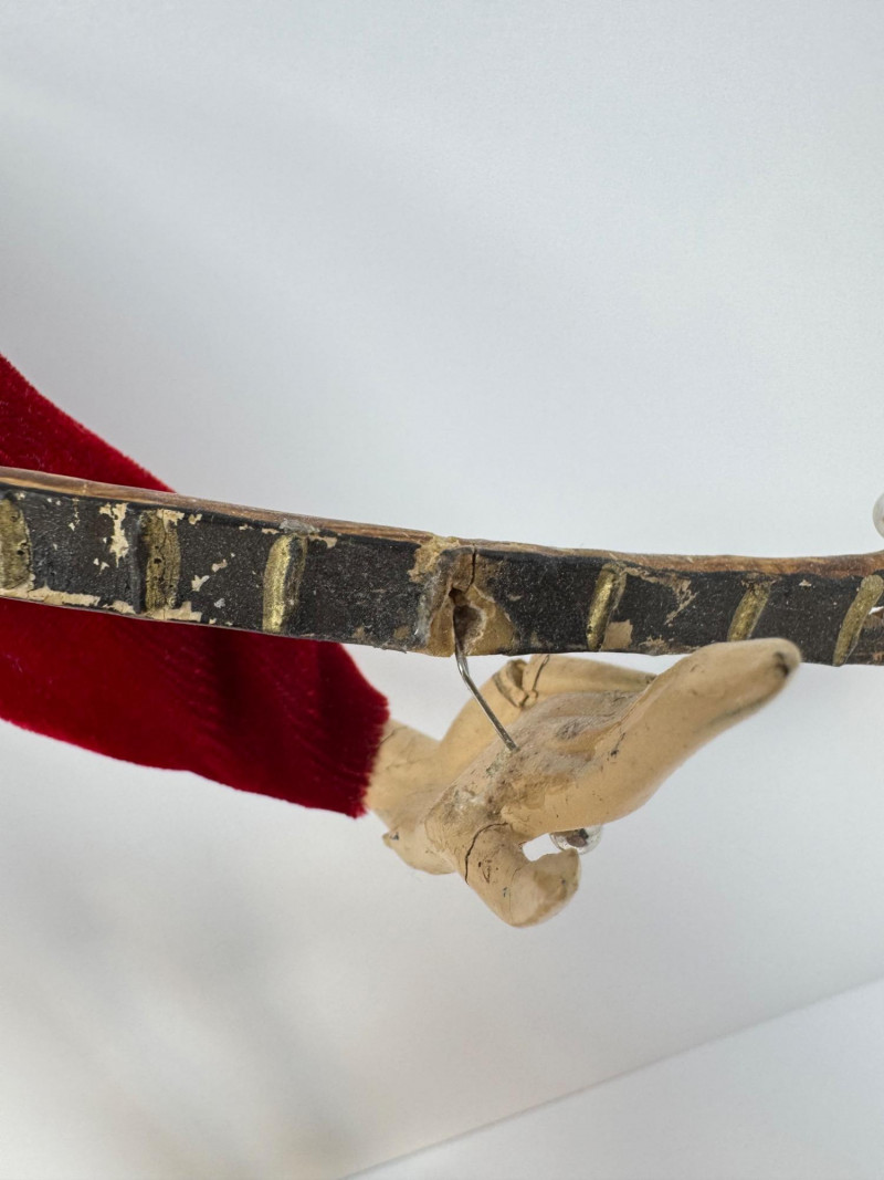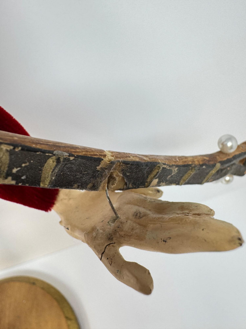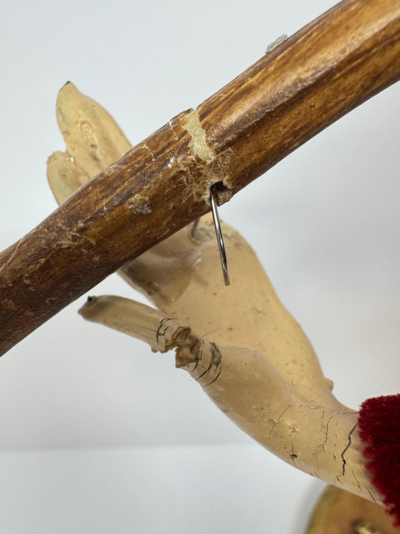 Vintage Musician Doll w/ Red Velvet Costume on Wood Base. 18” Tall Two Broken Fingers