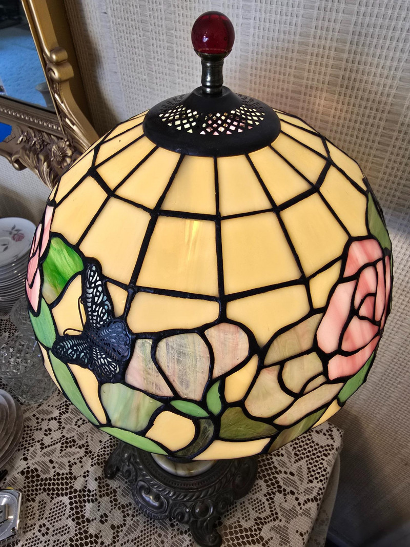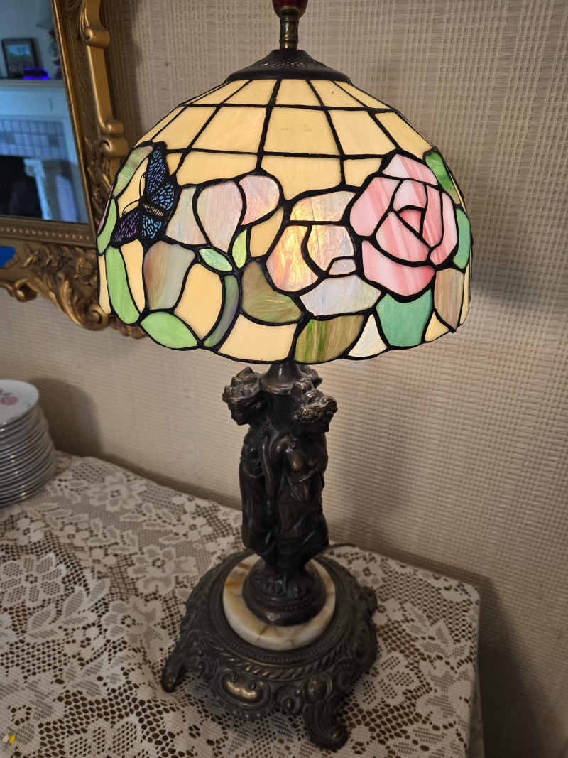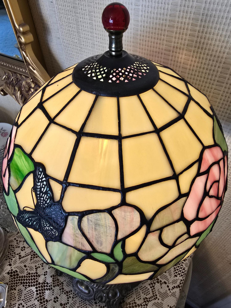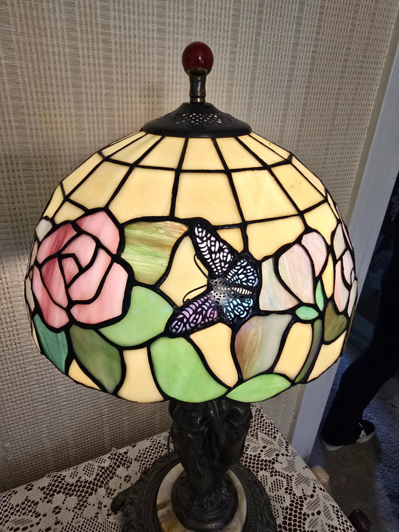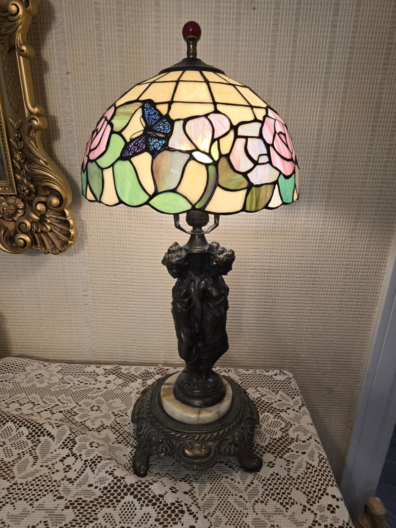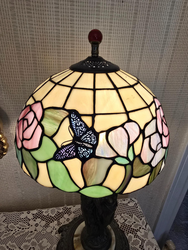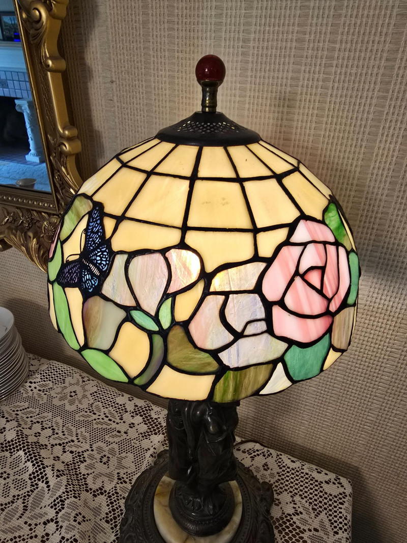Tiffany-Style Stained Glass, Rose & Butterfly Lamp w/ Figural Base. 25 " x 11"