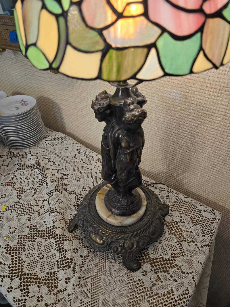 Lot # 21 - Tiffany-Style Stained Glass, Rose & Butterfly Lamp w/ Figural Base