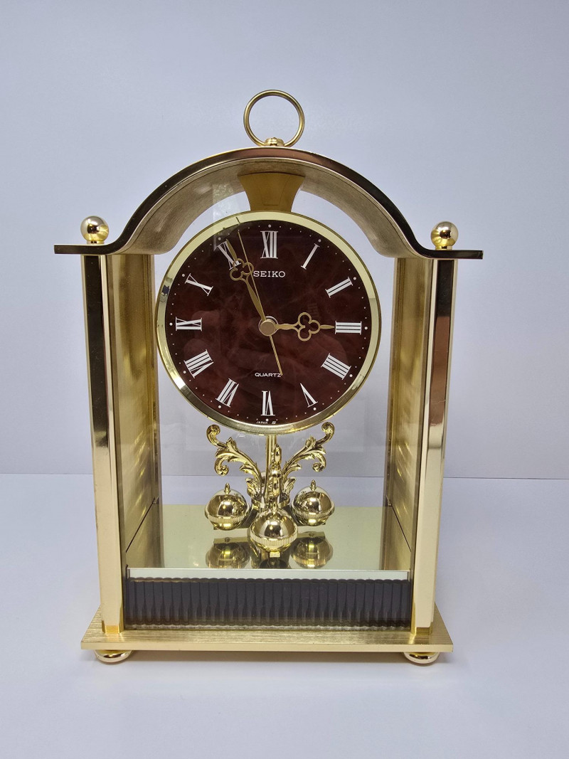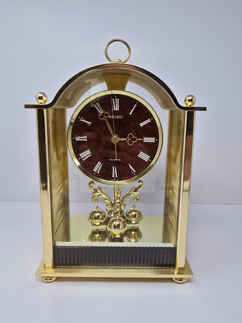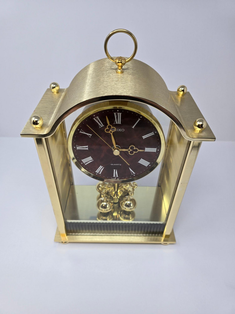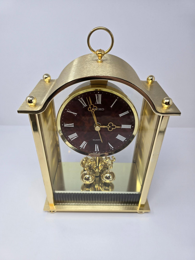 Seiko Quartz Mantel Clock – Gold-Tone Case & Rotating Pendulum. 10" x 7.5"