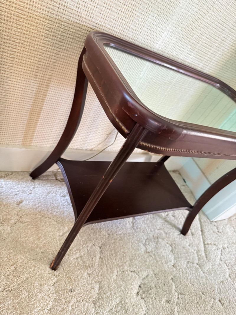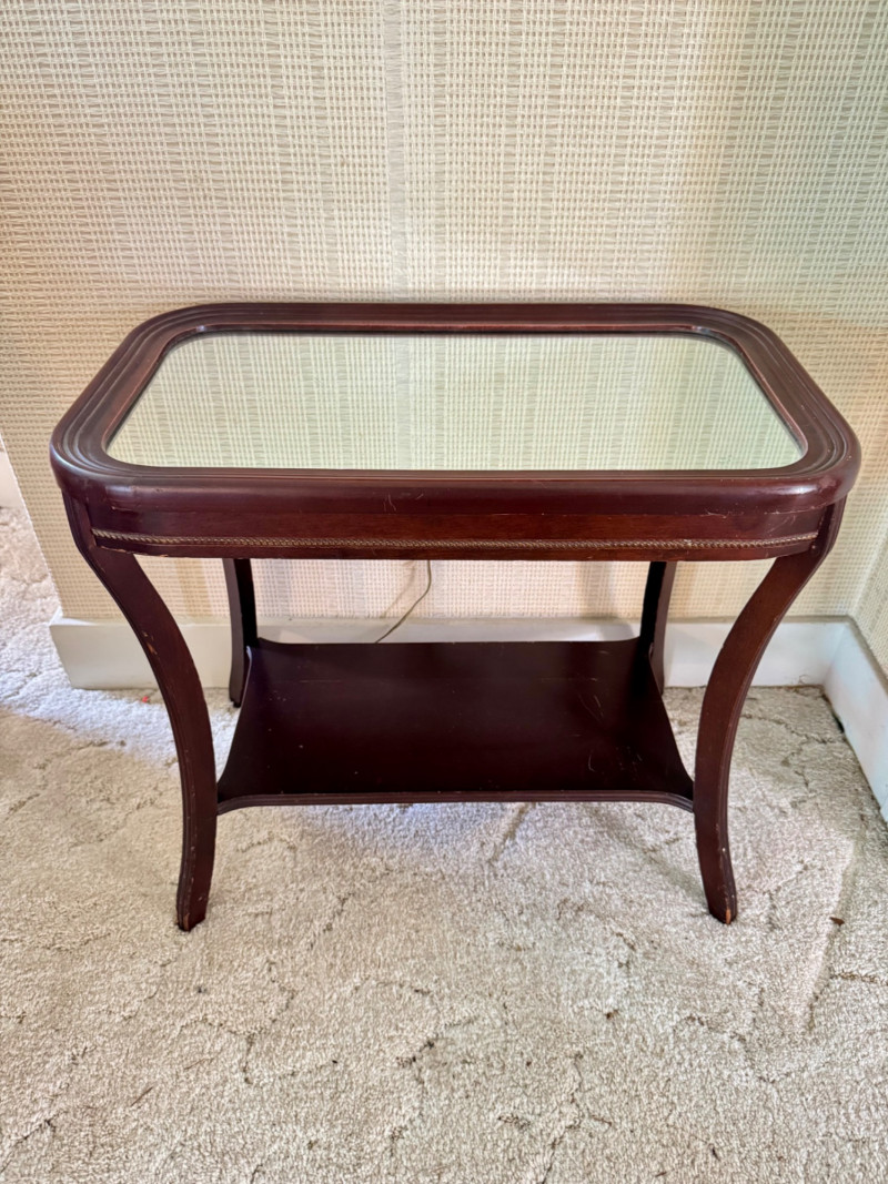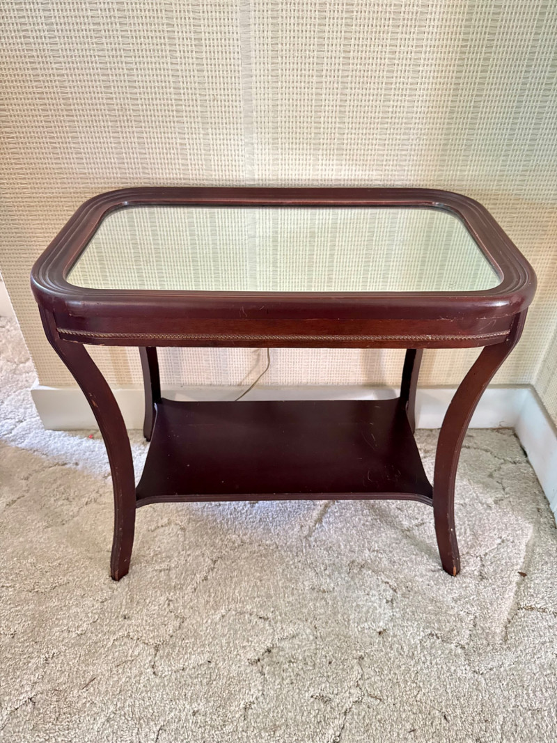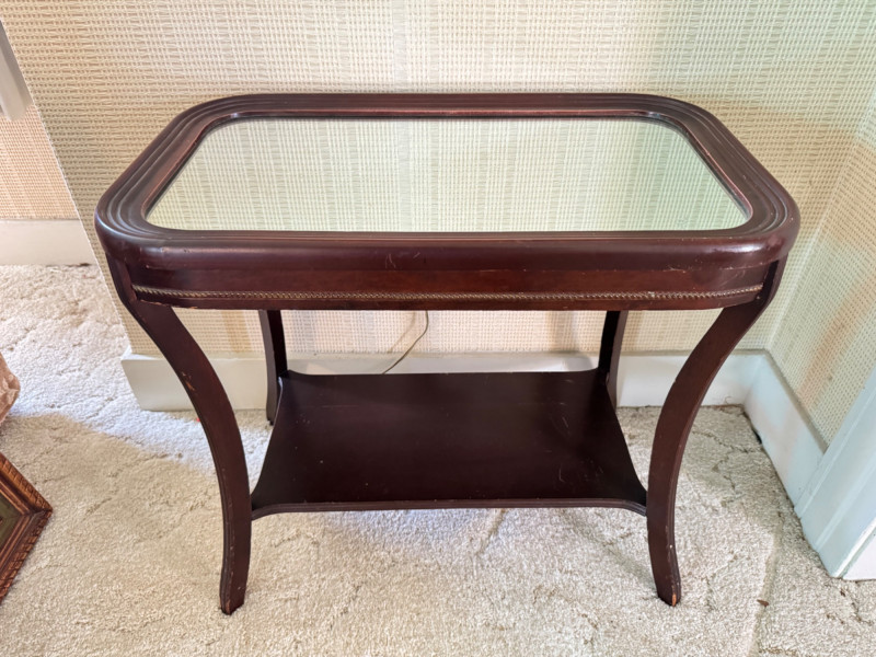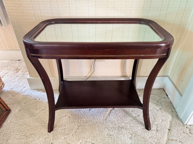 Wood Side Table w/ Glass Inset Top, Lower Shelf & Curved Legs. 24” Wide 14” Deep 22” Tall Bidding on this lot is an agreement that: (1.) You will have at least 2 capable, able bodied persons to lift and load at a minimum. (2.) You will bring a hand truck and/or any other tools needed to remove this item. If these steps are not followed your item will be forfeit and no refund given.