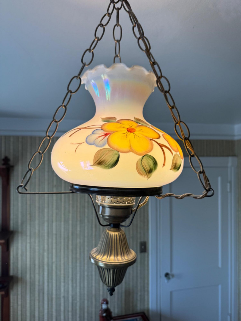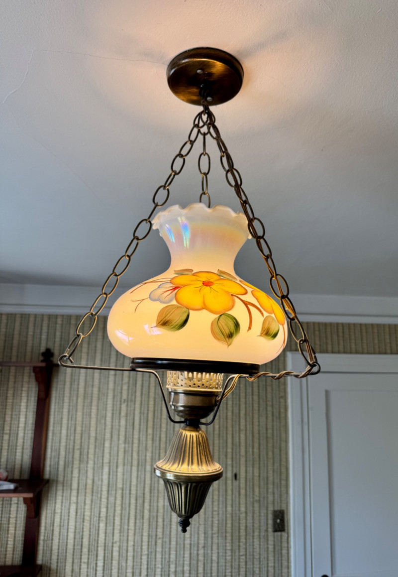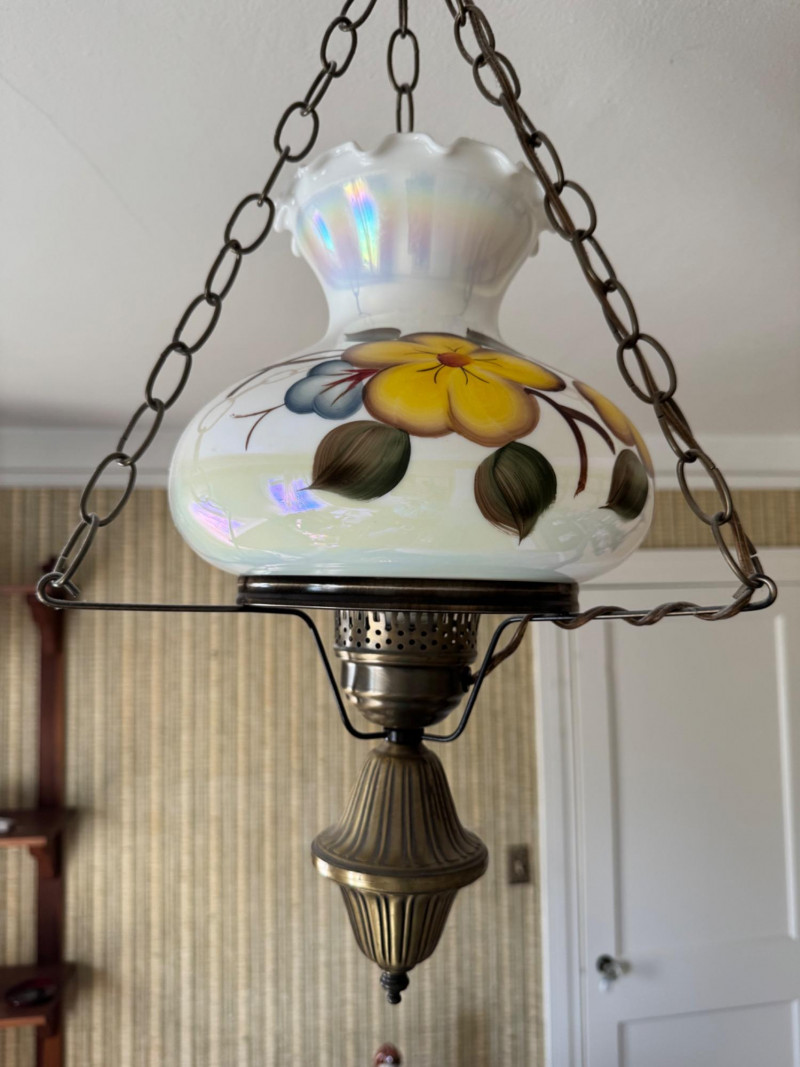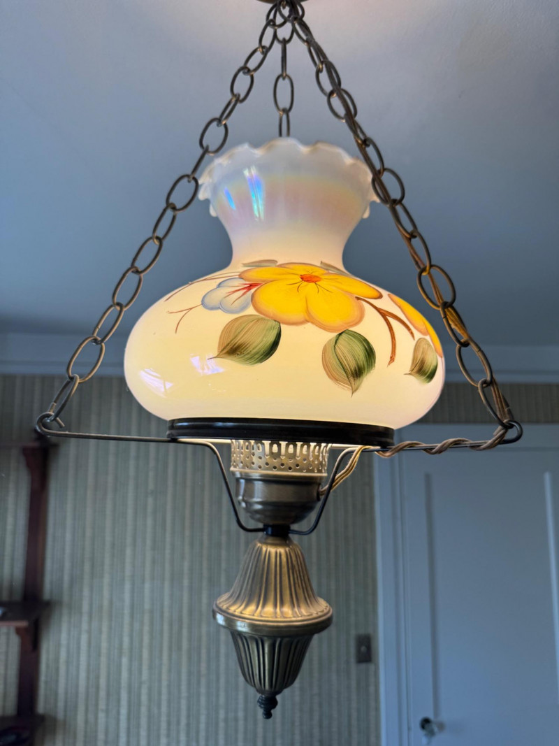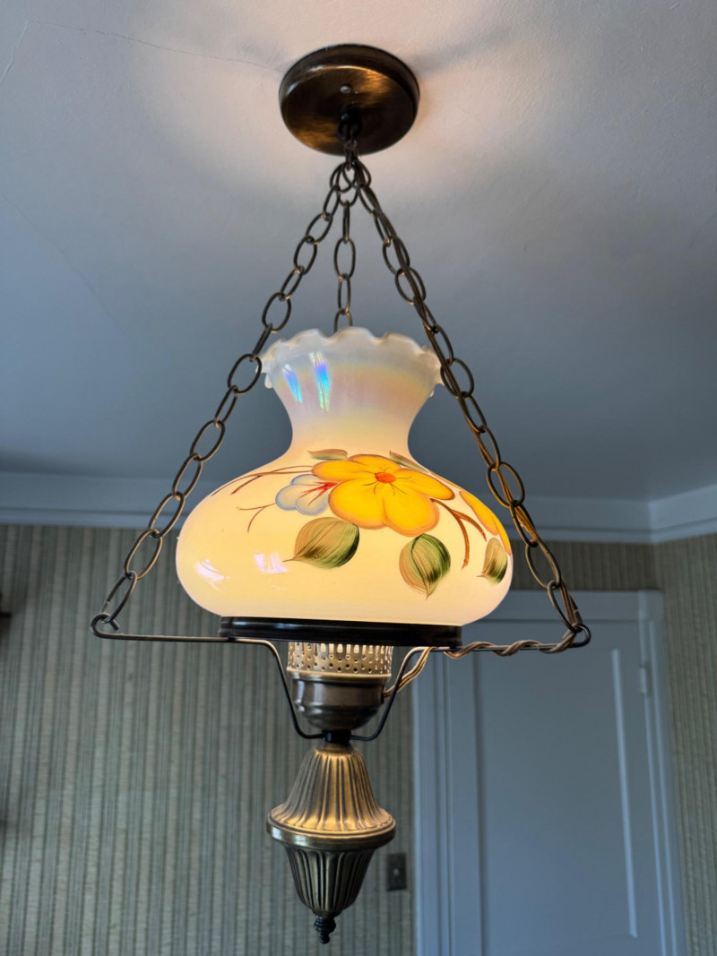 Vintage Hand-Painted Glass Pendant Light – Hardwired Floral Shade. 28” Long Bidding on this lot is an agreement that: (1.) You will have at least 2 capable, able bodied persons to lift and load at a minimum. (2.) You will bring a hand truck and/or any other tools needed to remove this item. If these steps are not followed your item will be forfeit and no refund given.