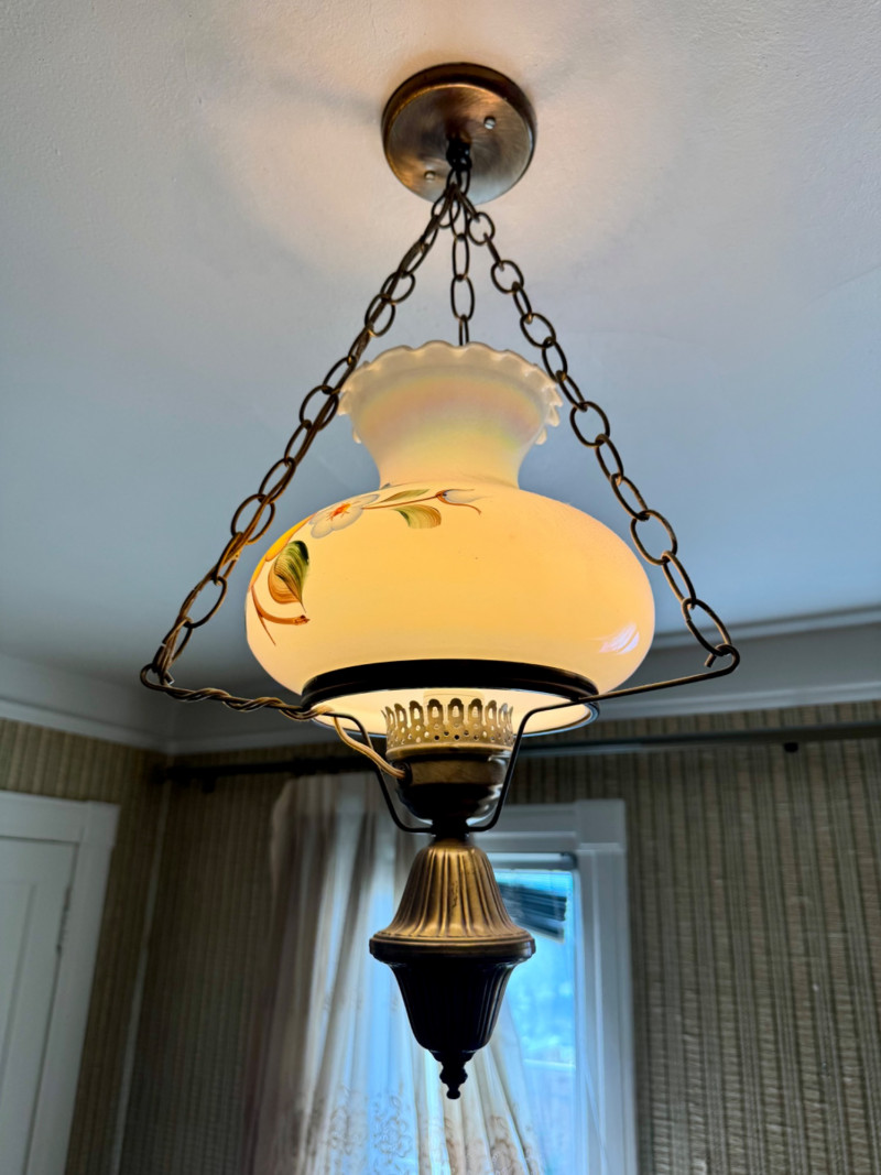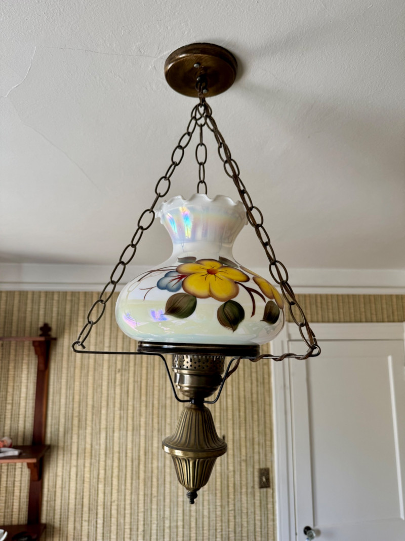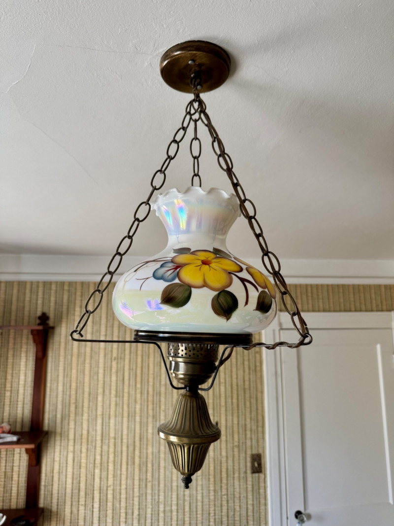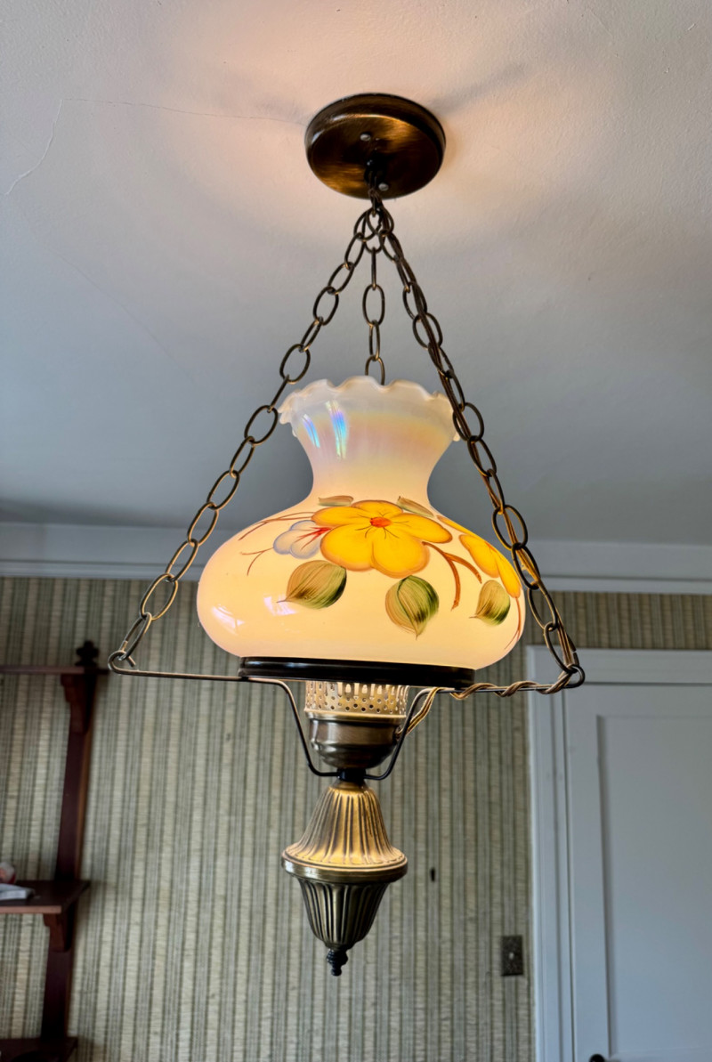 Vintage Hand-Painted Glass Pendant Light – Hardwired Floral Shade. 28” Long Bidding on this lot is an agreement that: (1.) You will have at least 2 capable, able bodied persons to lift and load at a minimum. (2.) You will bring a hand truck and/or any other tools needed to remove this item. If these steps are not followed your item will be forfeit and no refund given.