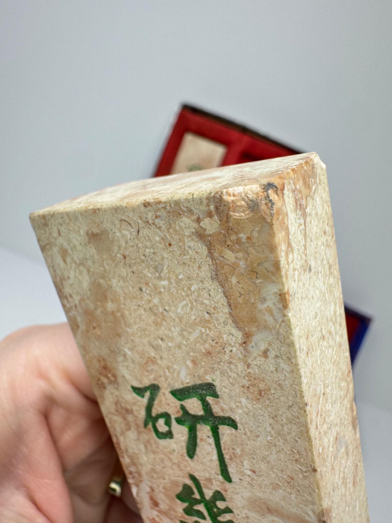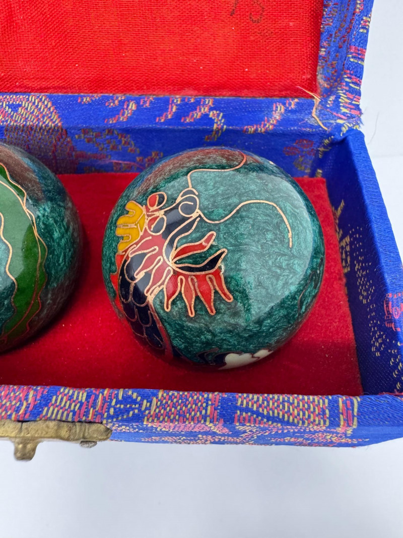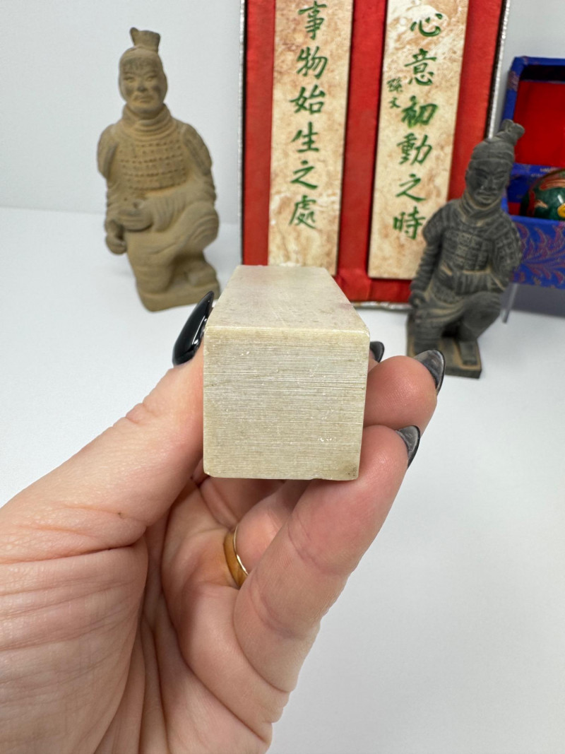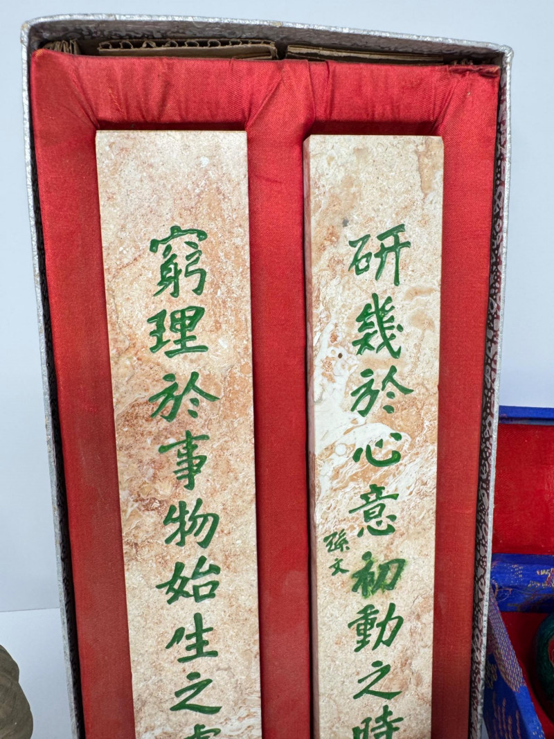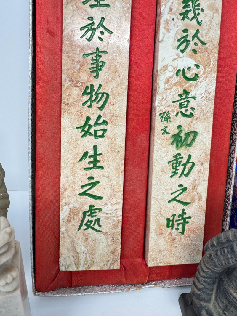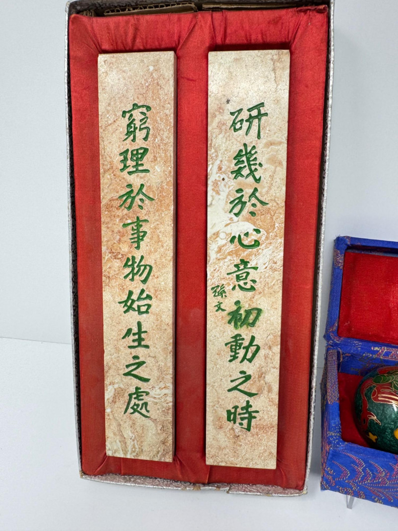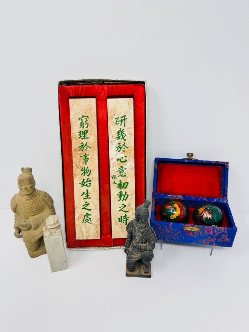 Chinese Decor Lot – Warriors, Baoding Balls & Carved Stone Plaques. Disclaimer: Small chips on corners of calligraphy stones.