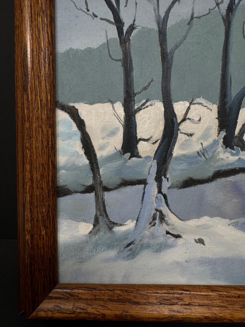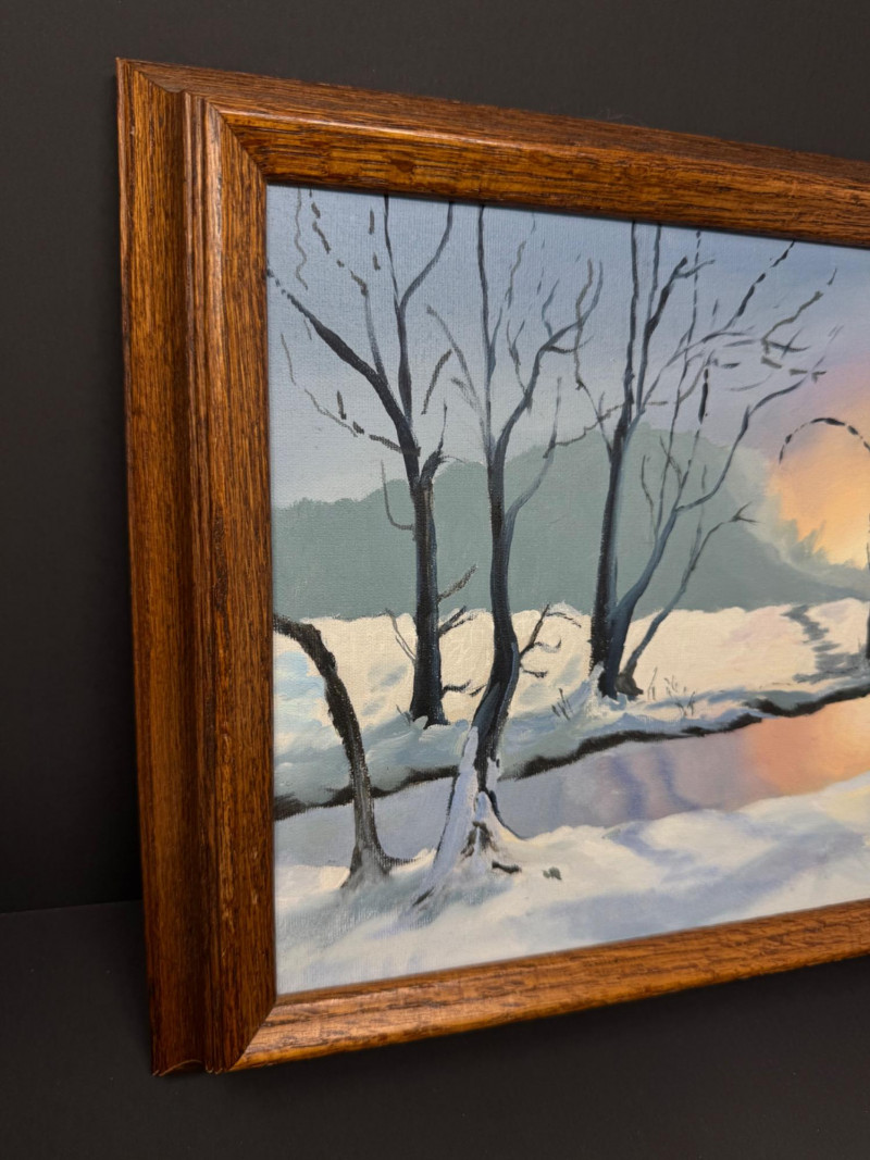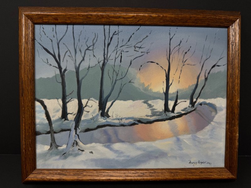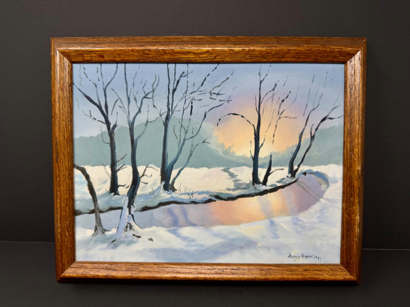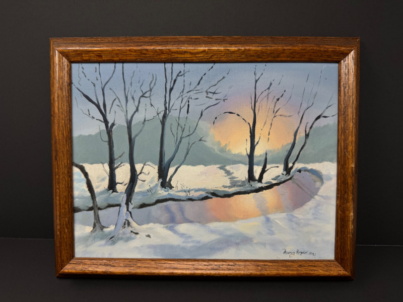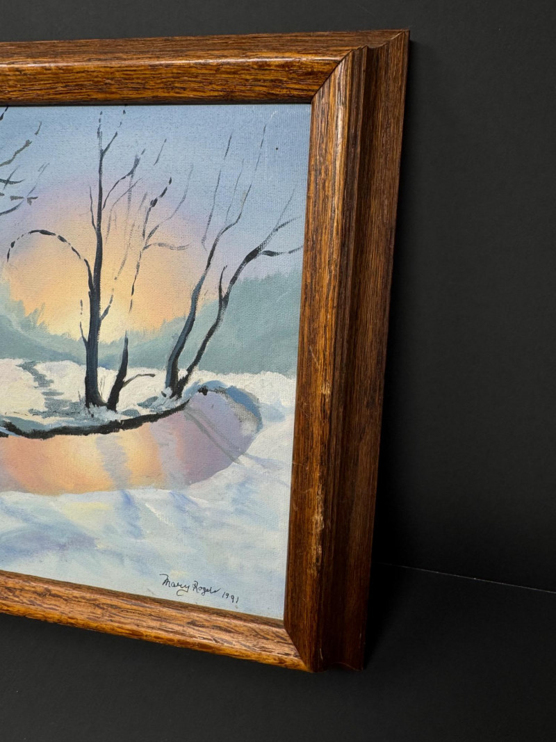 Framed Winter Landscape Painting by Mary Rogers, 1991. 14.5” x 11”