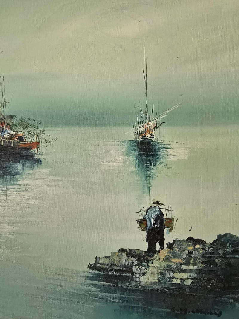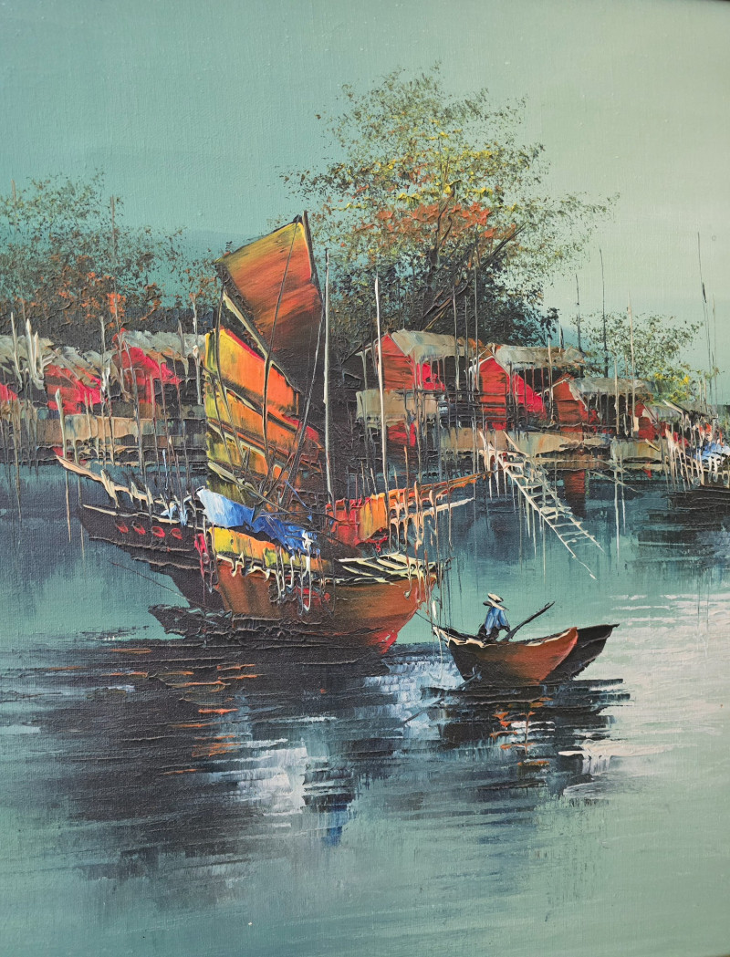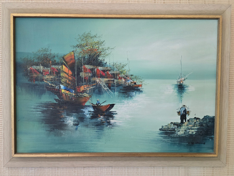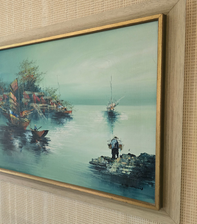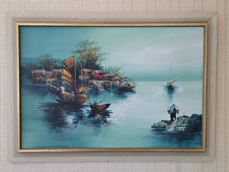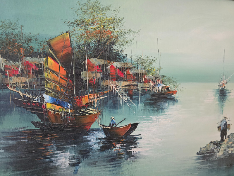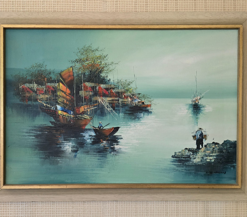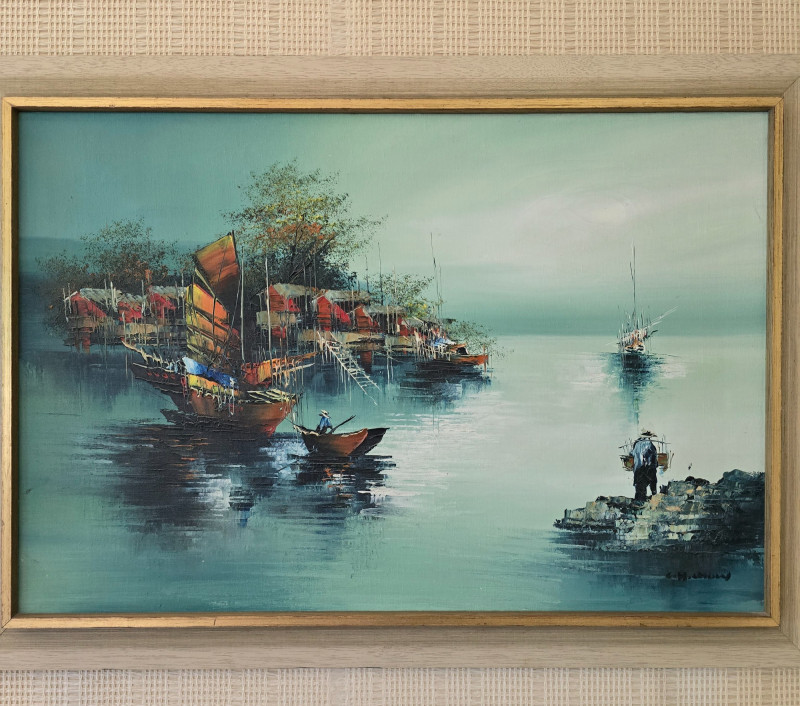 Lot # 60 - Framed Harbor Scene Oil Painting w/ Boats & Figures, Signed by Artist