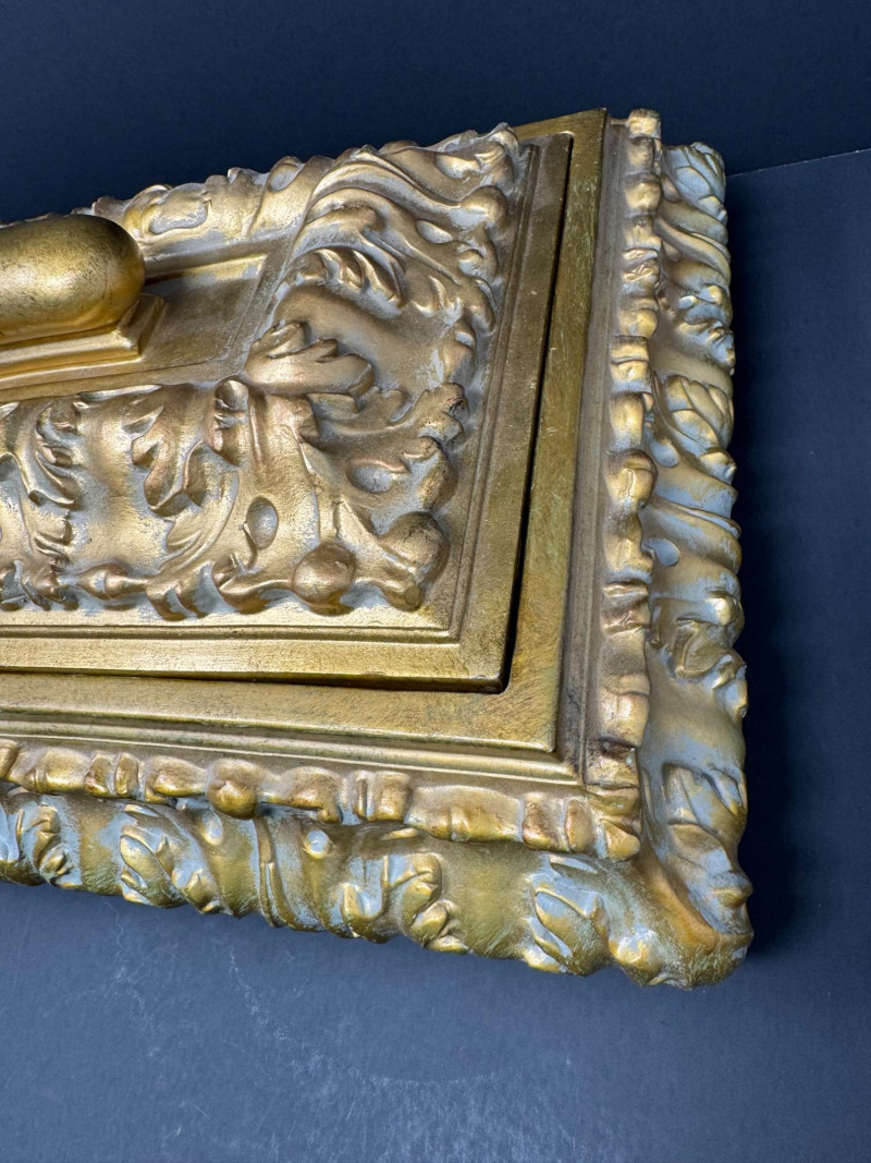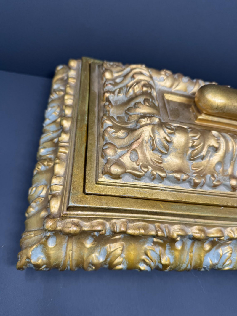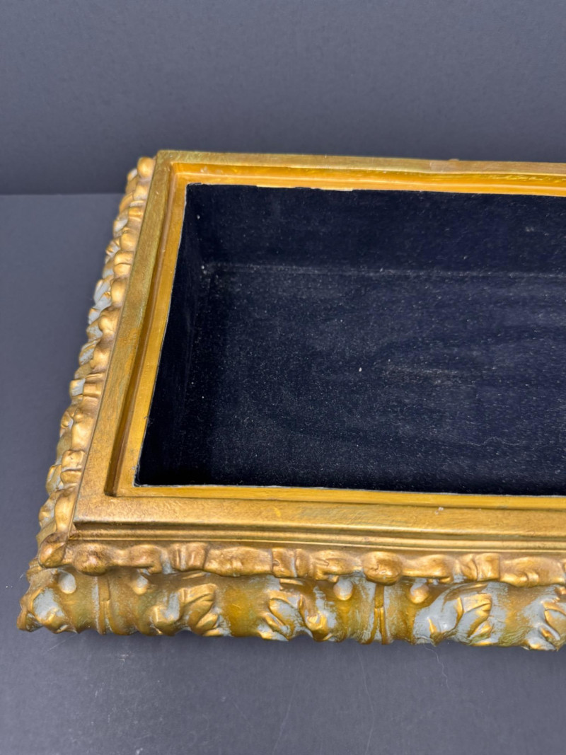 Large Ornate Gold & Velvet Lined Decorative Box w/ Raised Leaf Motif. 15.5” x 11”