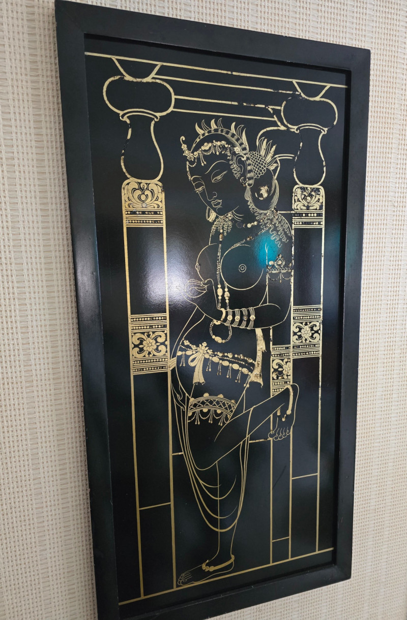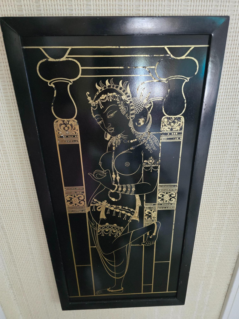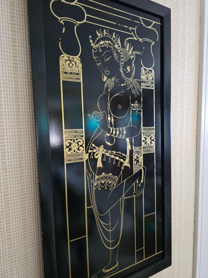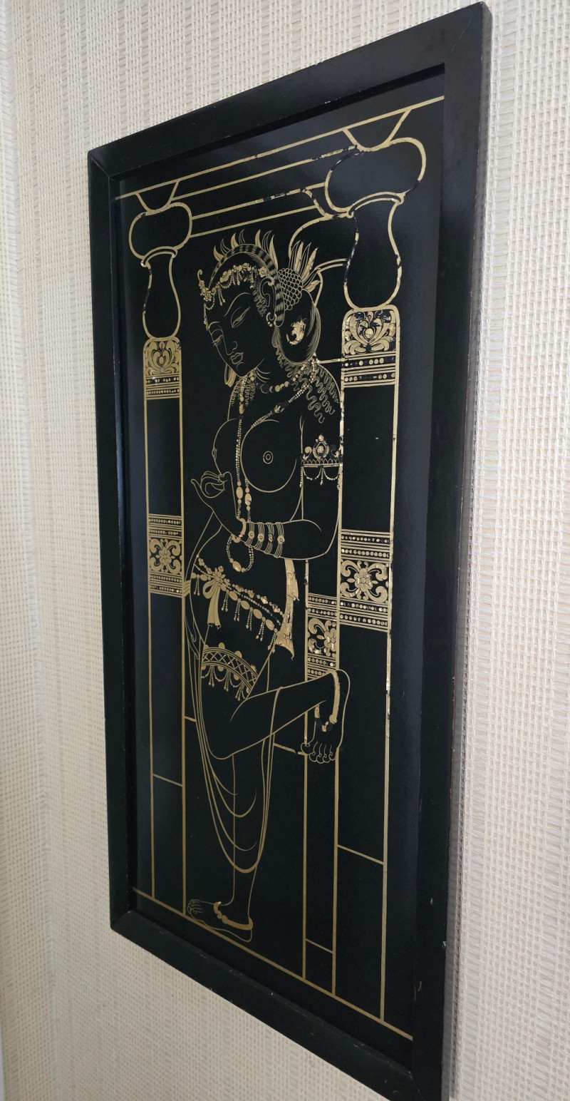 Gilded Apsara Dancer on Black Lacquer Panel – Thai Temple Style. 36" x 18" Slight flaking on the gold paint as pictured