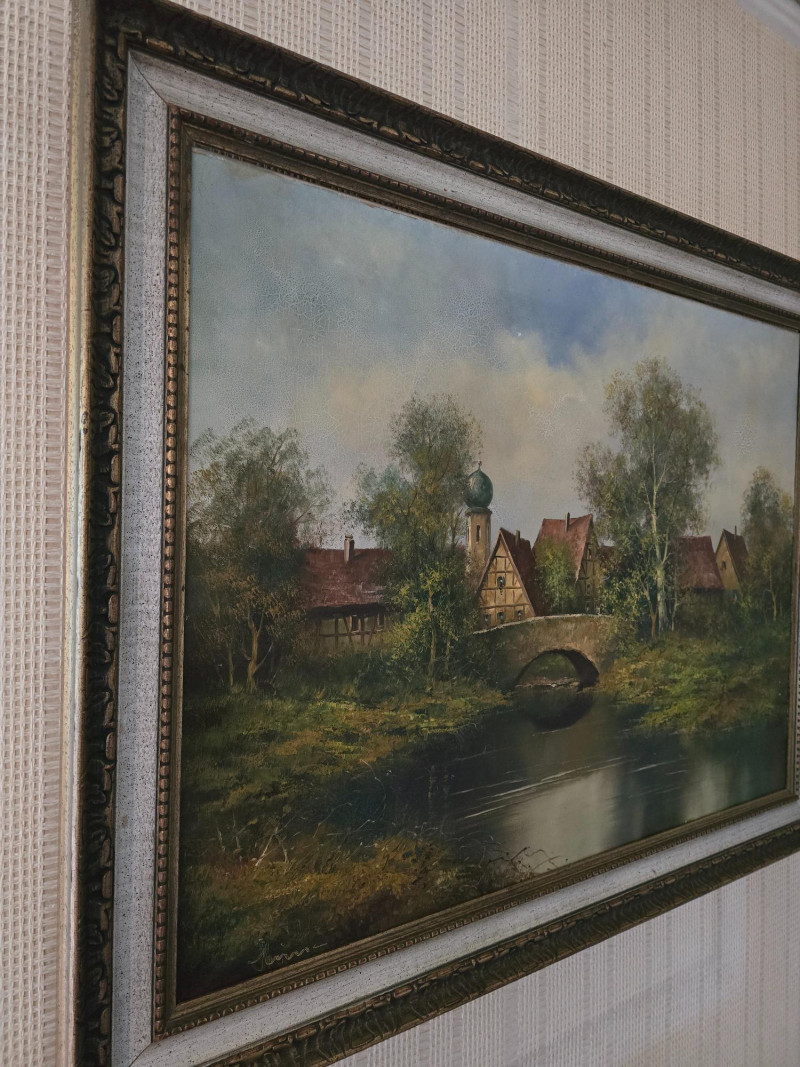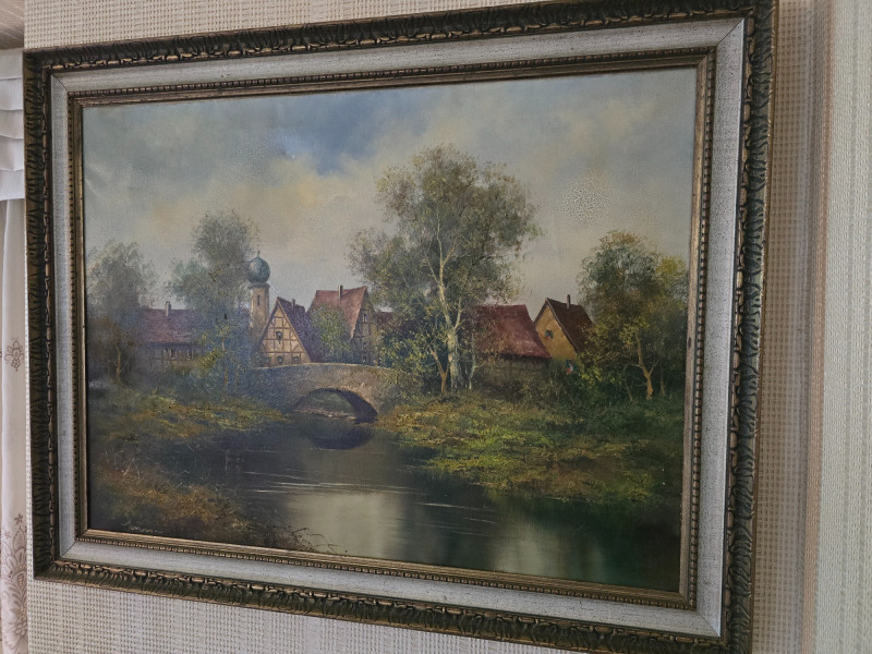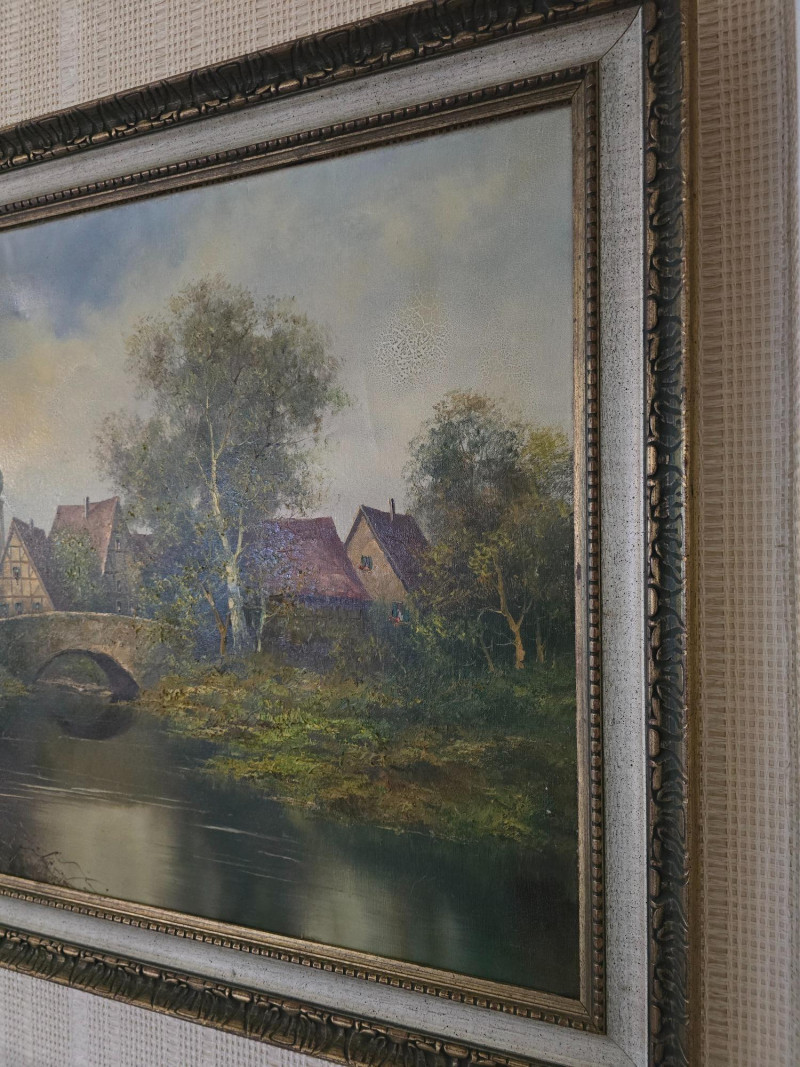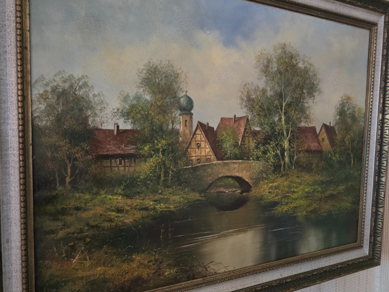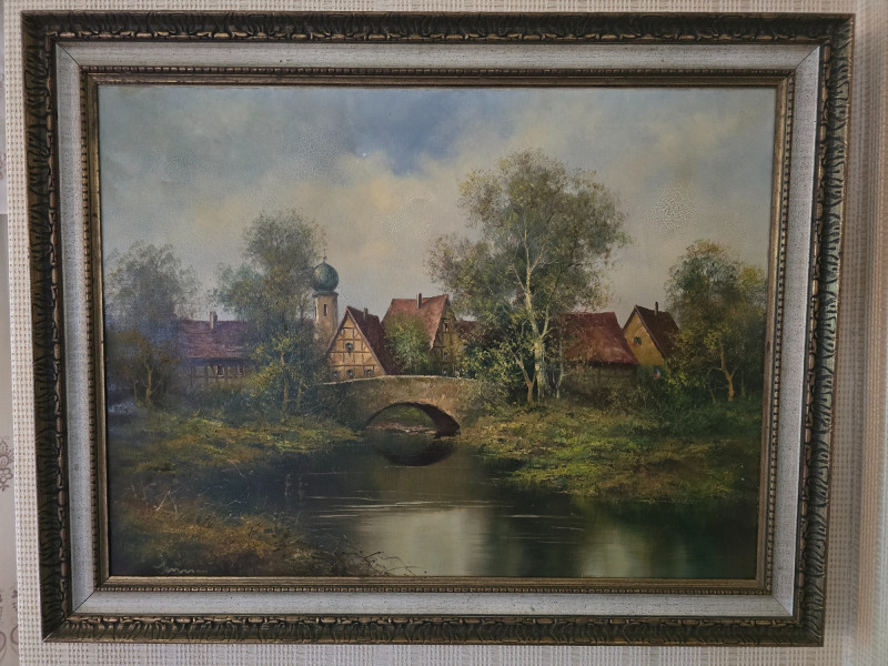 Vintage Framed European Village Landscape Oil Painting on Canvas. 37" x 29"