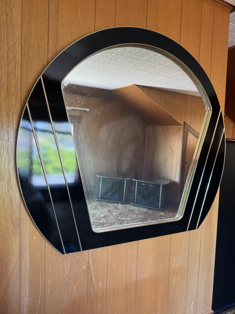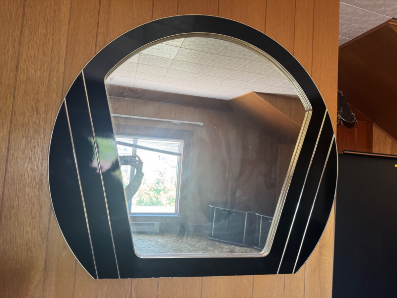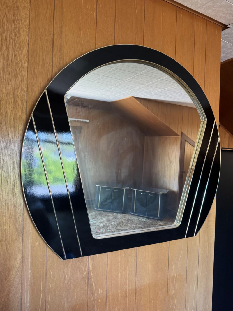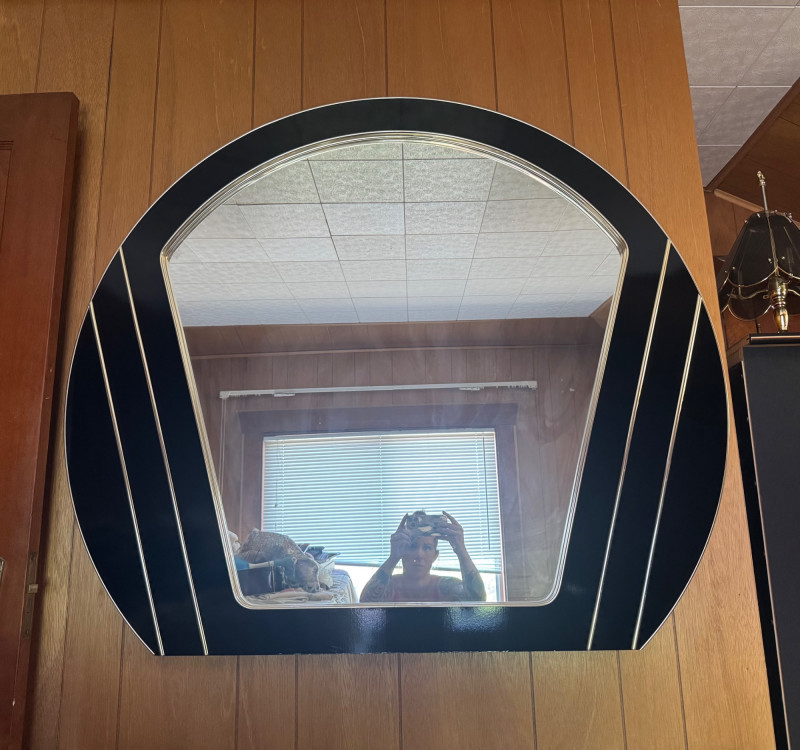 Vintage Style Fan-Shaped Wall Mirror w/ Black & Gold Geometric Frame. 47.5” Wide 41” Tall Bidding on this lot is an agreement that: (1.) You will have at least 2 capable, able bodied persons to lift and load at a minimum. (2.) You will bring a hand truck and/or any other tools needed to remove this item. If these steps are not followed your item will be forfeit and no refund given.