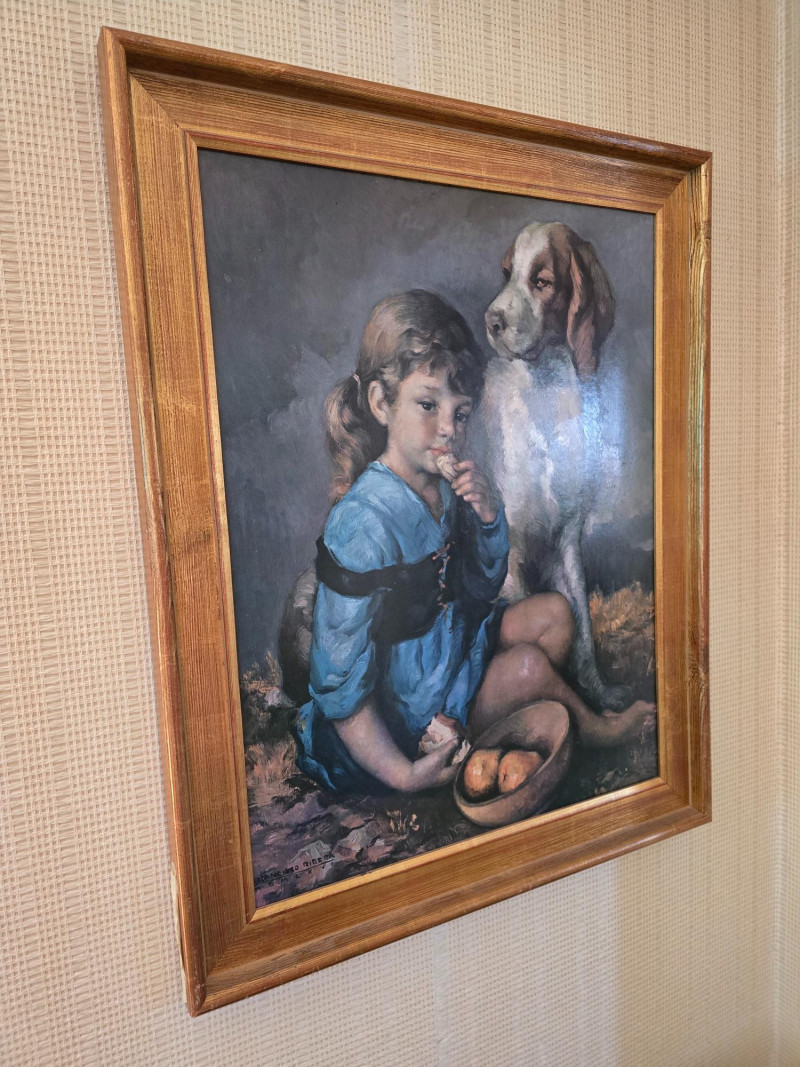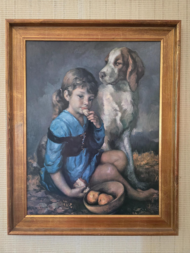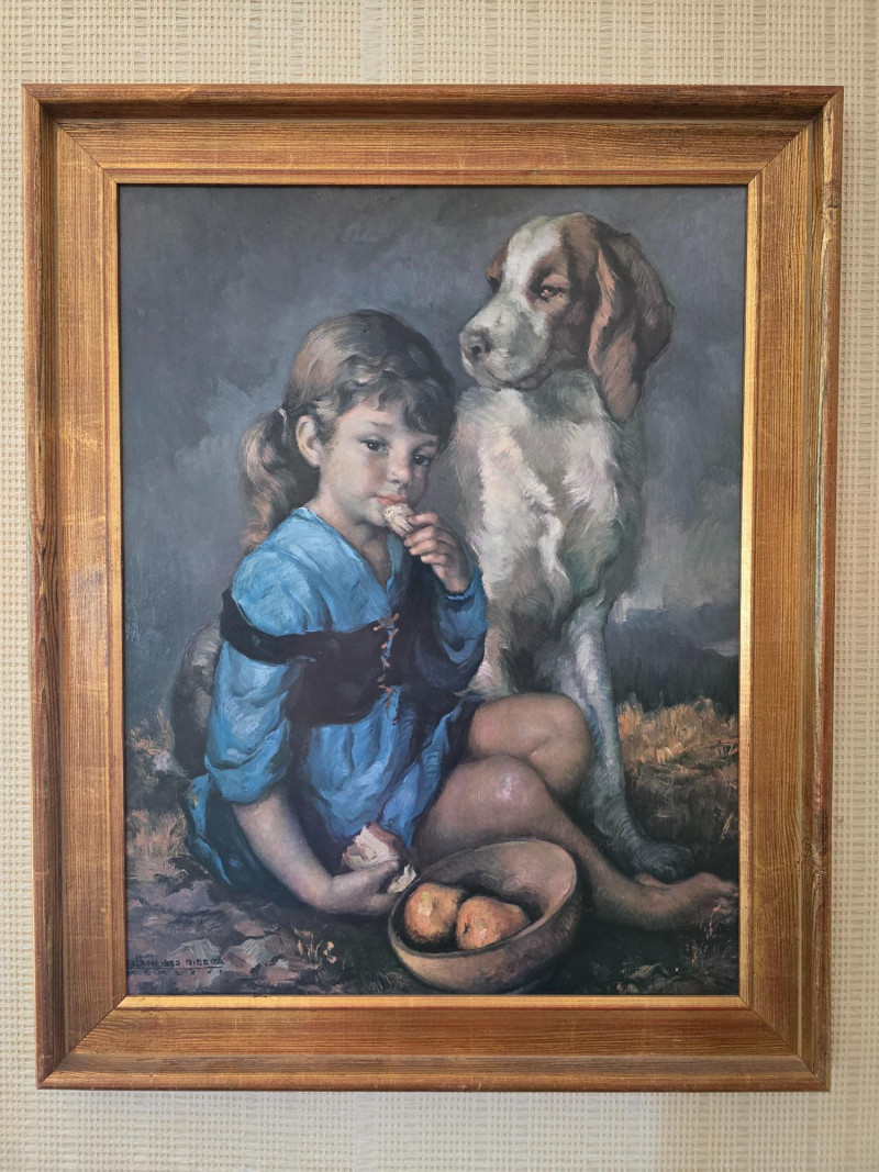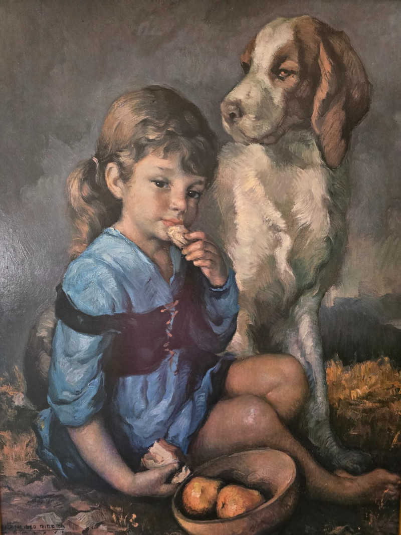 Signed Print by Francisco Ribera, Spanish artist, Child w/ Dog. 34" x 27"