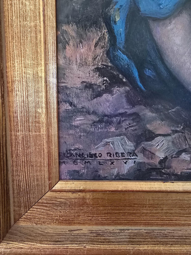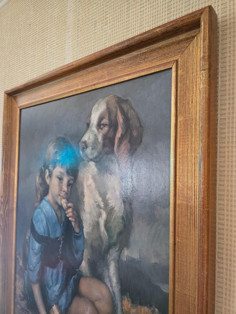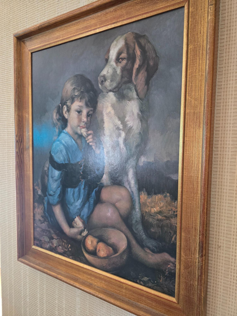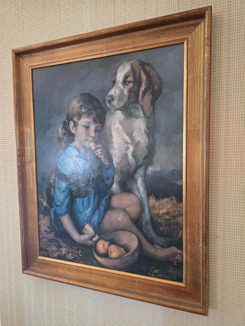 Signed Print by Francisco Ribera, Spanish artist, Child w/ Dog. 34" x 27"