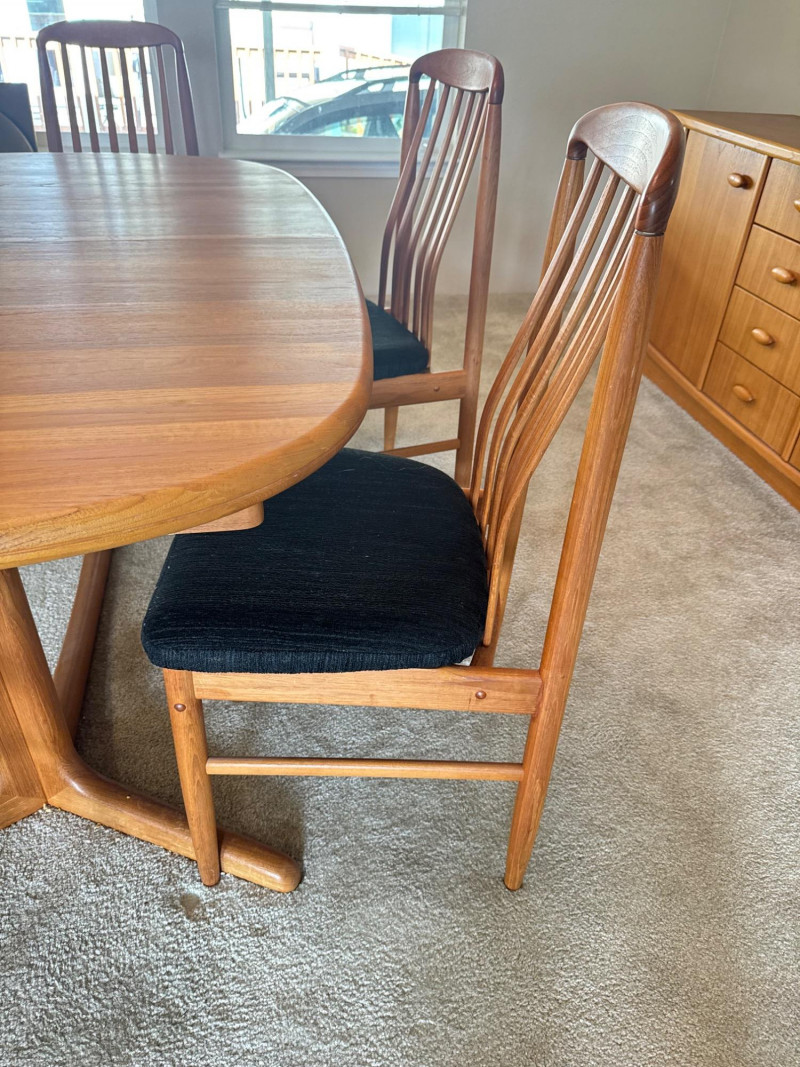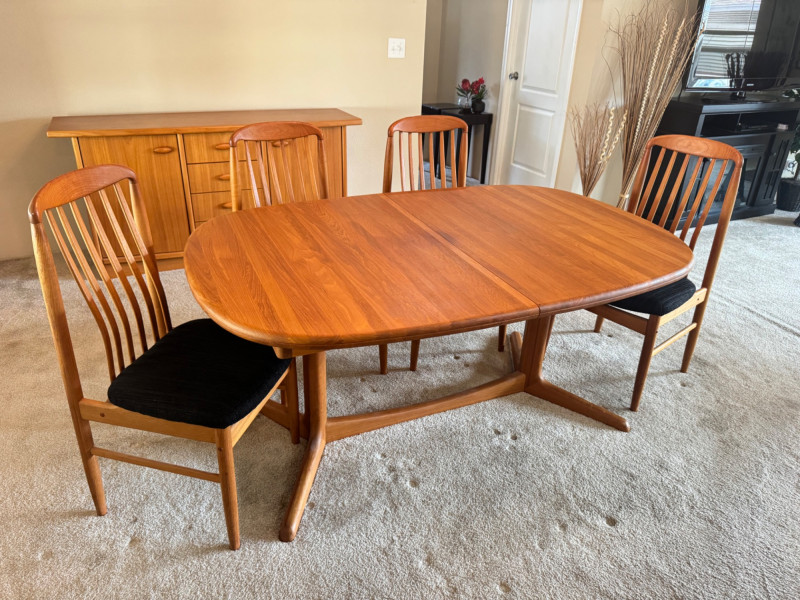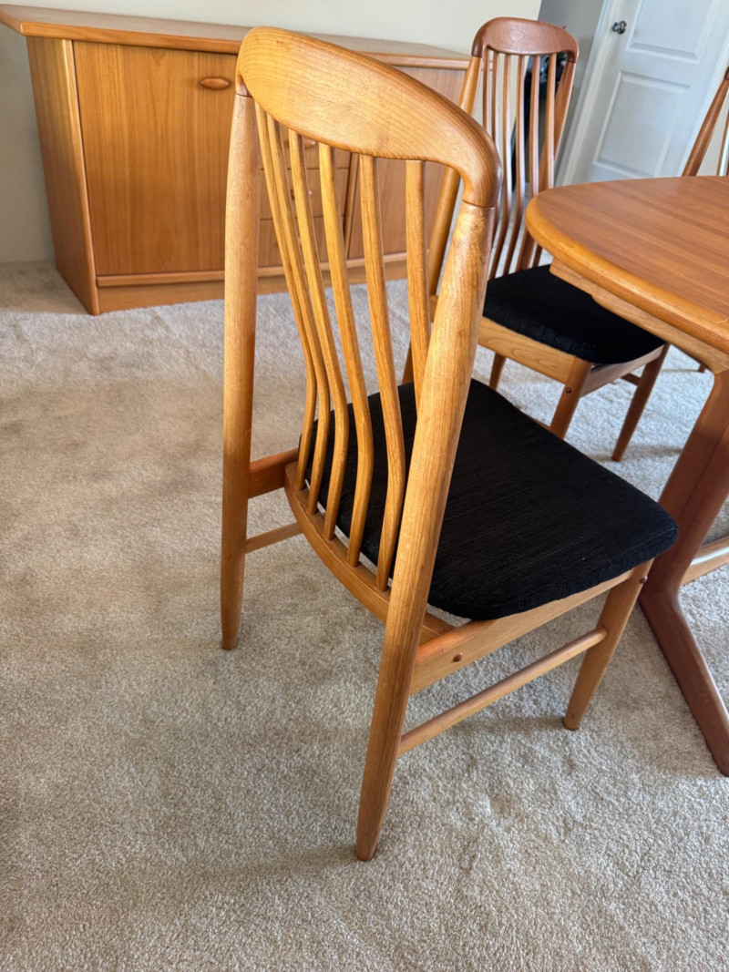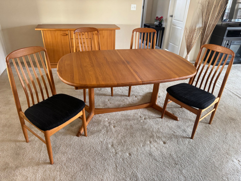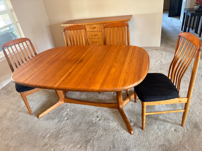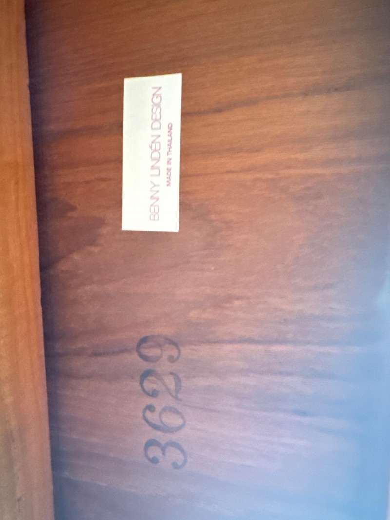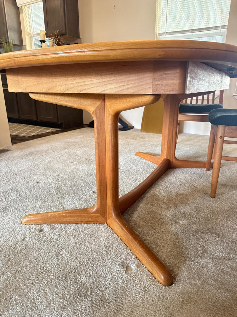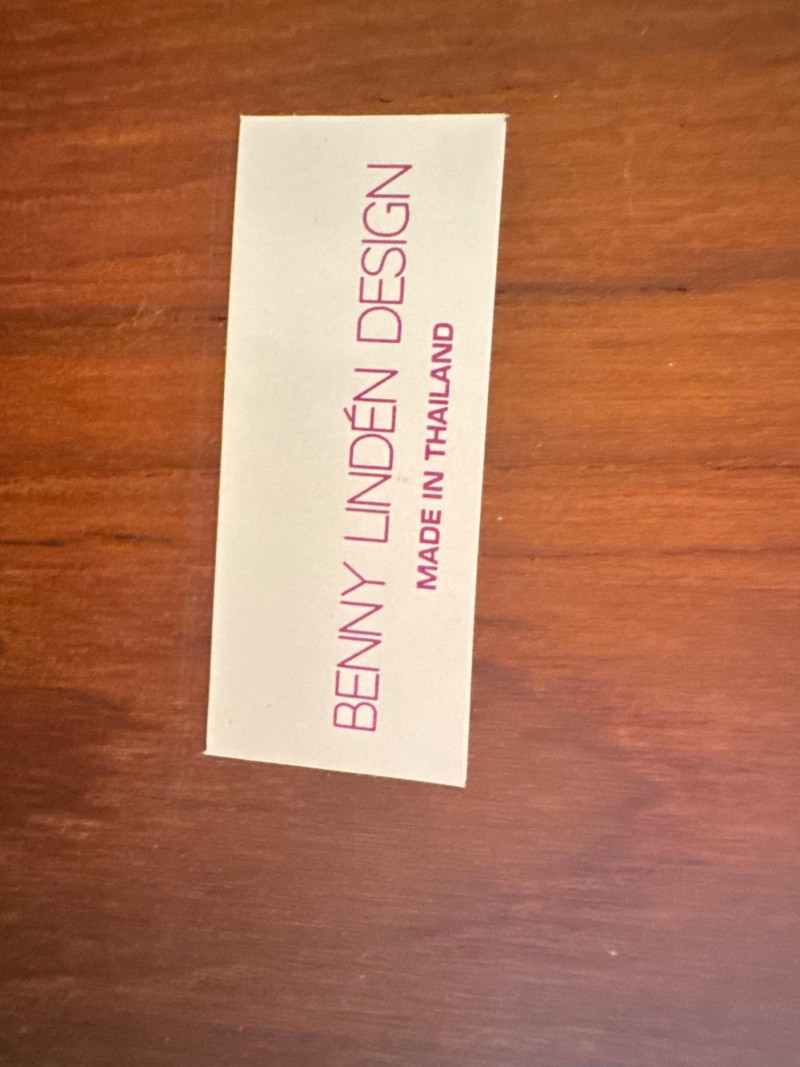 Mid-Century Benny Lindén Teak Dining Set w/ Pull-Out Extension Leaves. 41” Across 62” Long 28” Tall Built-in slide-out extension leaves. Made in Thailand. Condition: