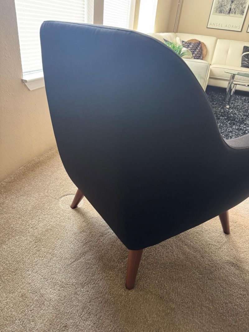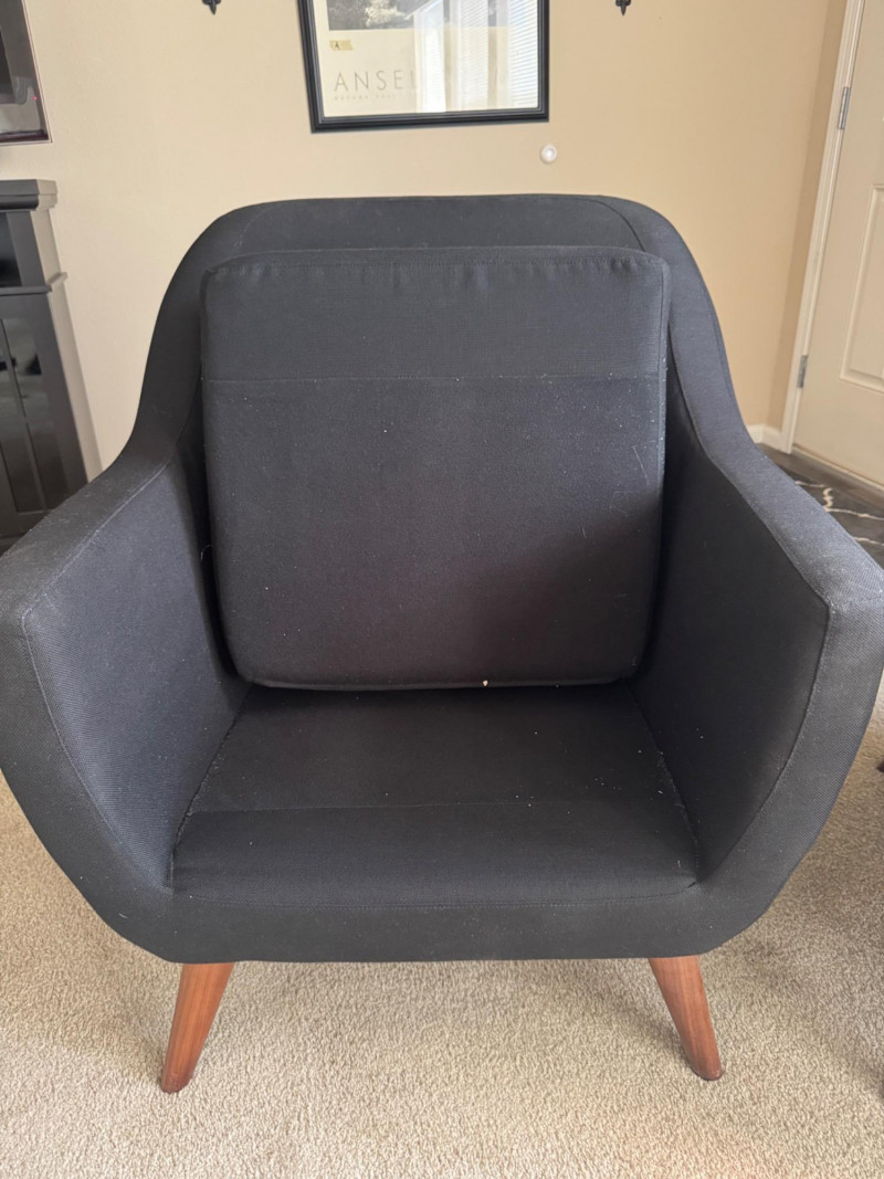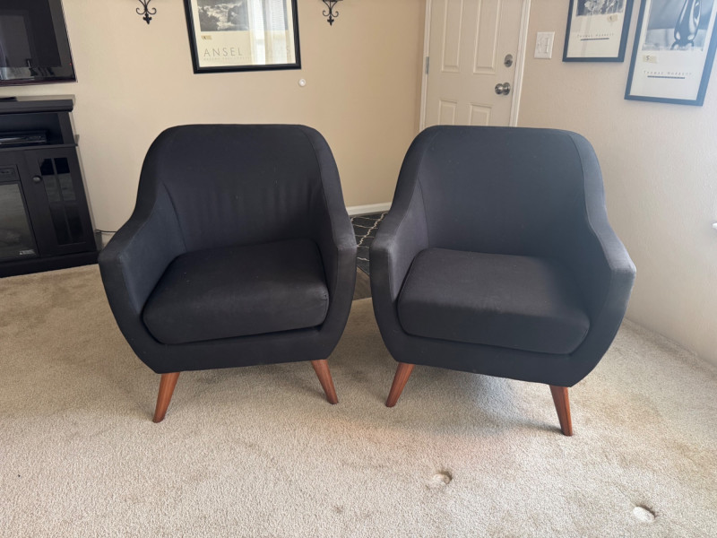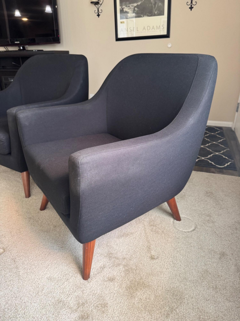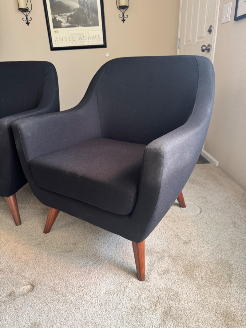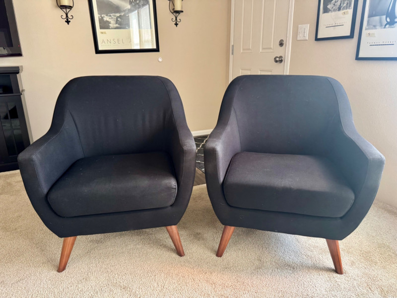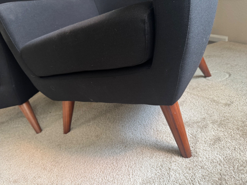 Pair of MCM-Style Black Lounge Chairs – 28.5” Wide, Tapered Wood Legs. Dimensions (each chair): Width: 28.5” Depth: 28” Seat height: 16” Back height: 33”