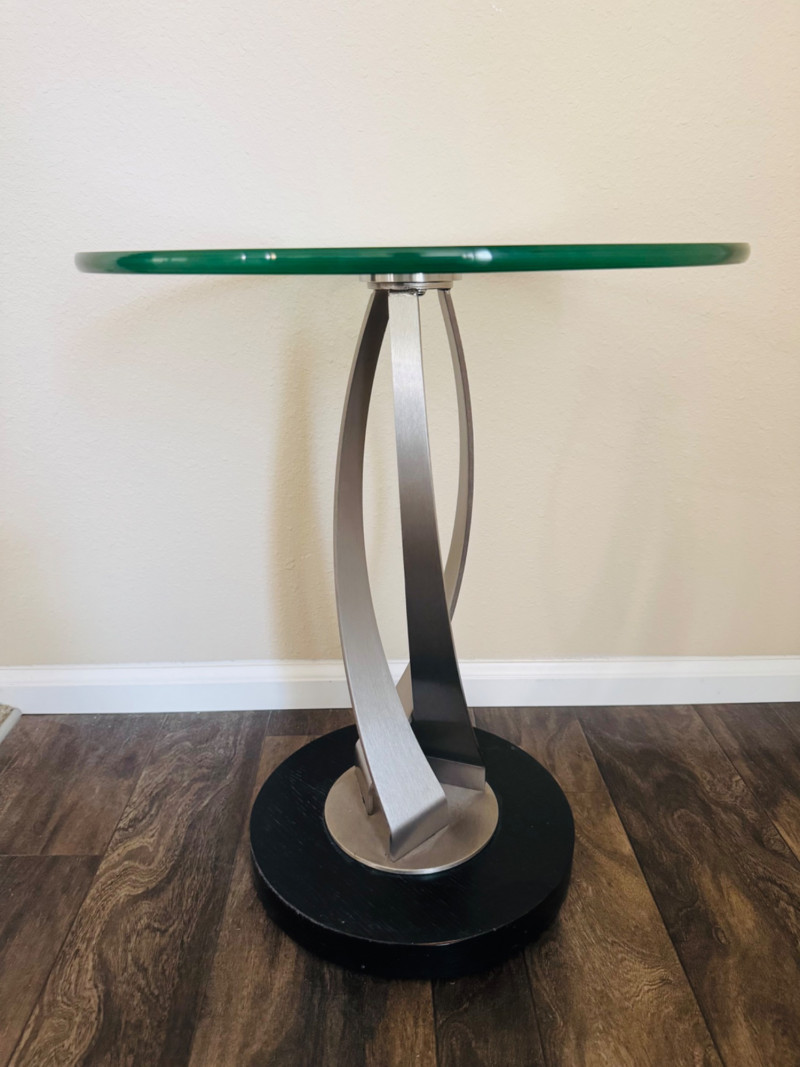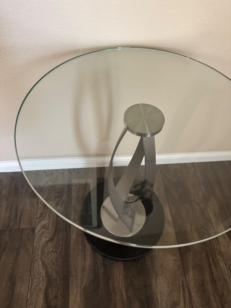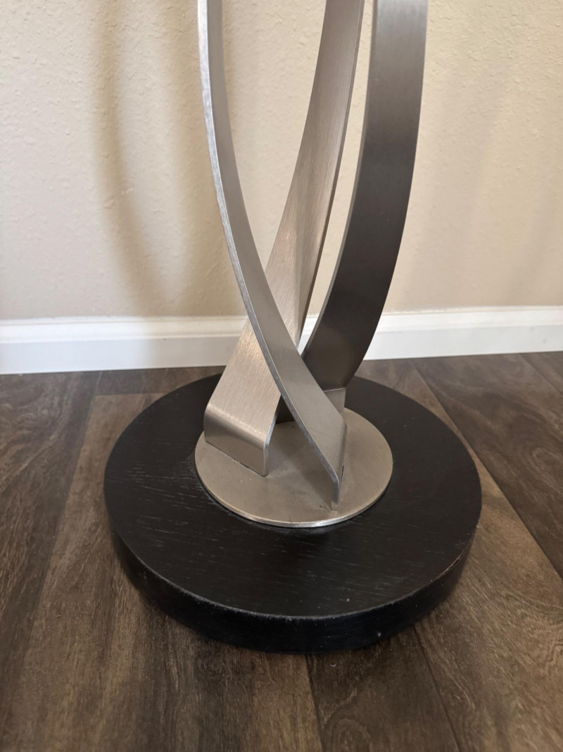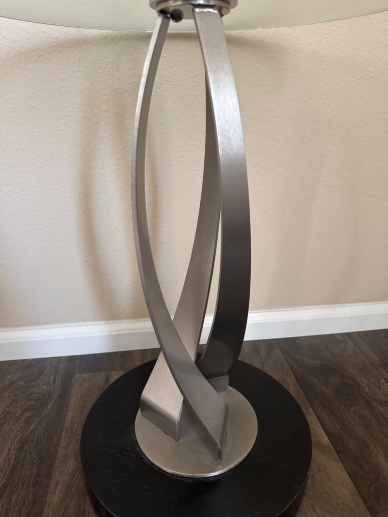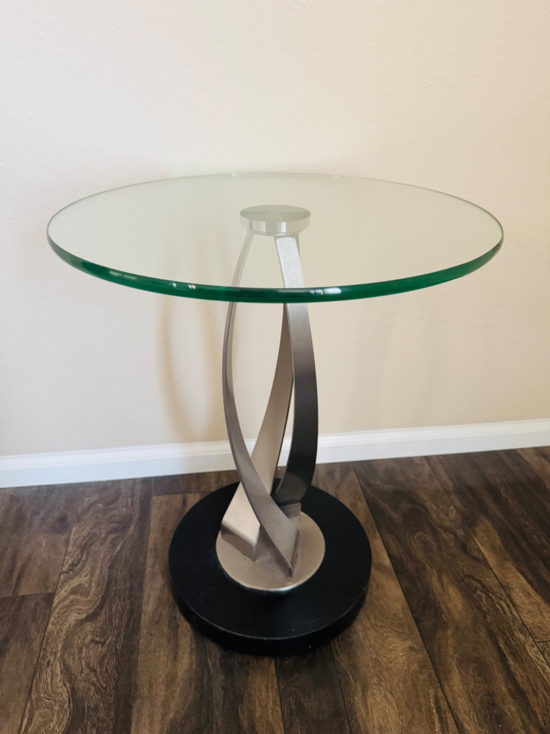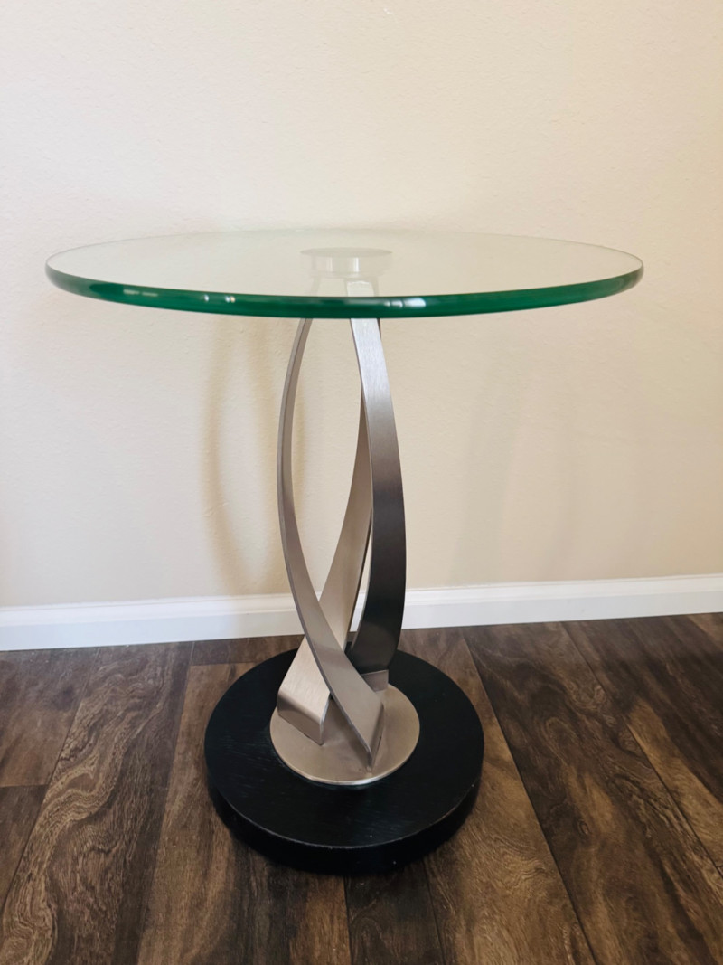 Modern Glass Side Table – Twisted Metal Base, Gigi Style Design. 18” Diameter 22.5” Tall This piece closely resembles the Elite Modern Gigi End Table in design, though it is unbranded. Bidding on this lot is an agreement that: (1.) You will have at least 2 capable, able bodied persons to lift and load at a minimum. (2.) You will bring a hand truck and/or any other tools needed to remove this item. If these steps are not followed your item will be forfeit and no refund given.