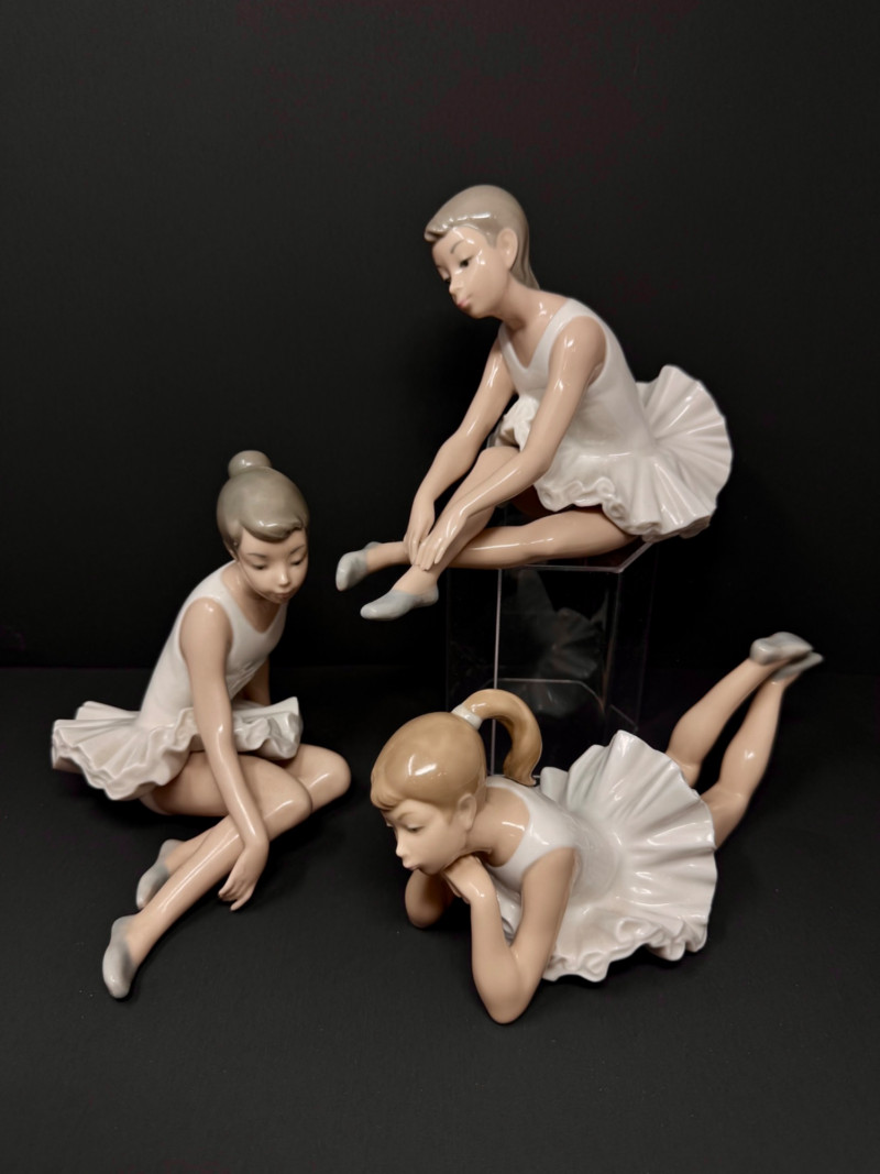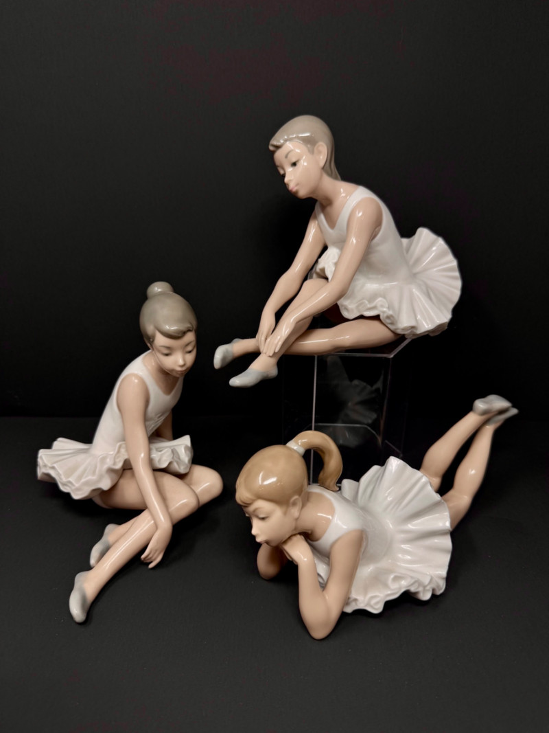 Set of 3 NAO by Lladro Porcelain Ballerina Figurines – Spain. 7-9” The laying ballerina’s head completely broke off, but can be repaired and looks as though it would be hard to notice once repaired.