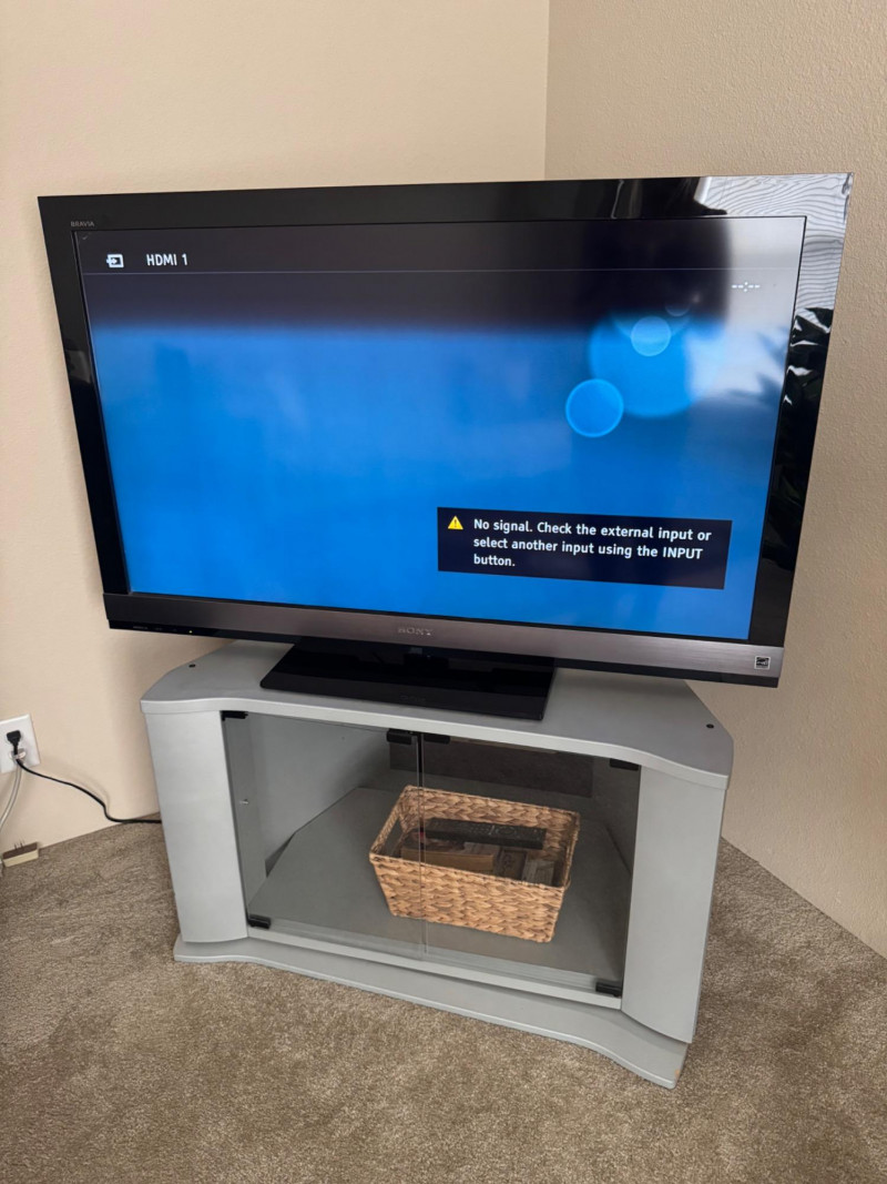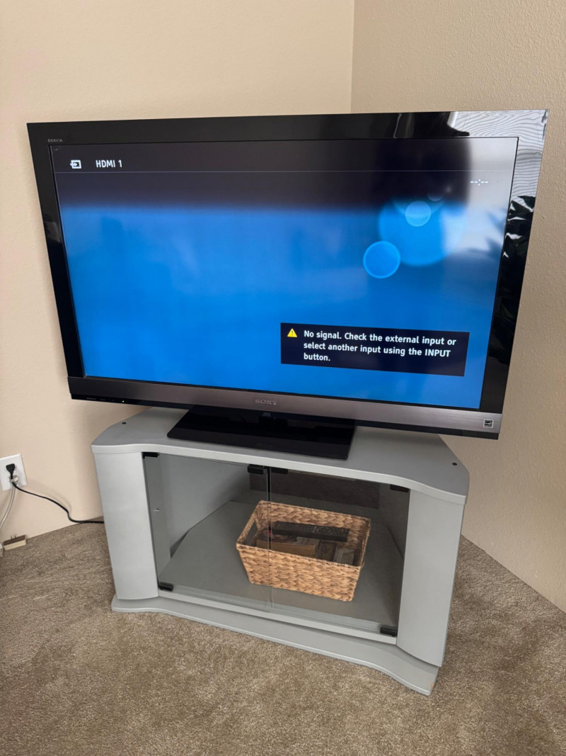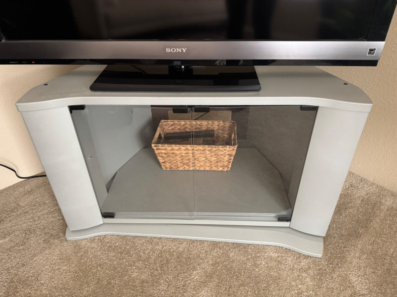 Sony Bravia 46” LCD TV + Swiveling Glass Door TV Stand & Basket. Swiveling TV Stand - 35” Wide 21” Deep 21” Tall Bidding on this lot is an agreement that: (1.) You will have at least 2 capable, able bodied persons to lift and load at a minimum. (2.) You will bring a hand truck and/or any other tools needed to remove this item. If these steps are not followed your item will be forfeit and no refund given.