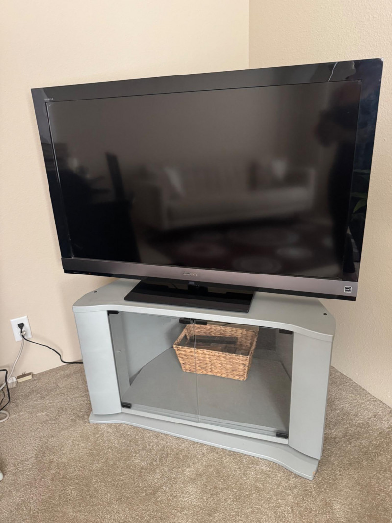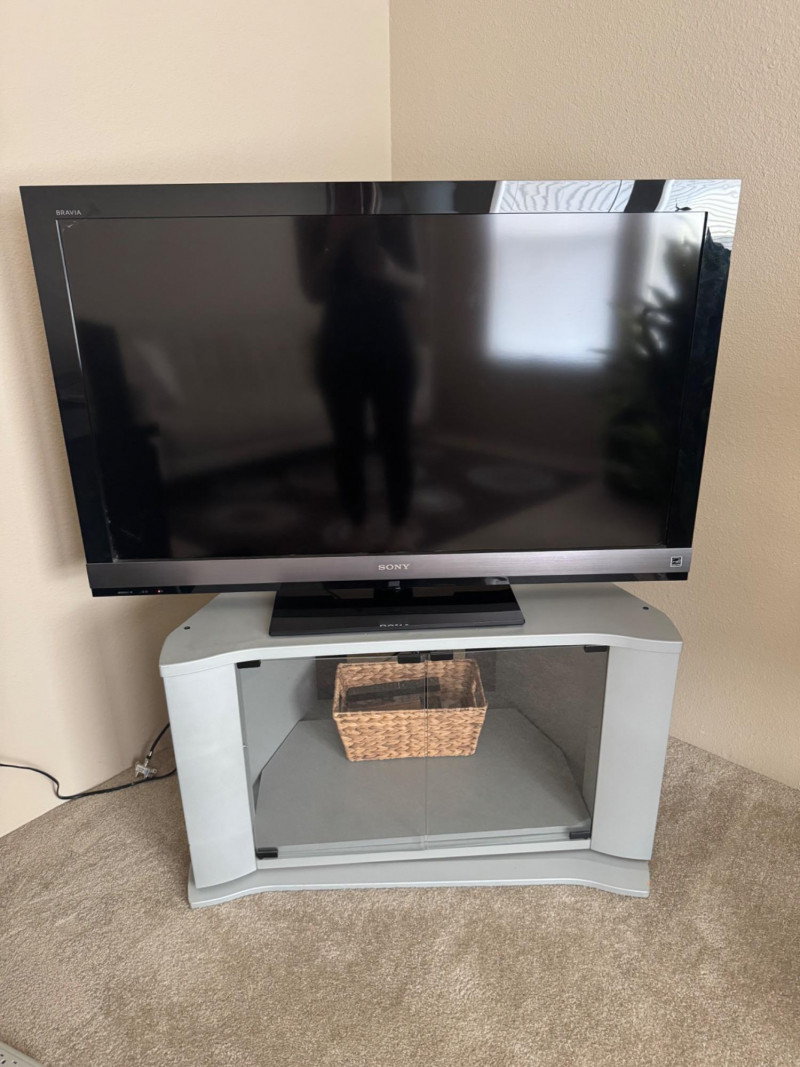 Lot # 25 - Sony Bravia 46” LCD TV + Swiveling Glass Door TV Stand & Basket