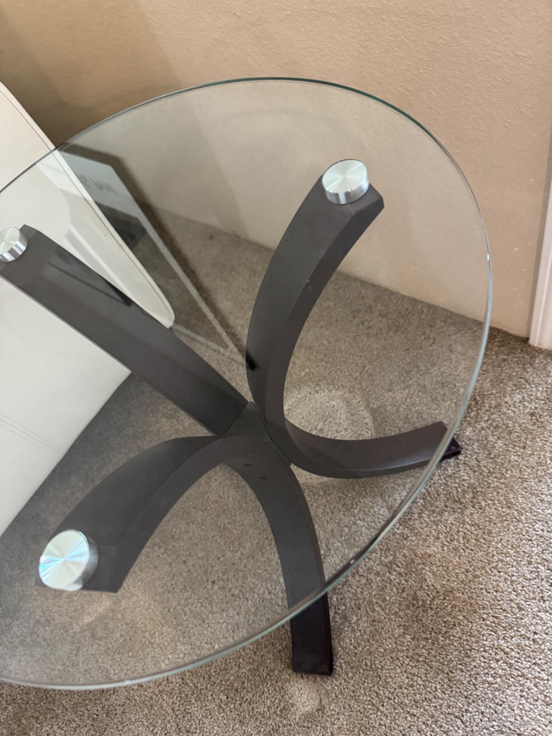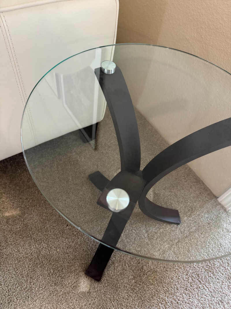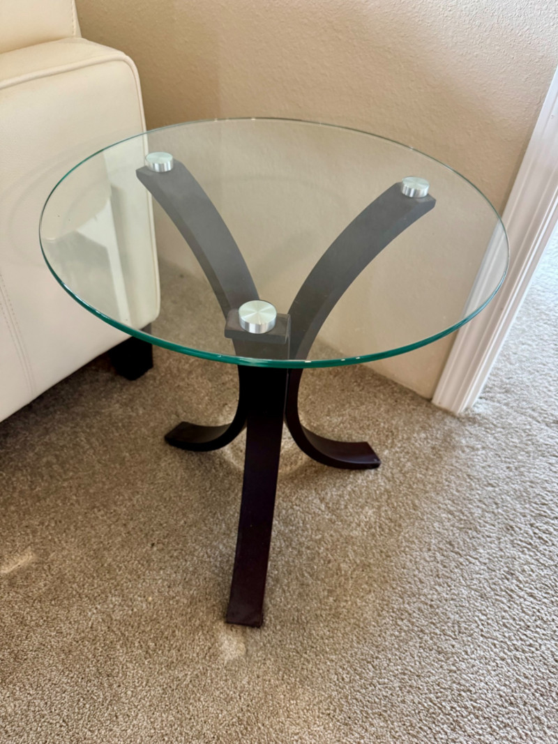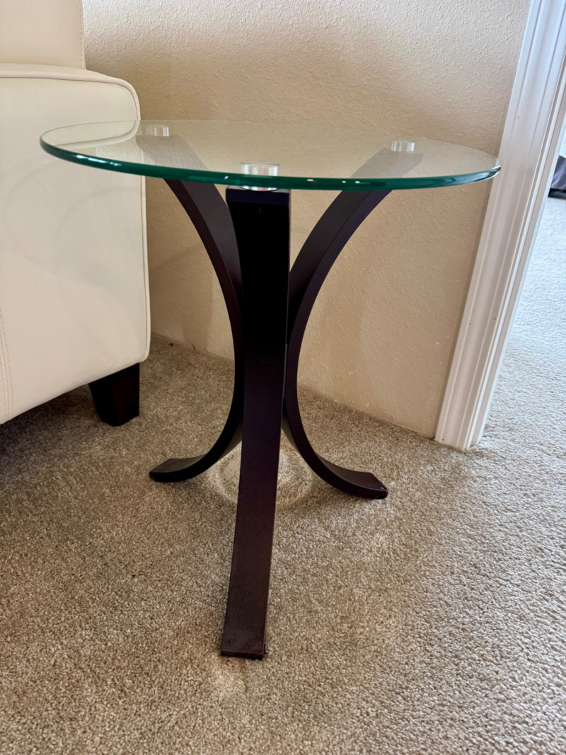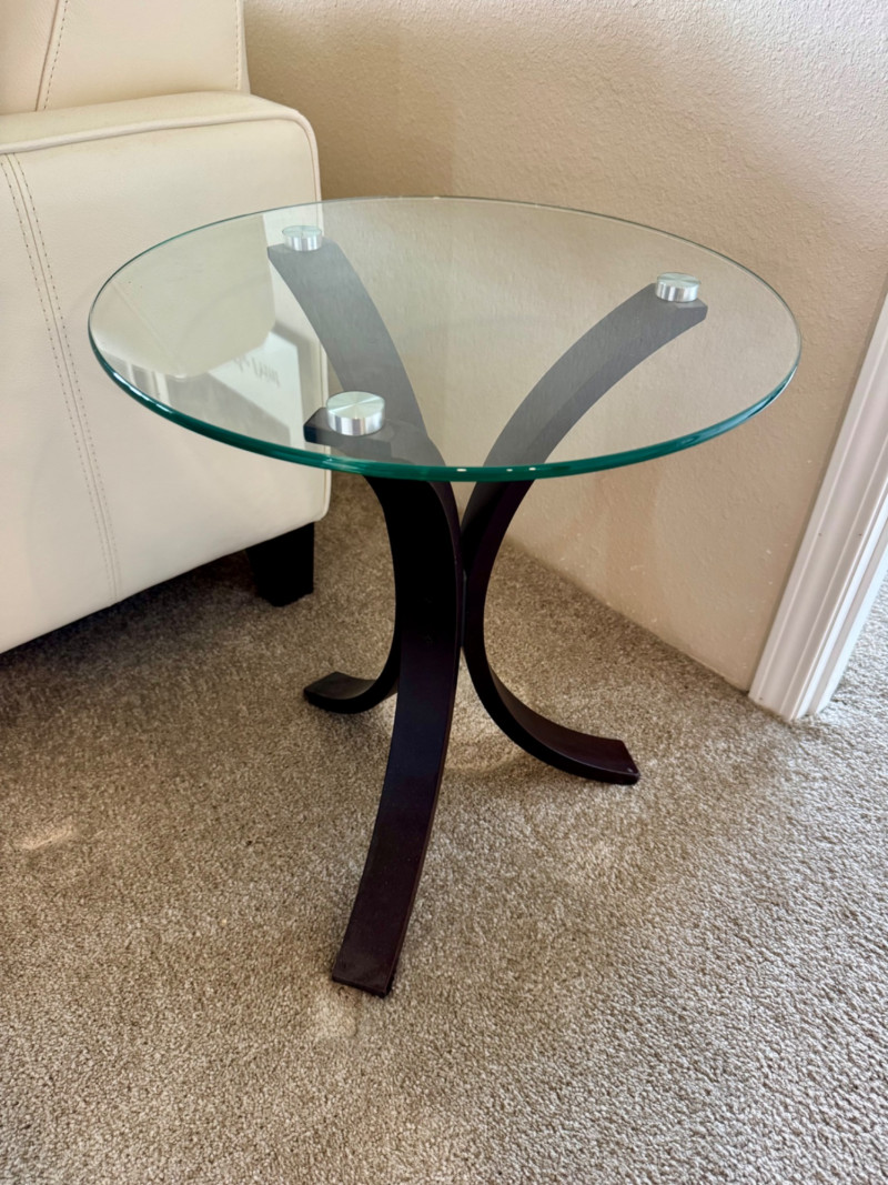 Round Glass Side Table w/ Curved Espresso Bentwood Base. 17.5” Diameter 21” Tall Bidding on this lot is an agreement that: (1.) You will have at least 2 capable, able bodied persons to lift and load at a minimum. (2.) You will bring a hand truck and/or any other tools needed to remove this item. If these steps are not followed your item will be forfeit and no refund given.
