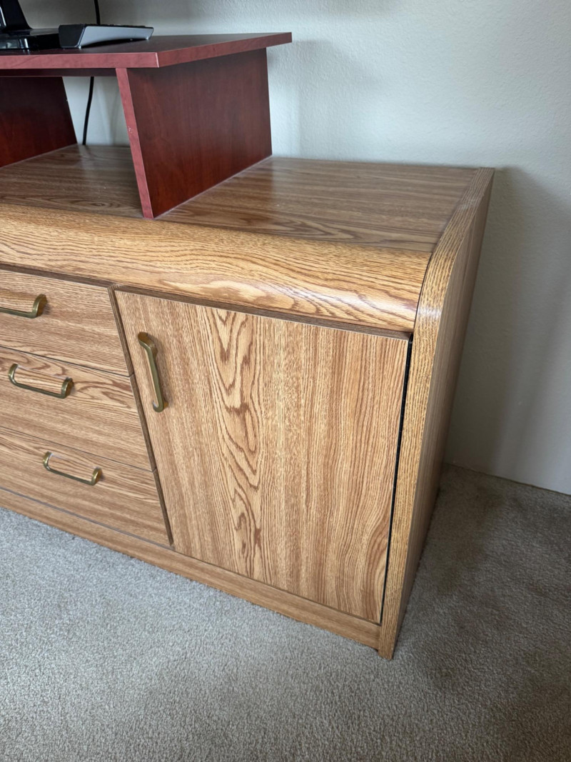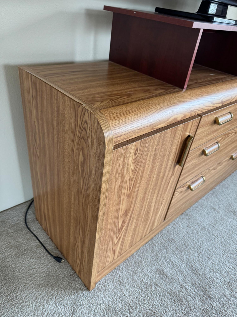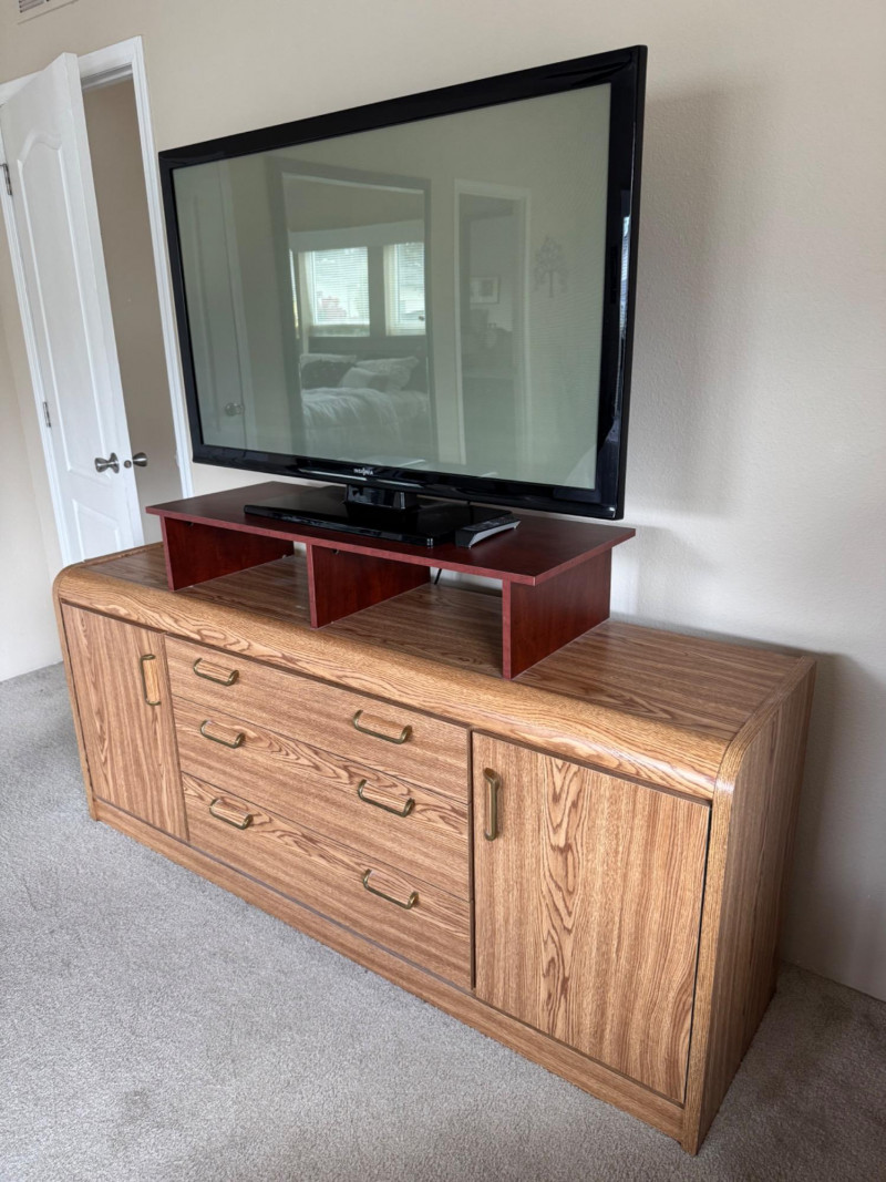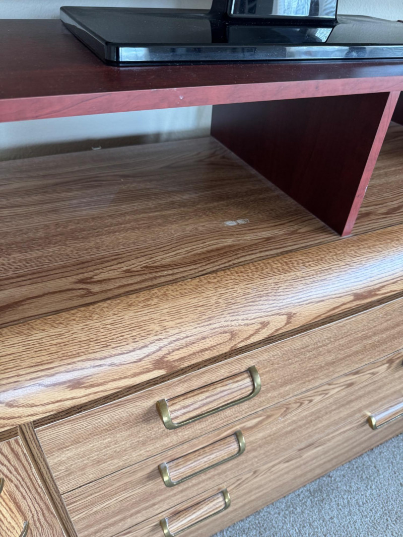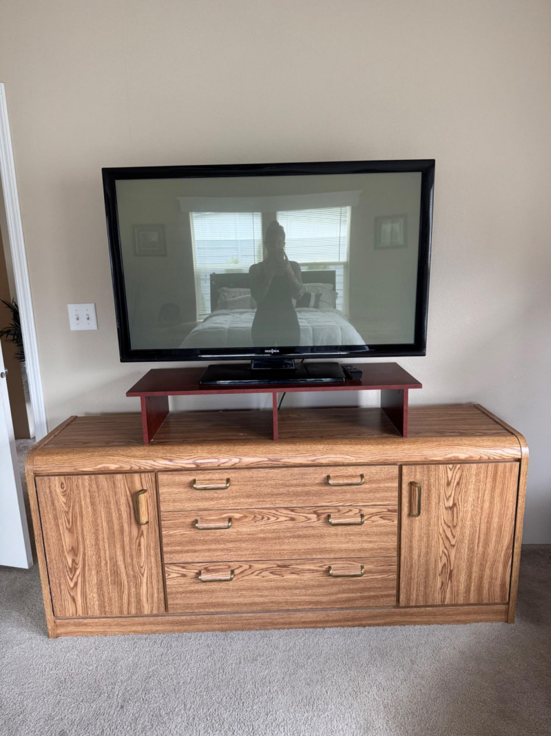 Dresser shows visible wear on the surface (see photos). TV powers on and functions. Must take all 3 items as a set. Bidding on this lot is an agreement that: (1.) You will have at least 2 capable, able bodied persons to lift and load at a minimum. (2.) You will bring a hand truck and/or any other tools needed to remove this item. If these steps are not followed your item will be forfeit and no refund given.