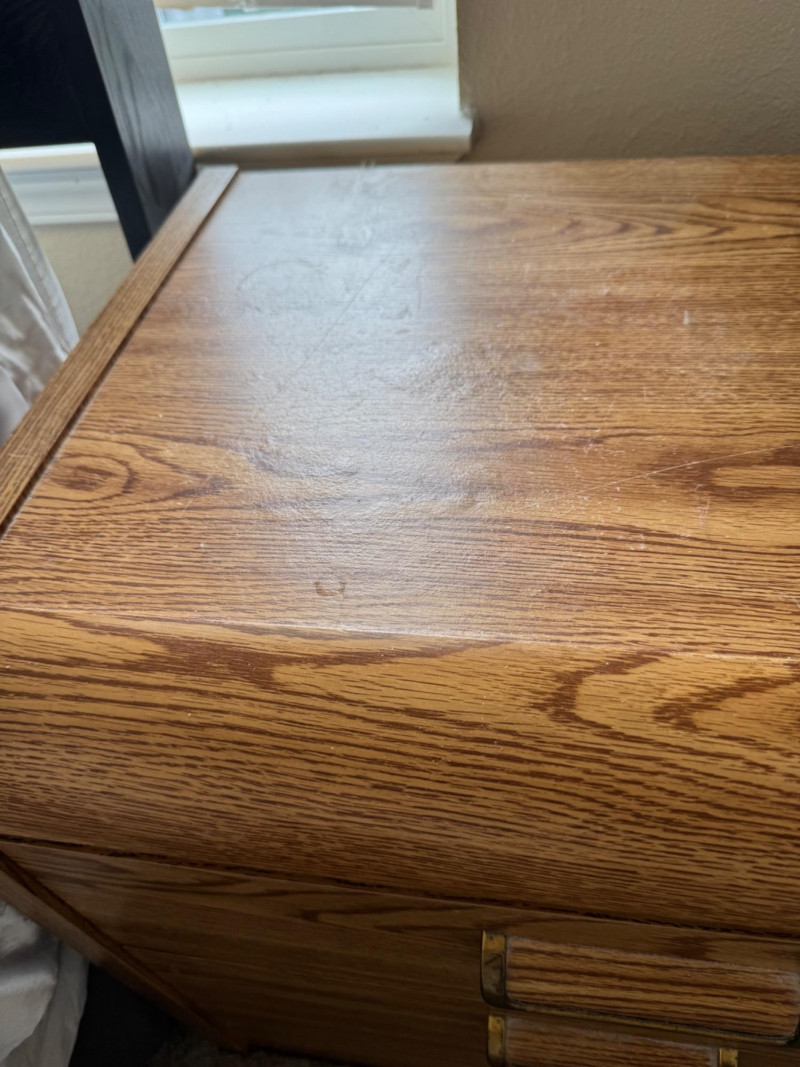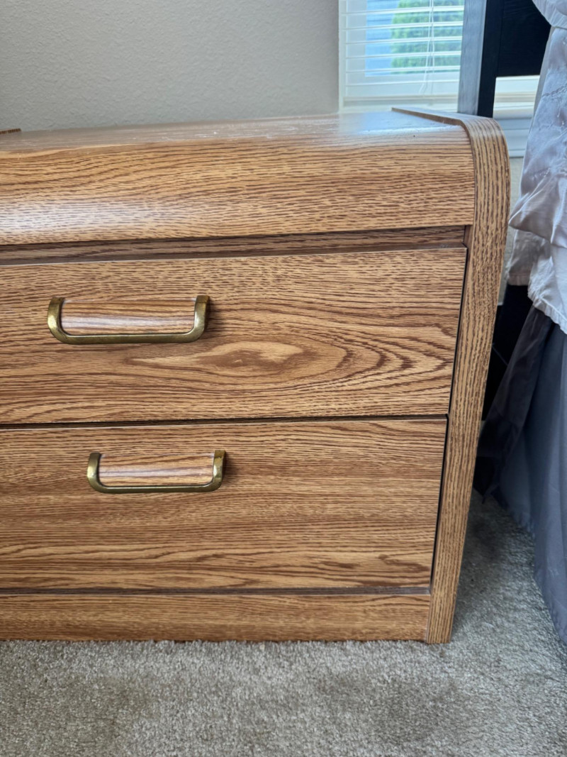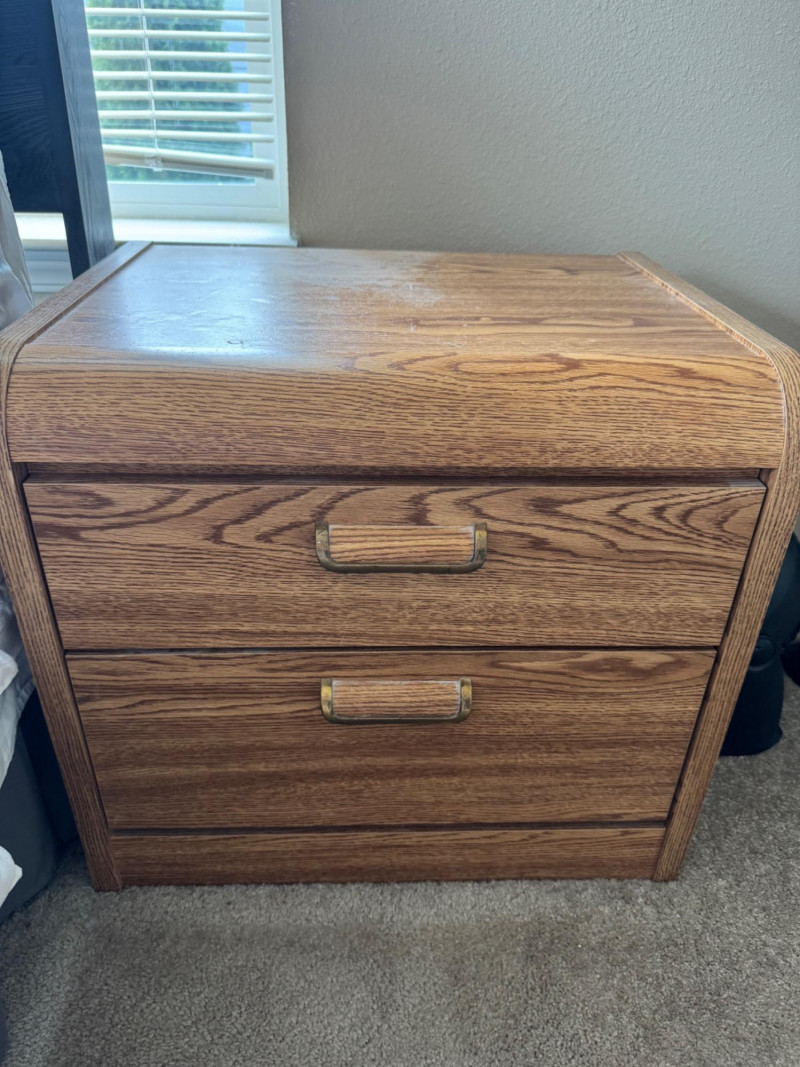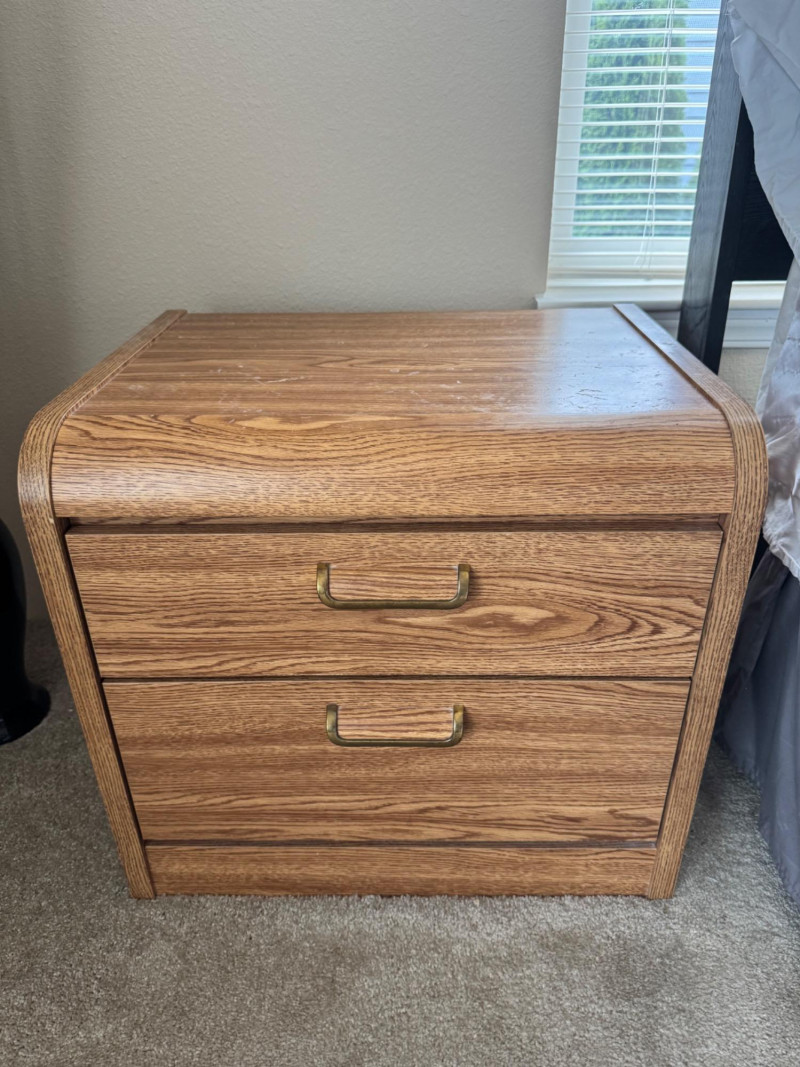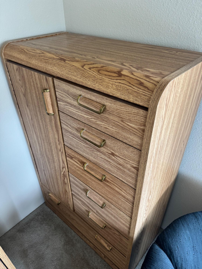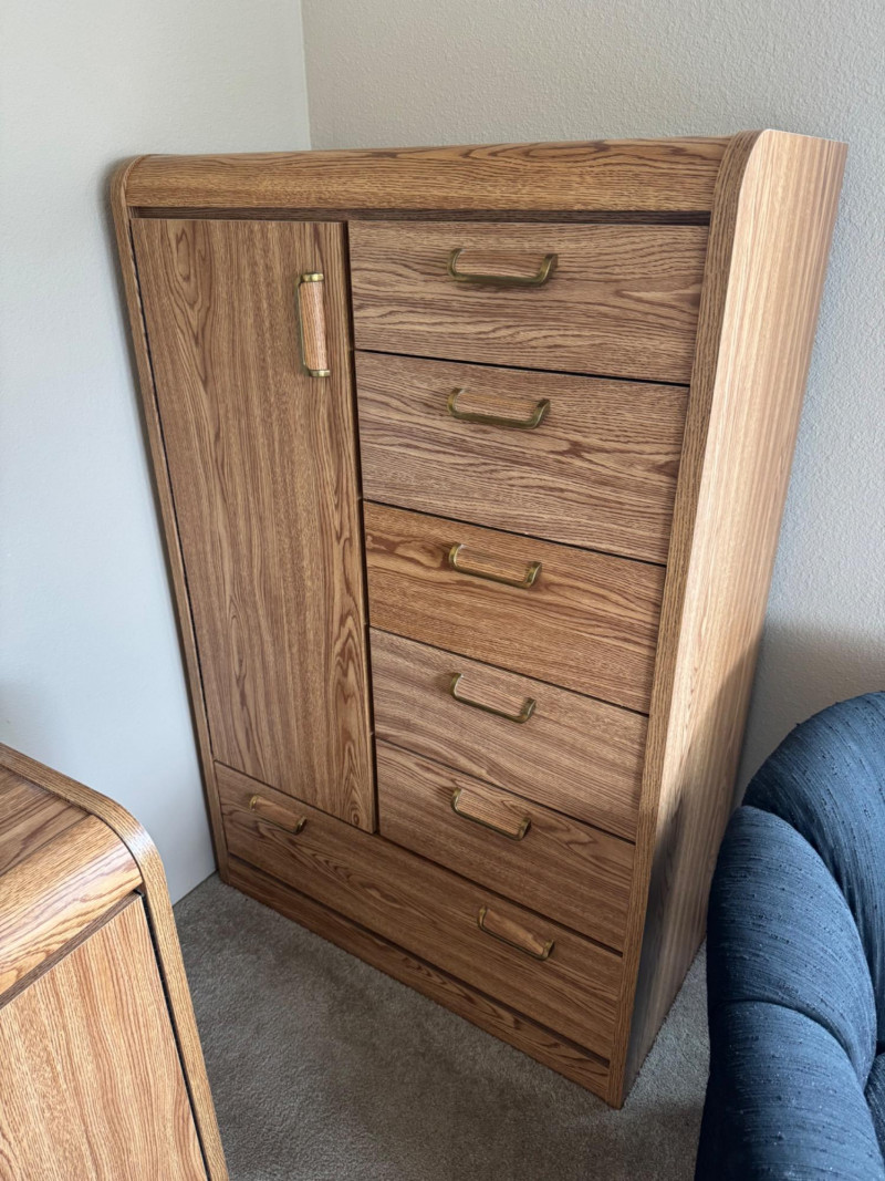 Tallboy Dresser w/ Cabinet + 2 Matching Nightstands, Light Wood Finish. Dresser 36” Wide 18” Deep 55” Tall Nightstands 24” Wide 18” Deep 21.5” Tall Note: Two matching nightstands show heavier wear to their top surfaces. Bidding on this lot is an agreement that: (1.) You will have at least 2 capable, able bodied persons to lift and load at a minimum. (2.) You will bring a hand truck and/or any other tools needed to remove this item. If these steps are not followed your item will be forfeit and no refund given.