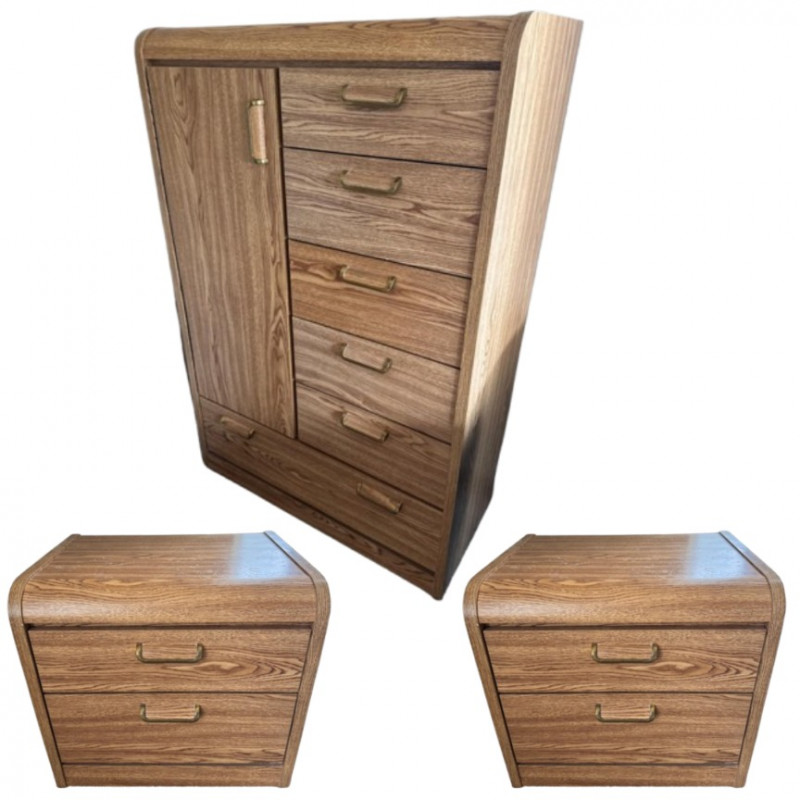 Lot # 37 - Tallboy Dresser w/ Cabinet + 2 Matching Nightstands, Light Wood Finish
