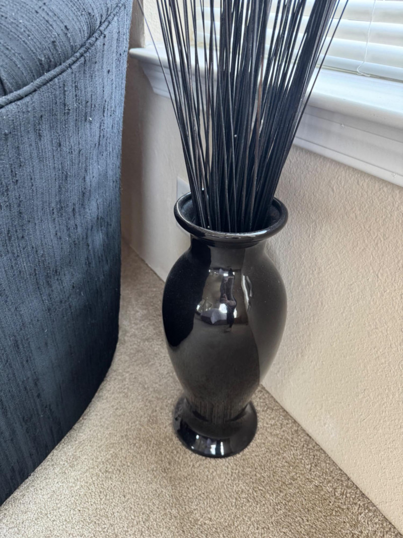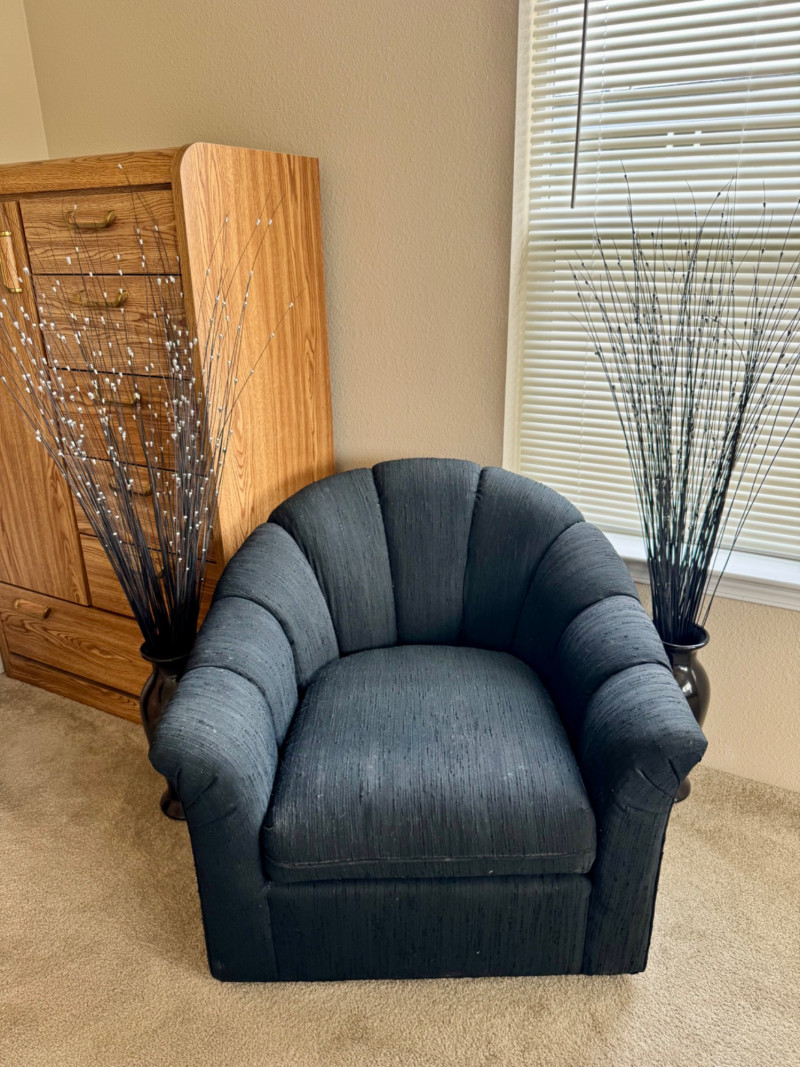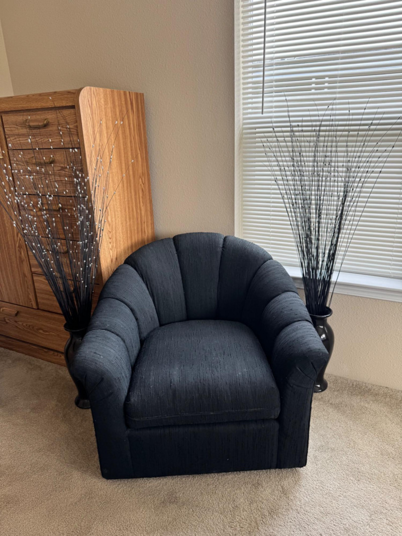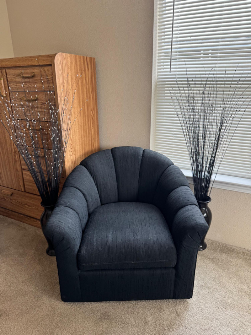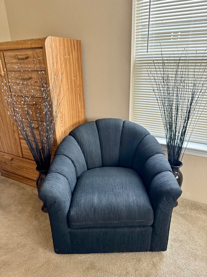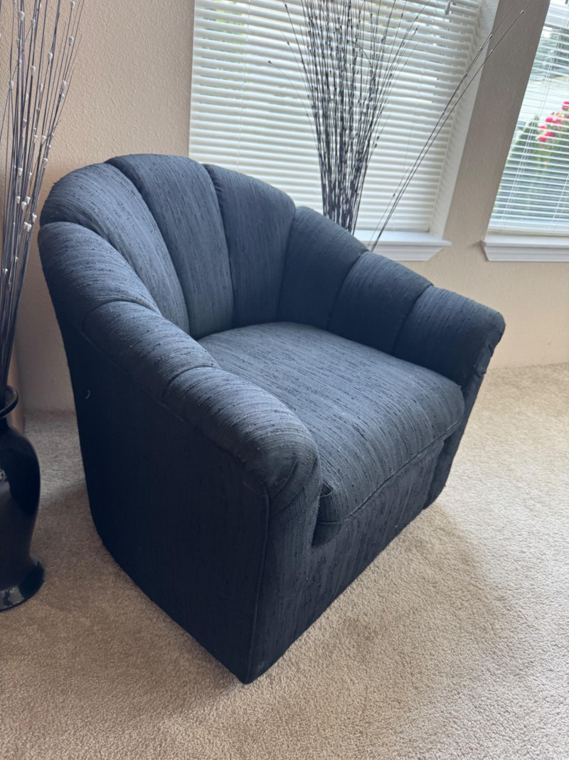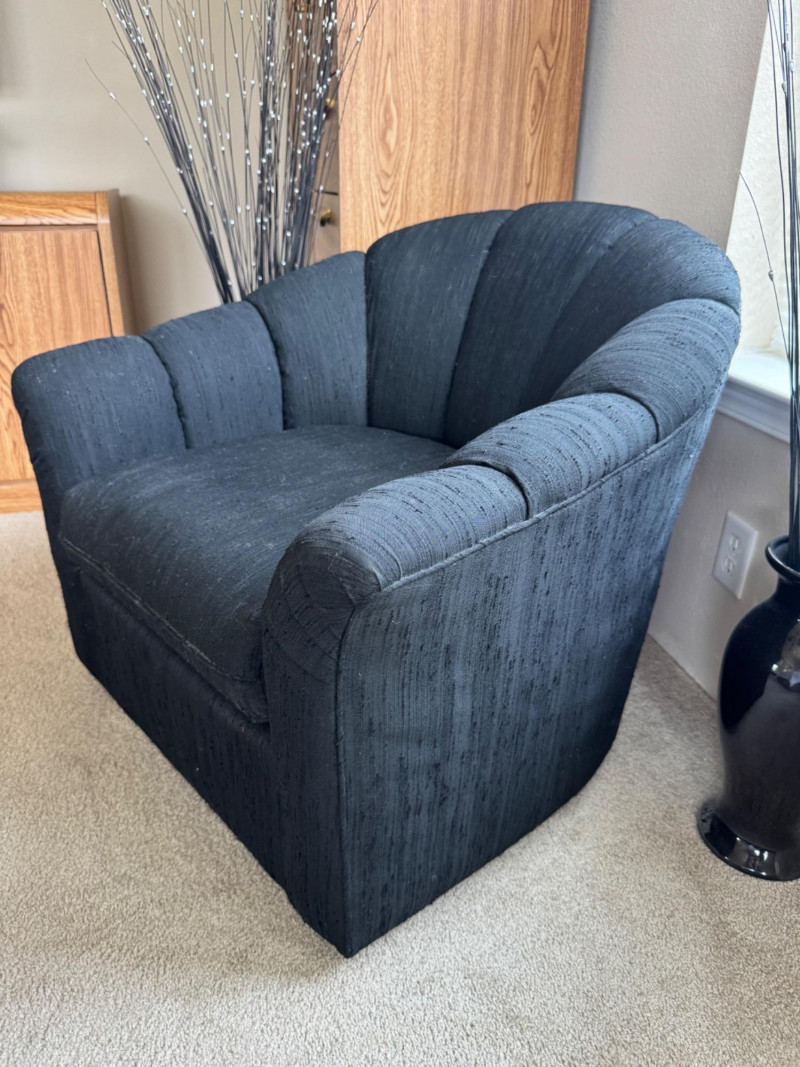 Vintage Swivel Barrel Chair + 2 Decorative Floor Vases w/ Sticks. Sticks 52” tall Vintage Upholstered Barrel Back Chair Chair 33” Wide 32” Deep 16” Tall Seat Height 28” Tall Back Bidding on this lot is an agreement that: (1.) You will have at least 2 capable, able bodied persons to lift and load at a minimum. (2.) You will bring a hand truck and/or any other tools needed to remove this item. If these steps are not followed your item will be forfeit and no refund given.