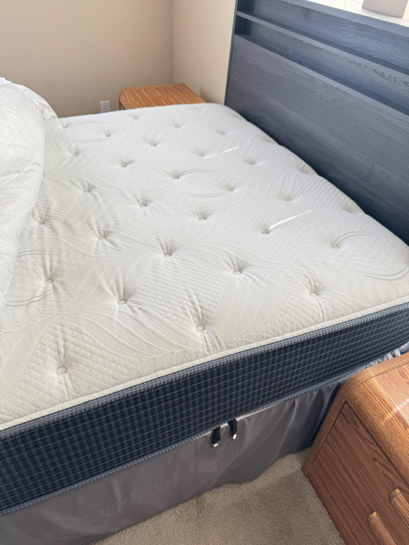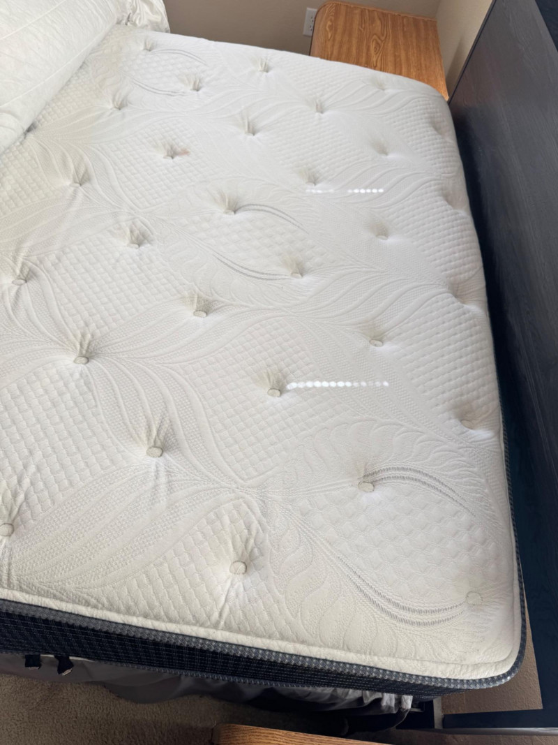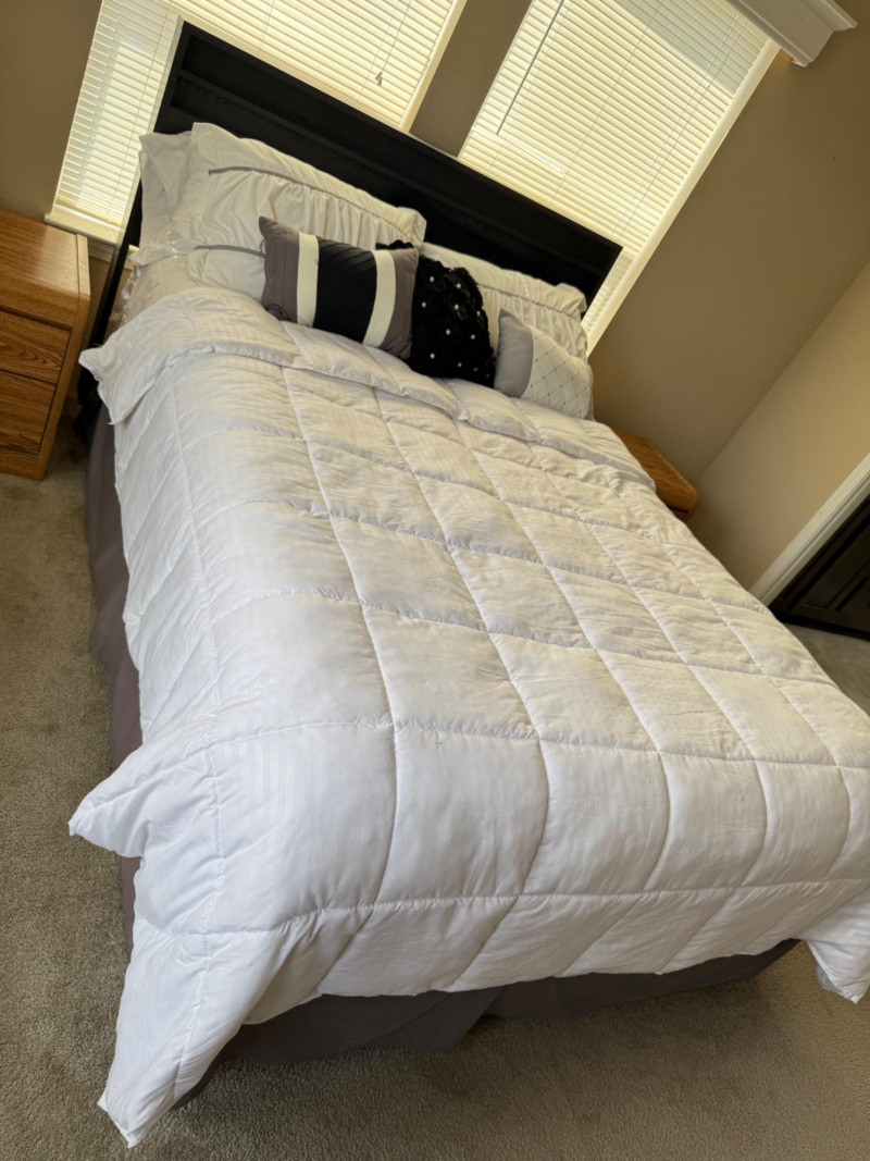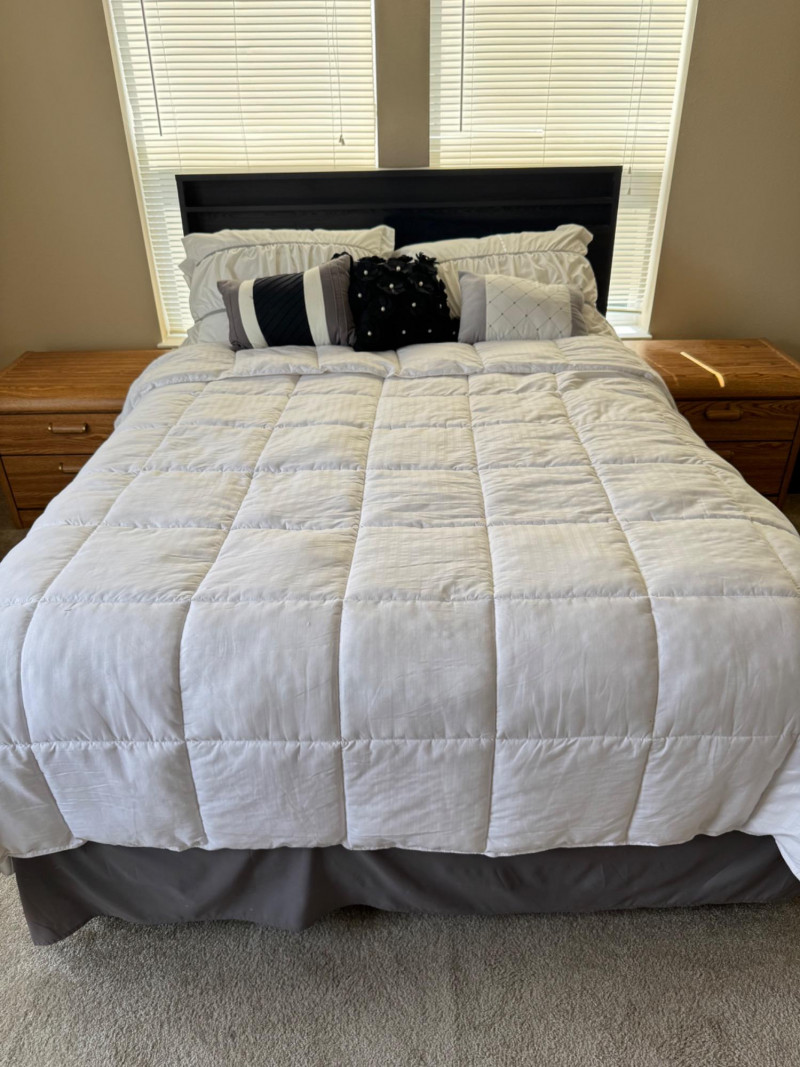 Queen Bed Set – Frame, Mattress & Bedding w/ Headboard (62.5” W) - Must Take All. Note: One small stain noted on the mattress surface (see photo), otherwise in good used condition. Must Take All. Bidding on this lot is an agreement that: (1.) You will have at least 2 capable, able bodied persons to lift and load at a minimum. (2.) You will bring a hand truck and/or any other tools needed to remove this item. If these steps are not followed your item will be forfeit and no refund given.
