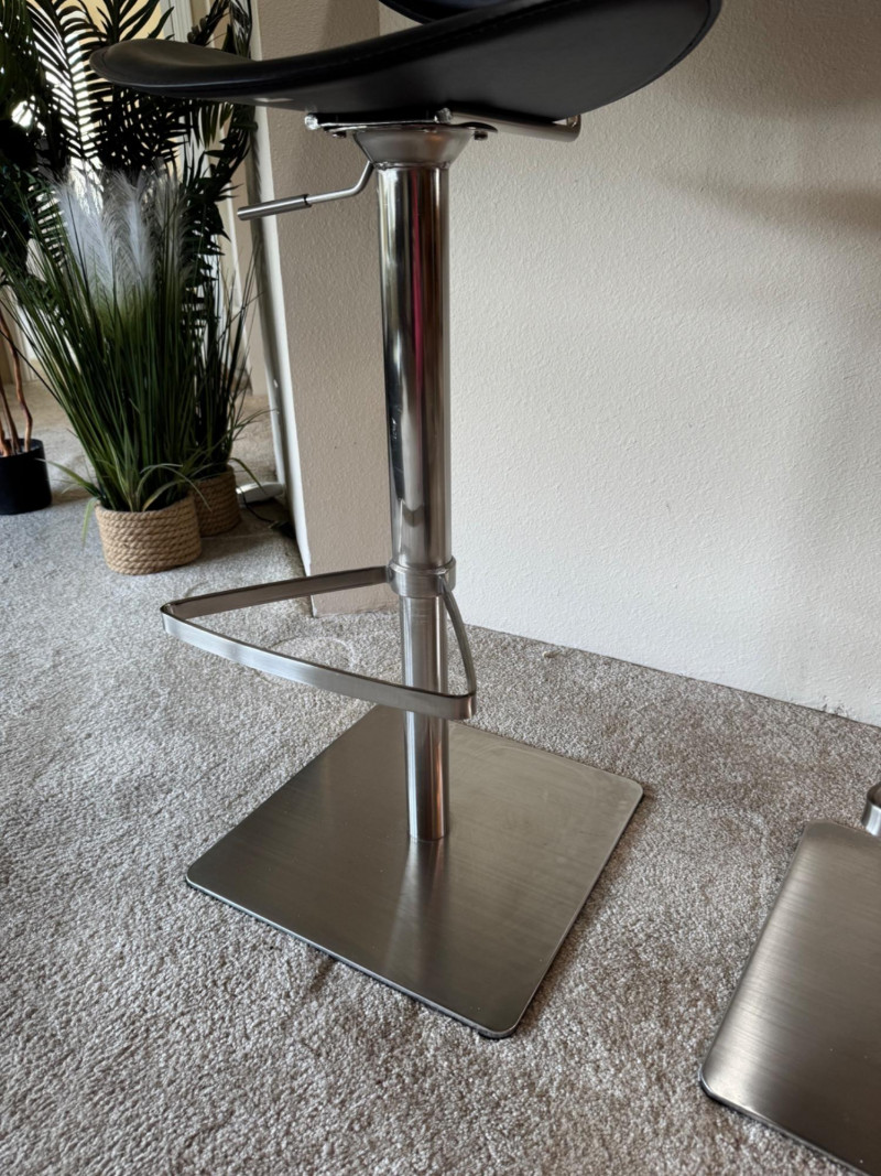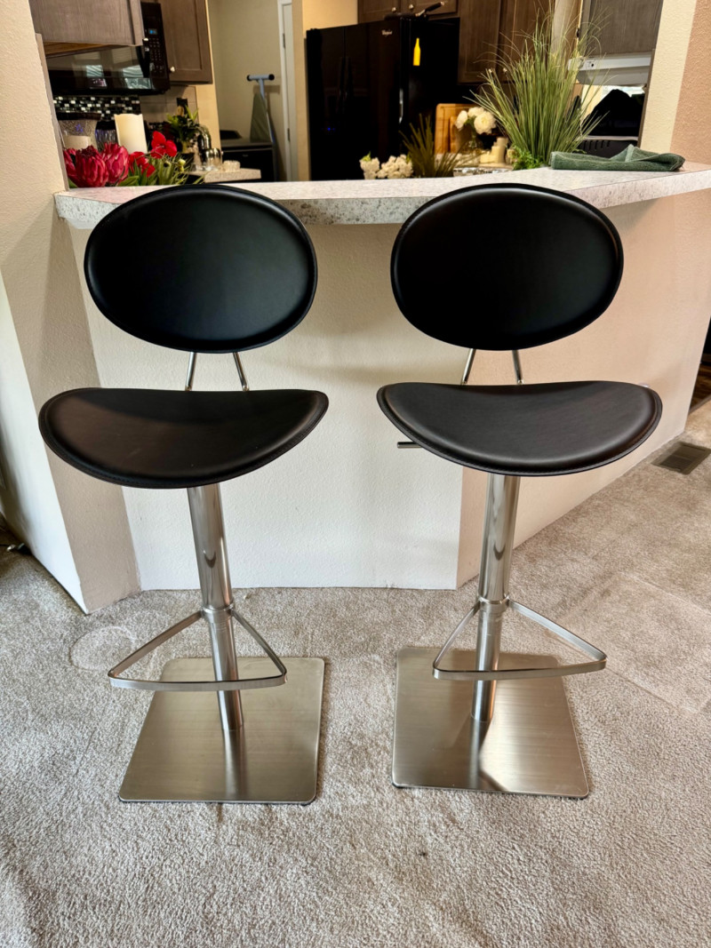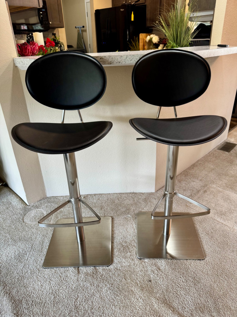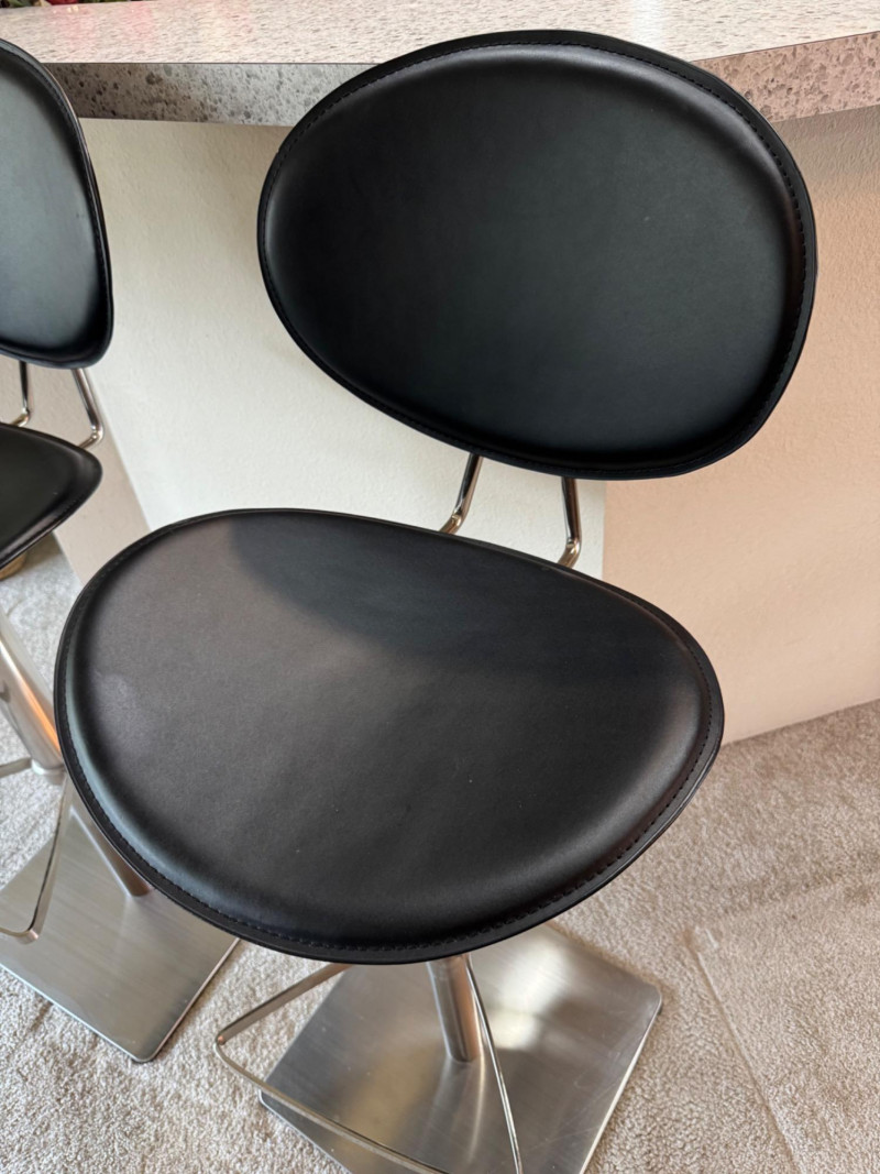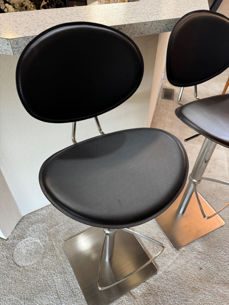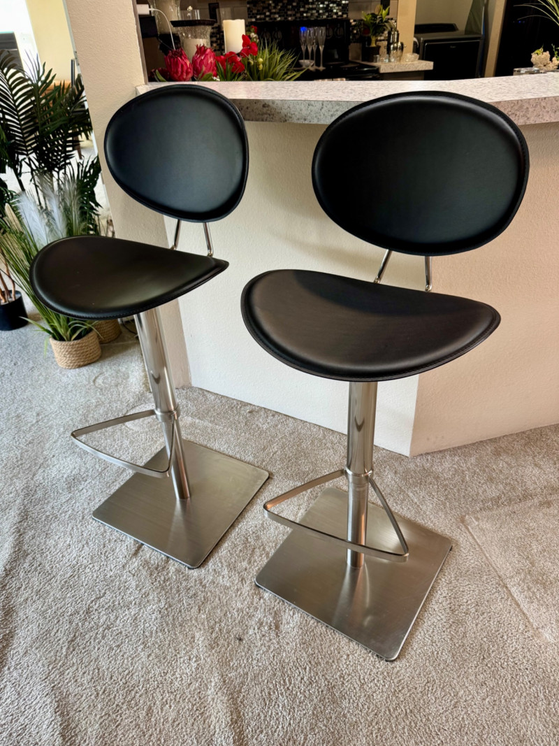 Pair of Modern Swivel Bar Stools – Dania Style, Faux Leather & Chrome. 19” Wide 17” Deep 31” Tall Seat Height In Photo Bidding on this lot is an agreement that: (1.) You will have at least 2 capable, able bodied persons to lift and load at a minimum. (2.) You will bring a hand truck and/or any other tools needed to remove this item. If these steps are not followed your item will be forfeit and no refund given.