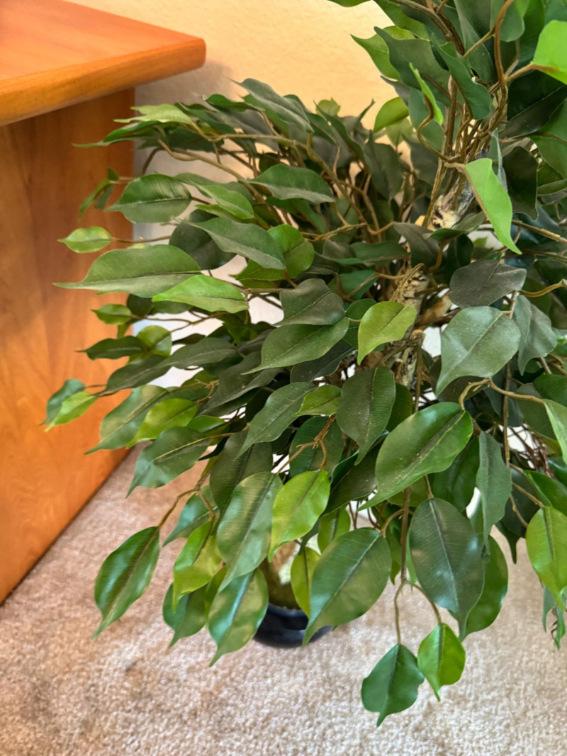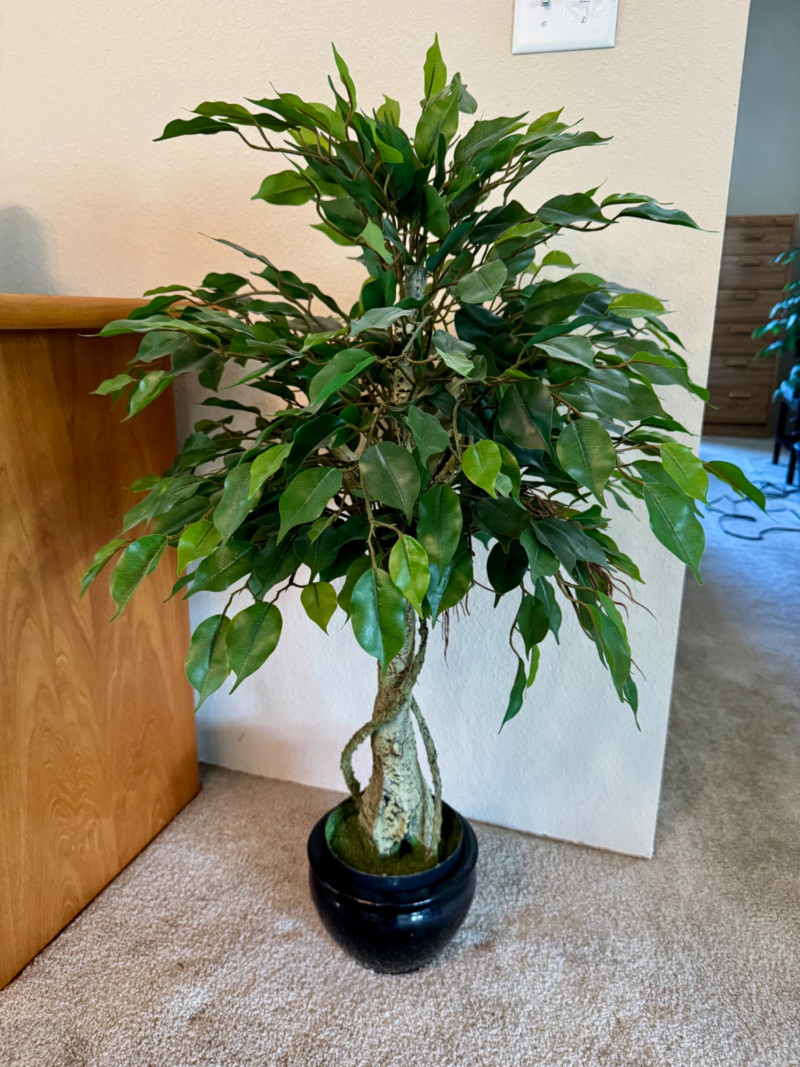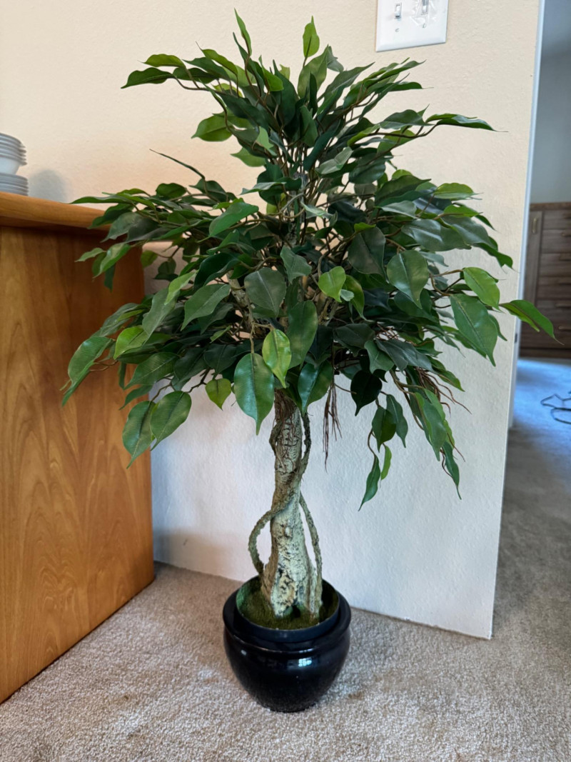 Faux Ficus Tree in Black Ceramic Pot – Twisted Trunk Design. 40” Tall Bidding on this lot is an agreement that: (1.) You will have at least 2 capable, able bodied persons to lift and load at a minimum. (2.) You will bring a hand truck and/or any other tools needed to remove this item. If these steps are not followed your item will be forfeit and no refund given.
