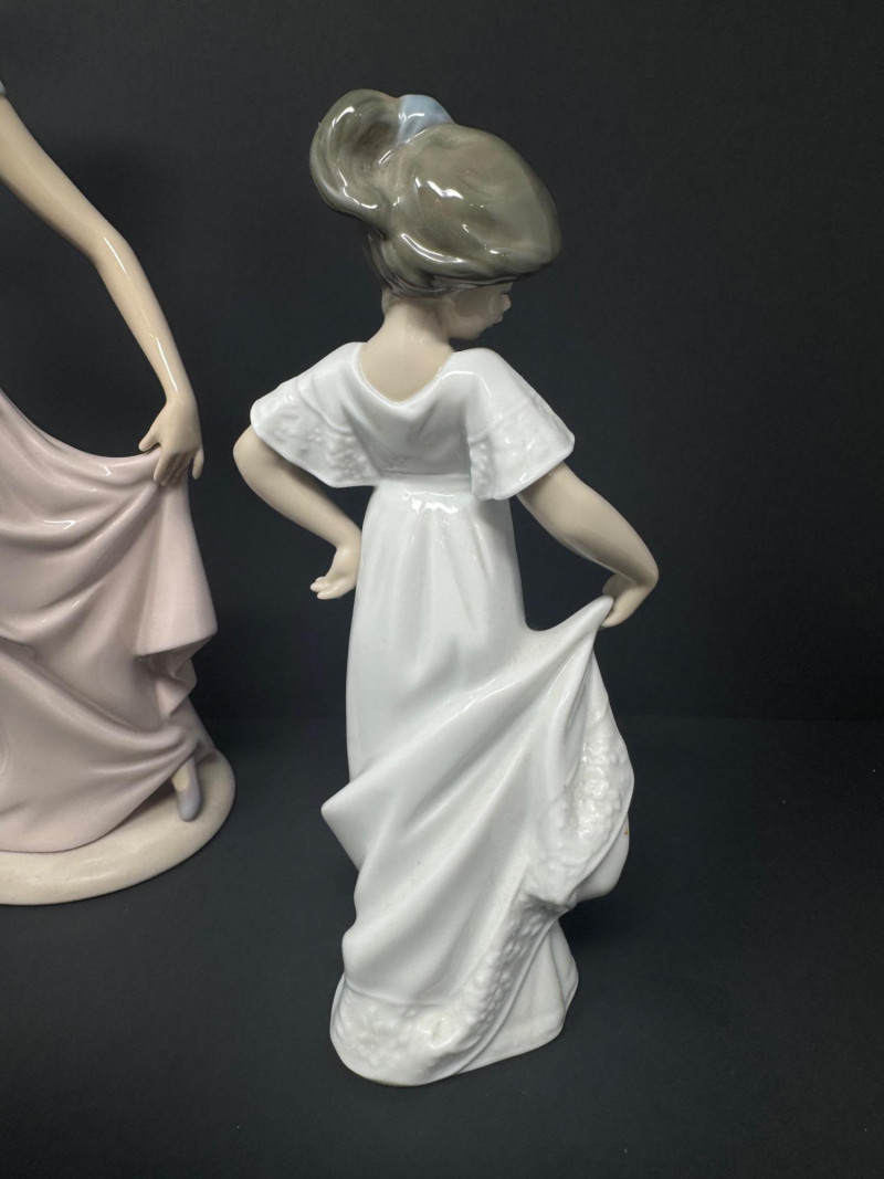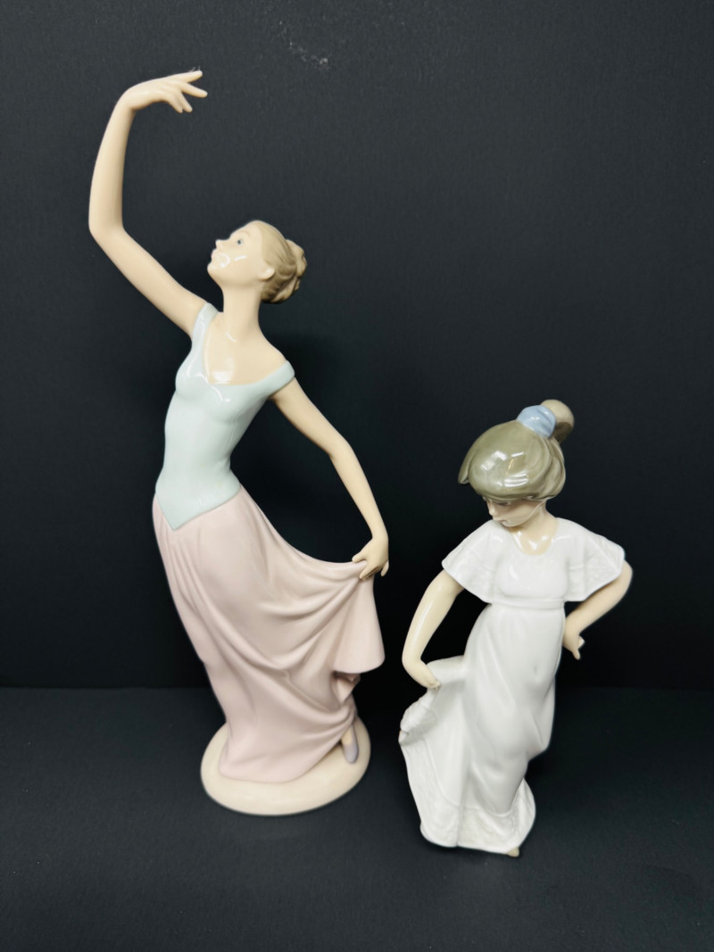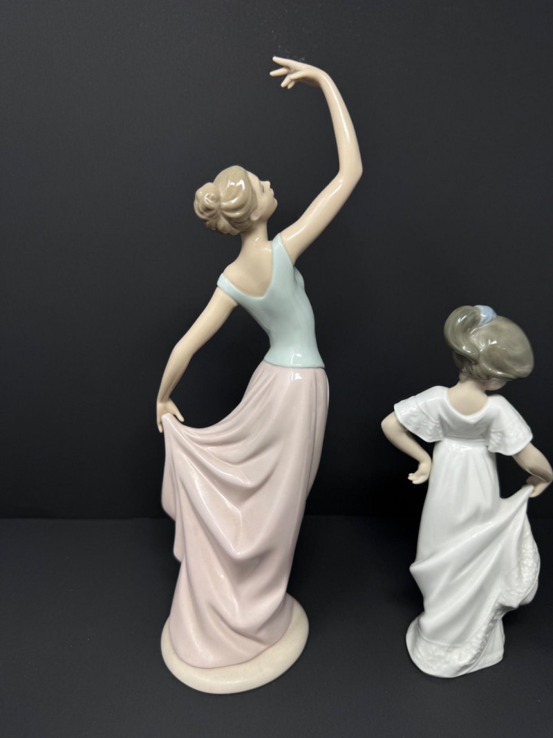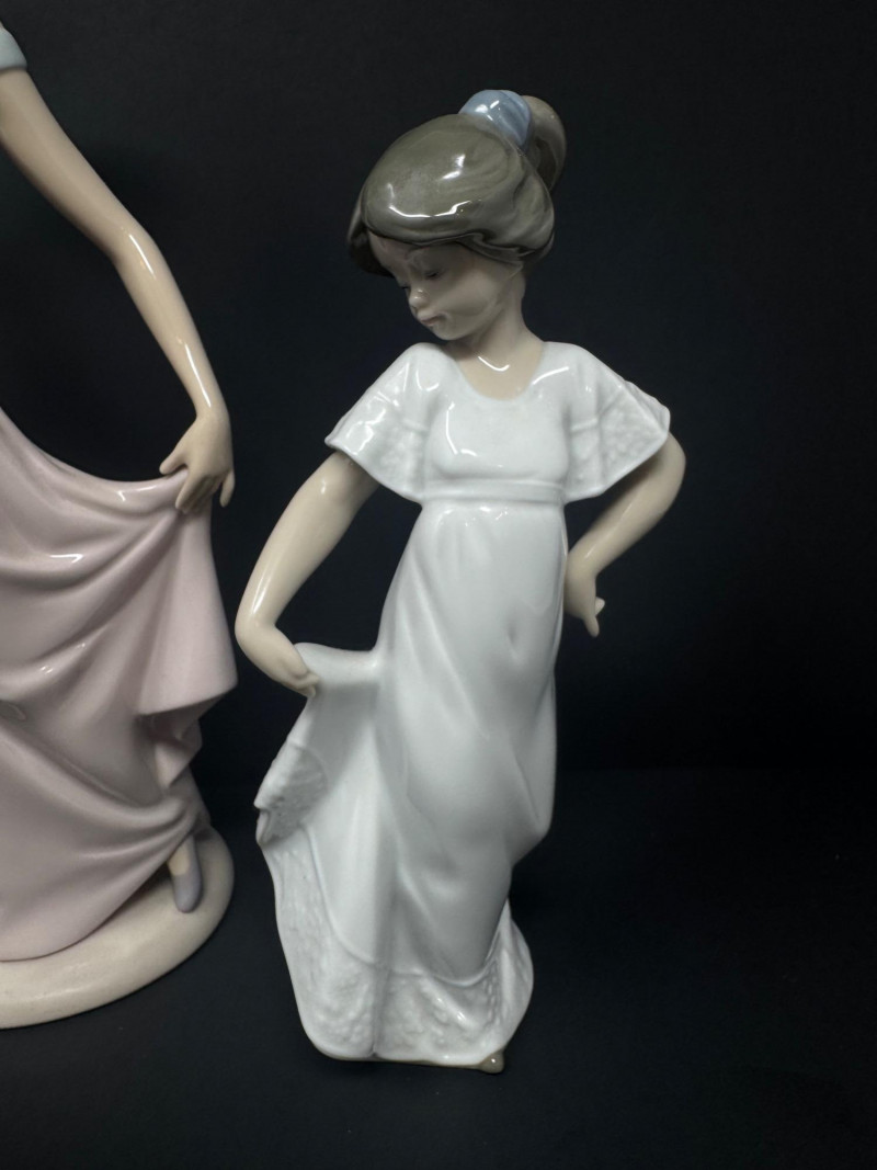 NAO Lladro Figurines: 'The Dance Is Over' (1994) & 'How Pretty' (1989). 9-13.5”
