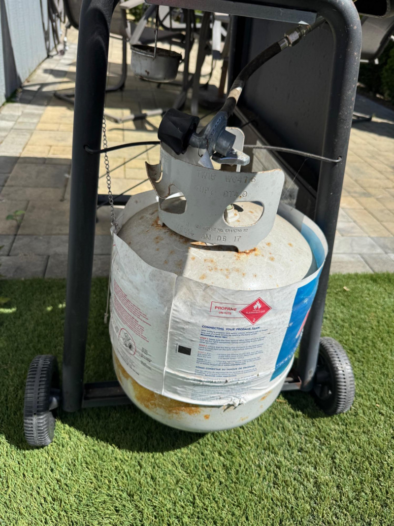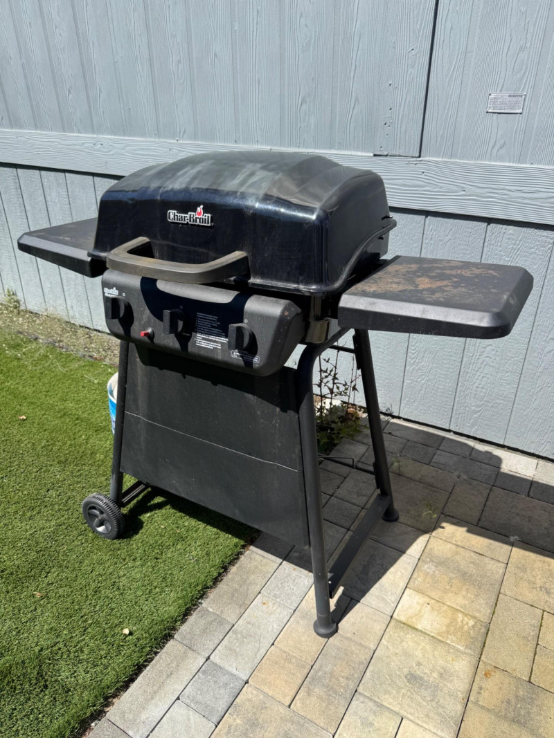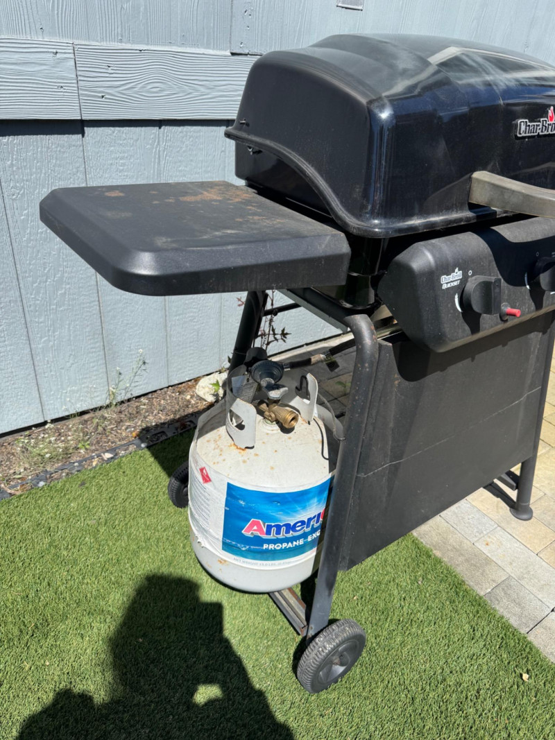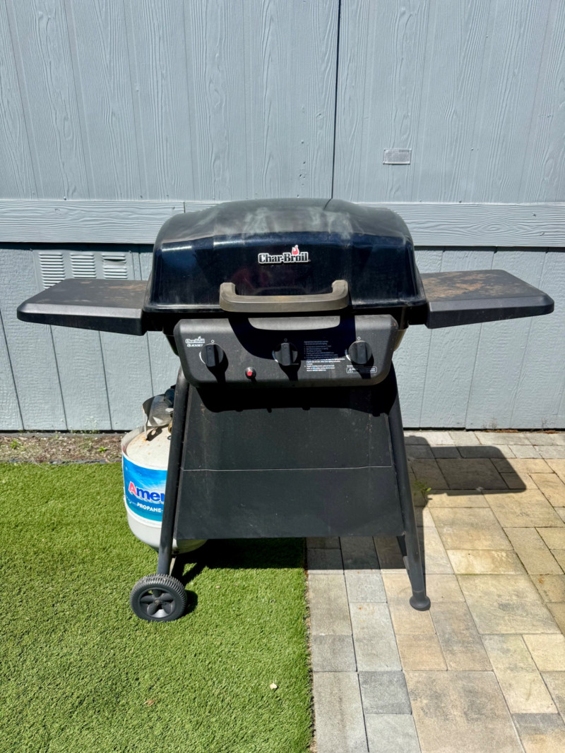 Char-Broil 3-Burner Gas Grill w/ Side Shelves & Propane Tank. 51” Long 45” Tall Bidding on this lot is an agreement that: (1.) You will have at least 2 capable, able bodied persons to lift and load at a minimum. (2.) You will bring a hand truck and/or any other tools needed to remove this item. If these steps are not followed your item will be forfeit and no refund given.