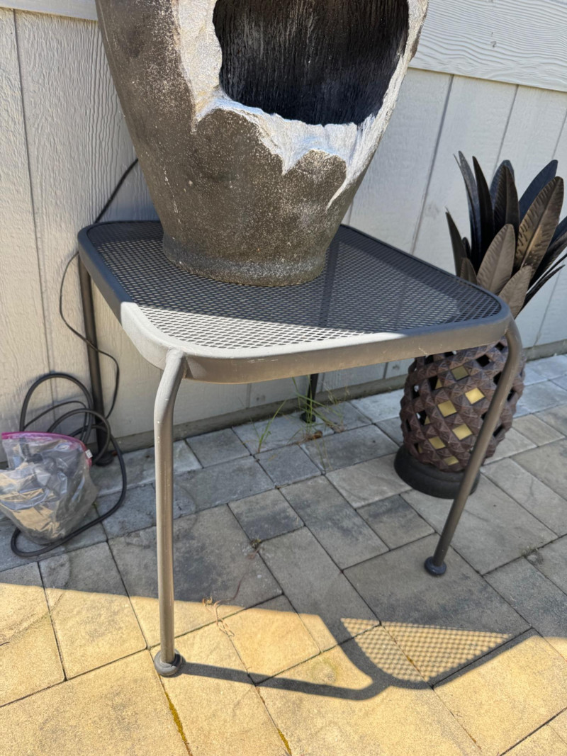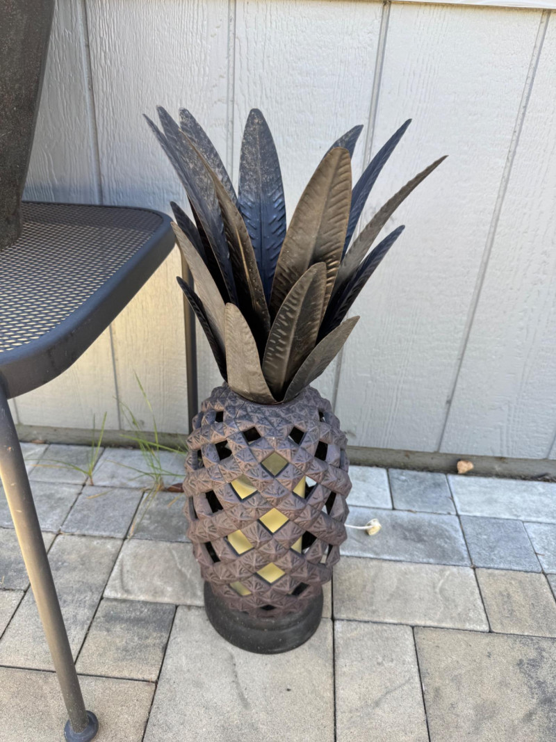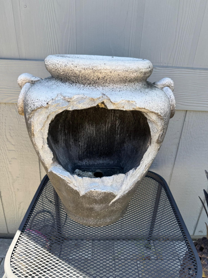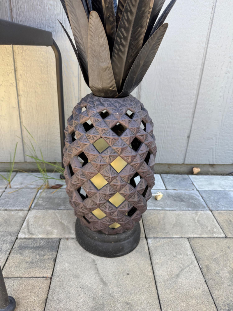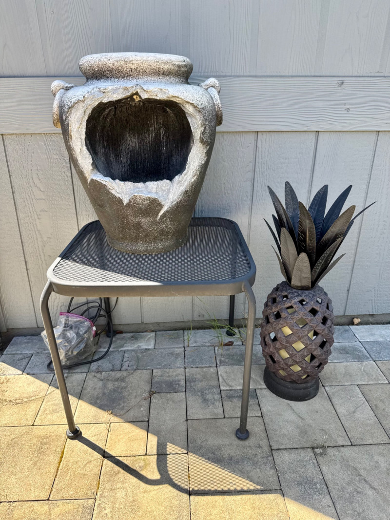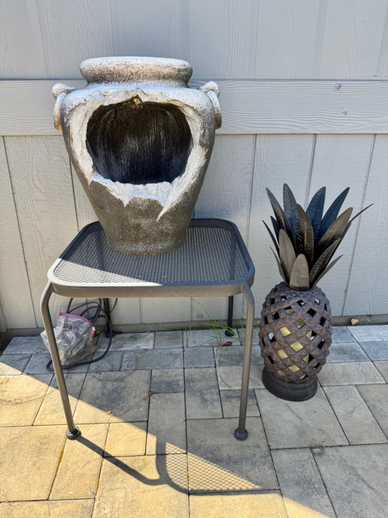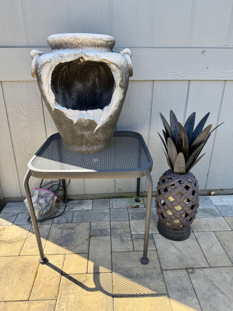 Decorative Metal Pineapple Lantern & Textured Fountain Vase. Fountain Is Untested. Looks To Be Clean And In Good Condition. Pineapple Lantern 25” Tall Table 20” X 20” Top, 19” Tall Bidding on this lot is an agreement that: (1.) You will have at least 2 capable, able bodied persons to lift and load at a minimum. (2.) You will bring a hand truck and/or any other tools needed to remove this item. If these steps are not followed your item will be forfeit and no refund given.