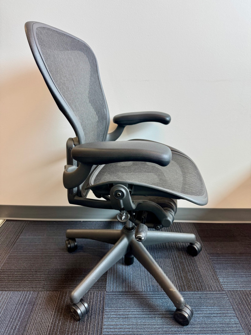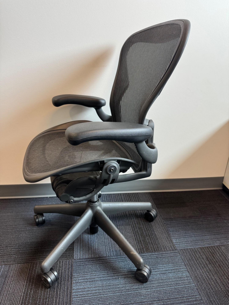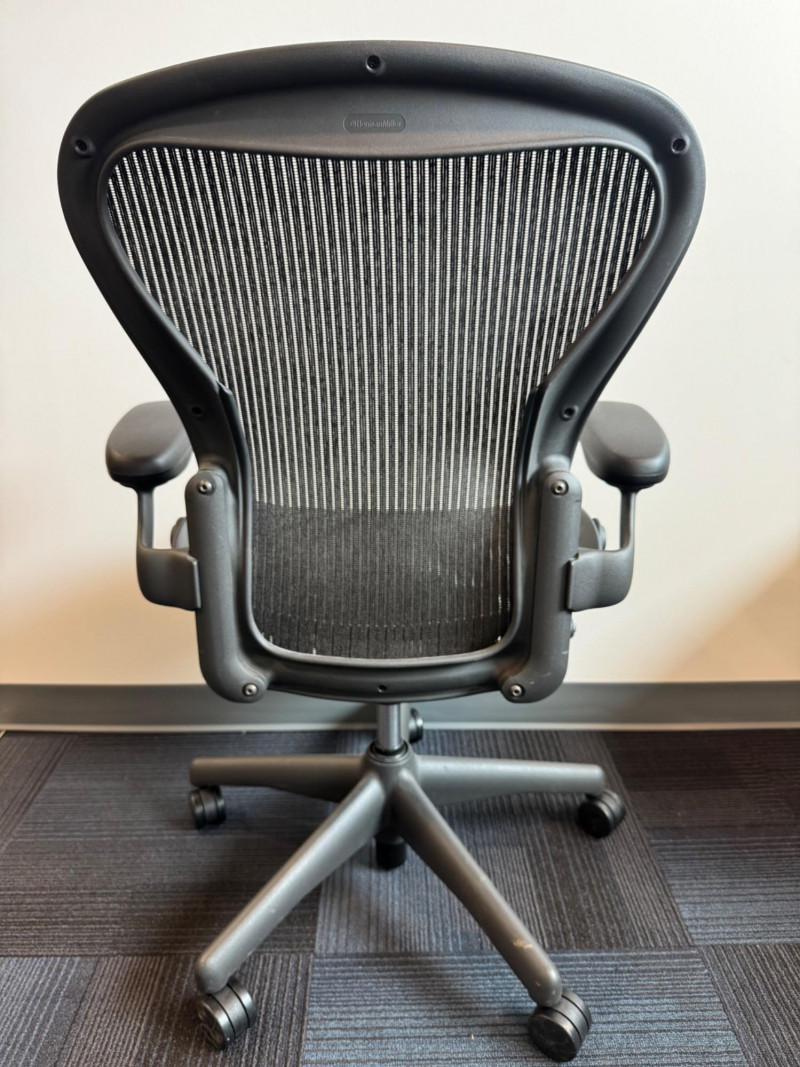 Herman Miller Aeron Office Chair – Classic Ergonomic Design #1. 26” Wide 18” Deep 19” Seat Height When Down 40 Tall Back When Down Bidding on this lot is an agreement that: (1.) You will have at least 2 capable, able bodied persons to lift and load at a minimum. (2.) You will bring a hand truck and/or any other tools needed to remove this item. If these steps are not followed your item will be forfeit and no refund given.