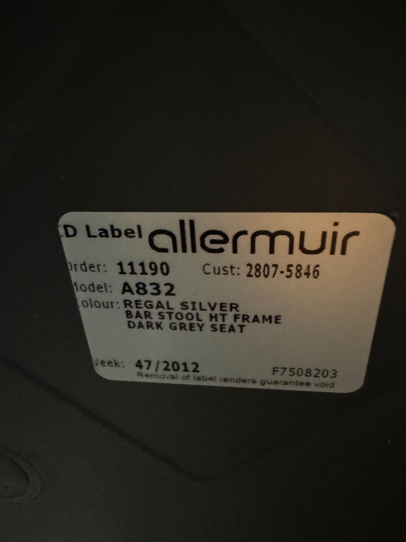 Set 7 – Allermuir Kojak Bar Stools (2) – Purchased Price $700+ Pair. 17” Wide 17” Deep 29” Tall Seat Height Originally purchased at $354 per stool ($708 per pair). Color: Dark Grey Seat / Regal Silver Frame