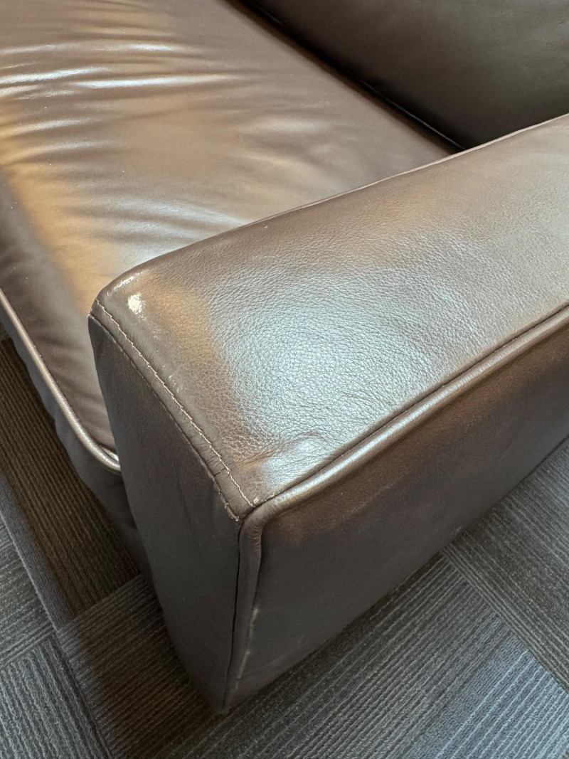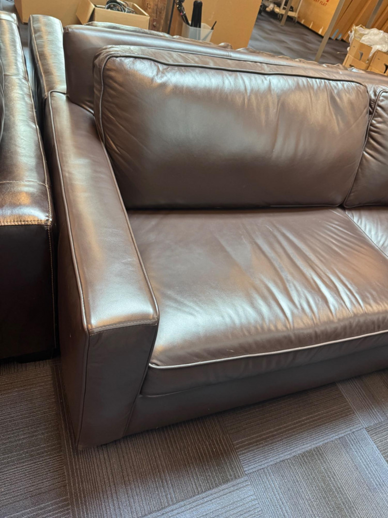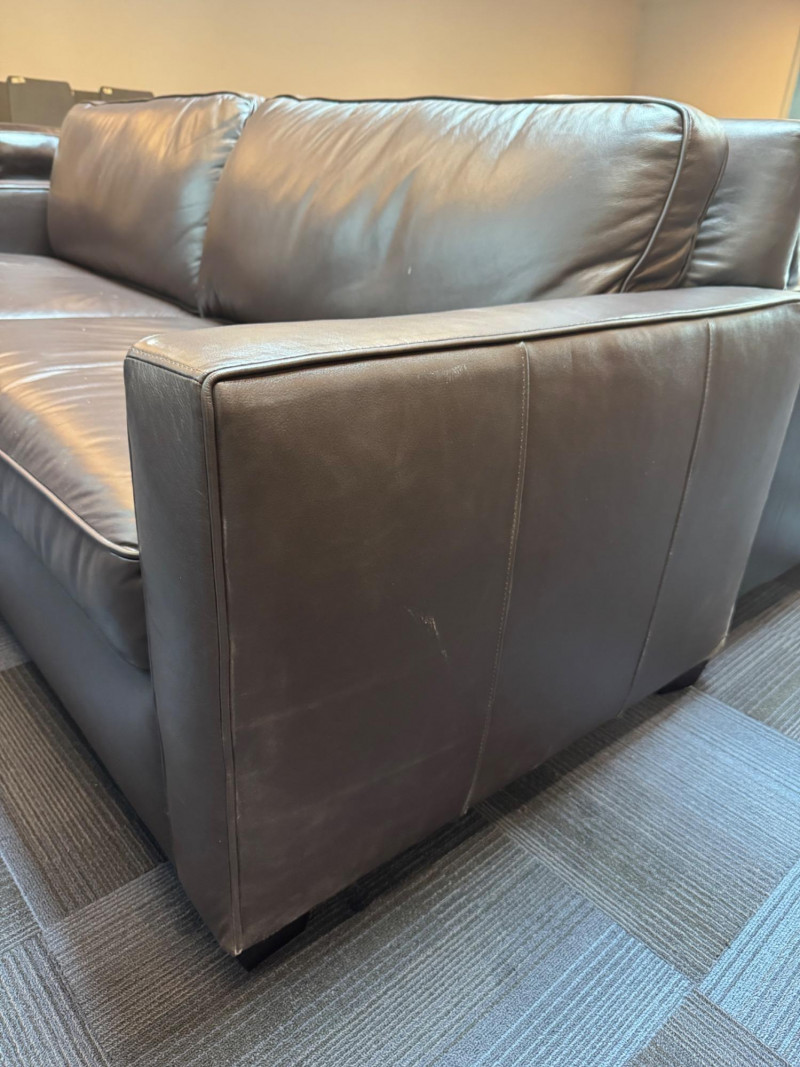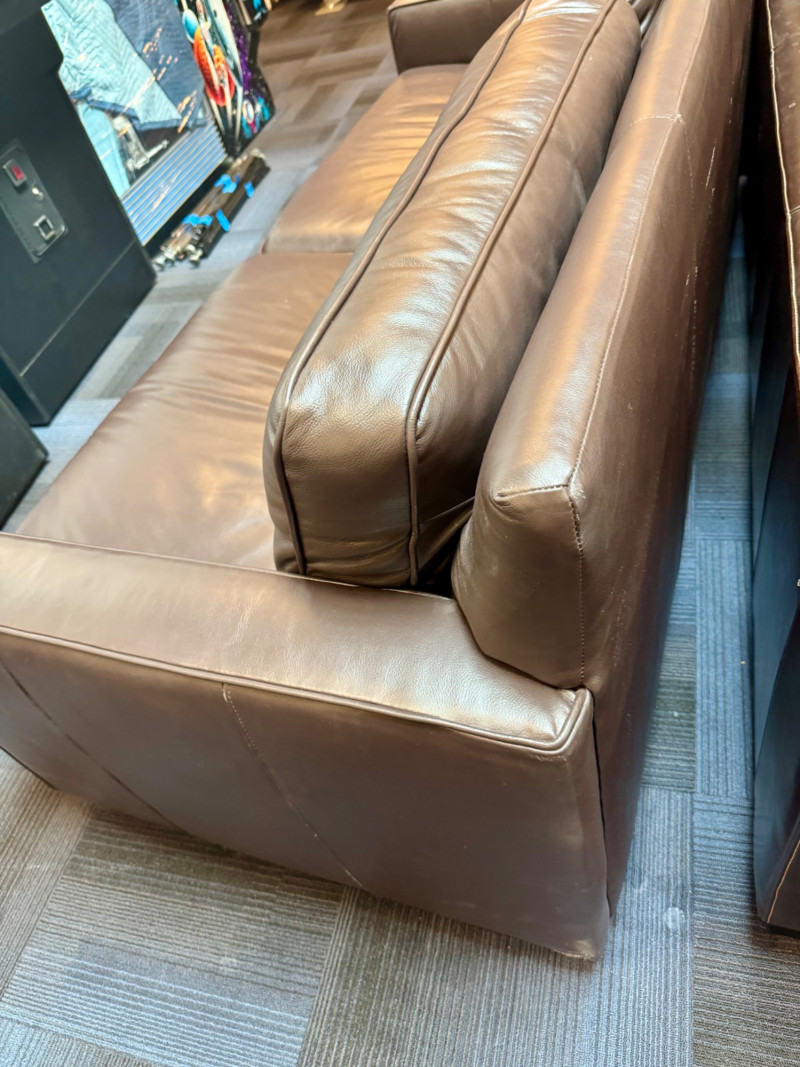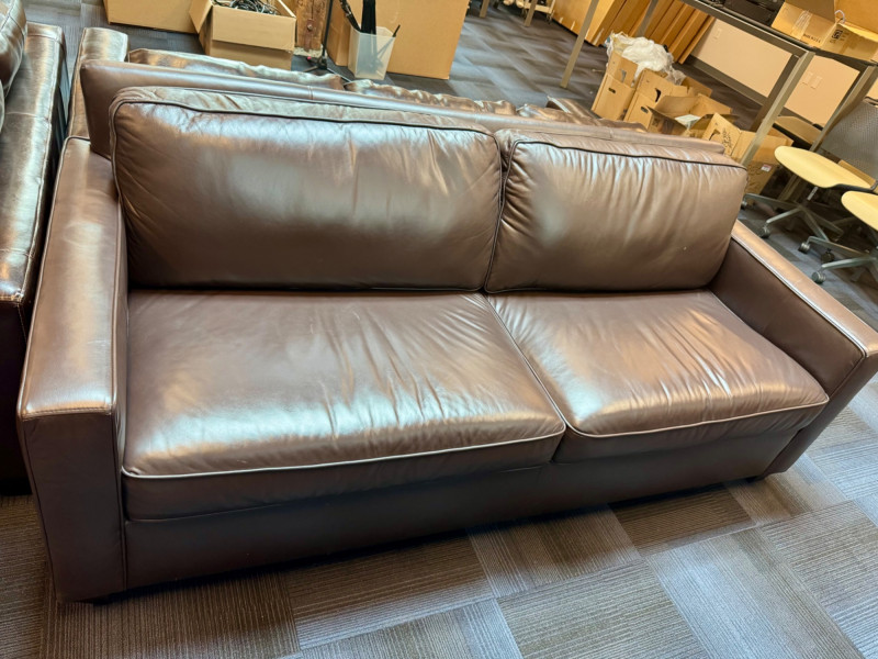 Pottery Barn Turner Square Arm Leather Sofa, Legacy – Retails $3,000+ Warm Legacy color, similar to Pottery Barn Turner “Tobacco”, Legacy. Note: Condition: Areas of wear on armrest and back bottom corner. Dimensions: Length: 85" Depth: 35" Seat Height: 17" Back Height: 34"