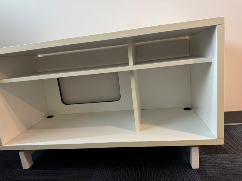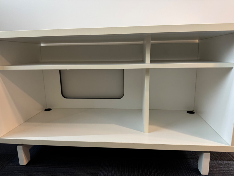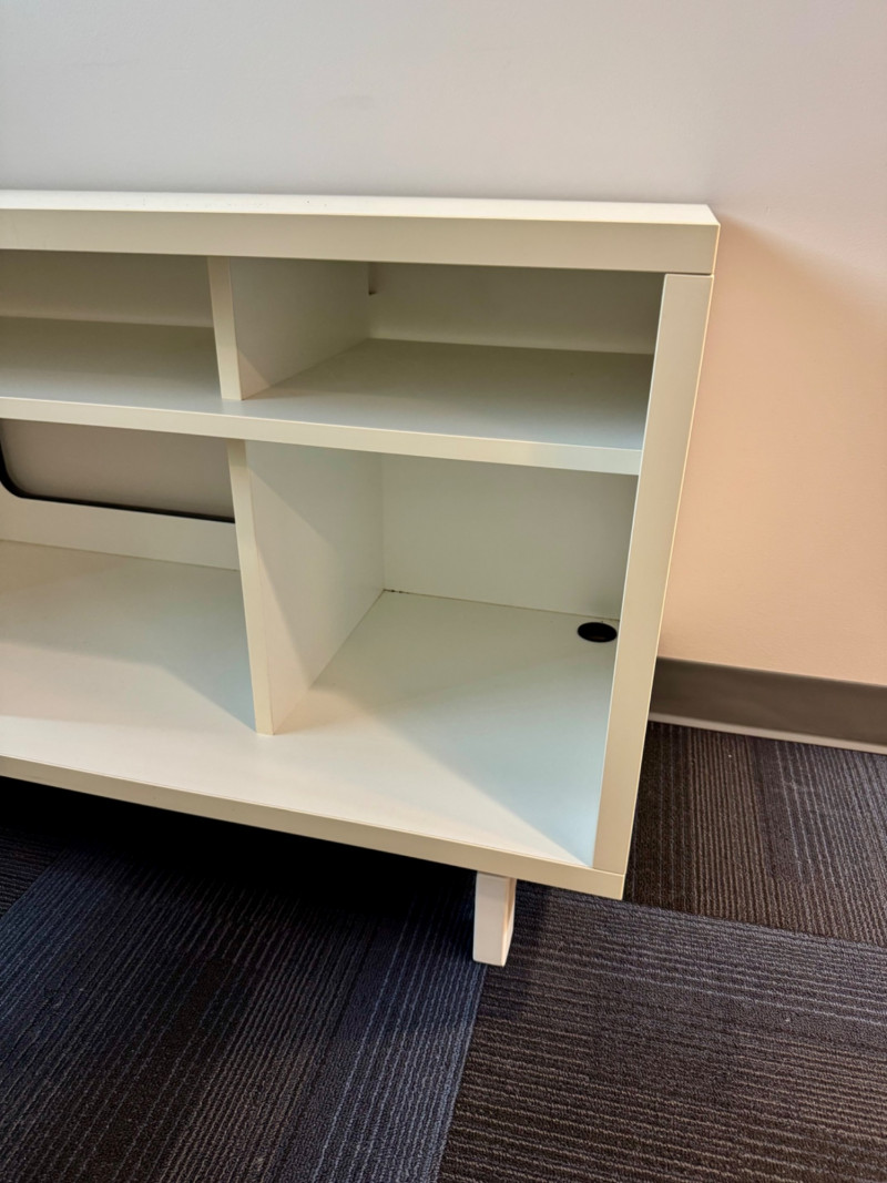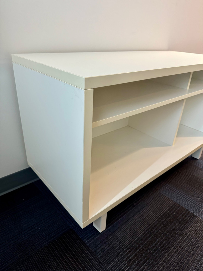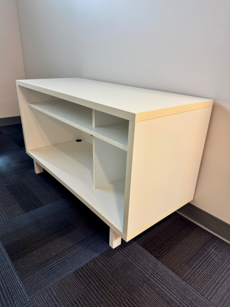 Modern White Media Console / Storage Unit – 45” Wide #1. Features: Contemporary white media console or multipurpose storage unit Measures approx. 45” long x 19.5” deep x 26.5” tall Open shelving with cable cutouts for media organization Two-tier layout with asymmetrical compartments Bidding on this lot is an agreement that: (1.) You will have at least 2 capable, able bodied persons to lift and load at a minimum. (2.) You will bring a hand truck and/or any other tools needed to remove this item. If these steps are not followed your item will be forfeit and no refund given.