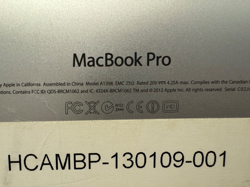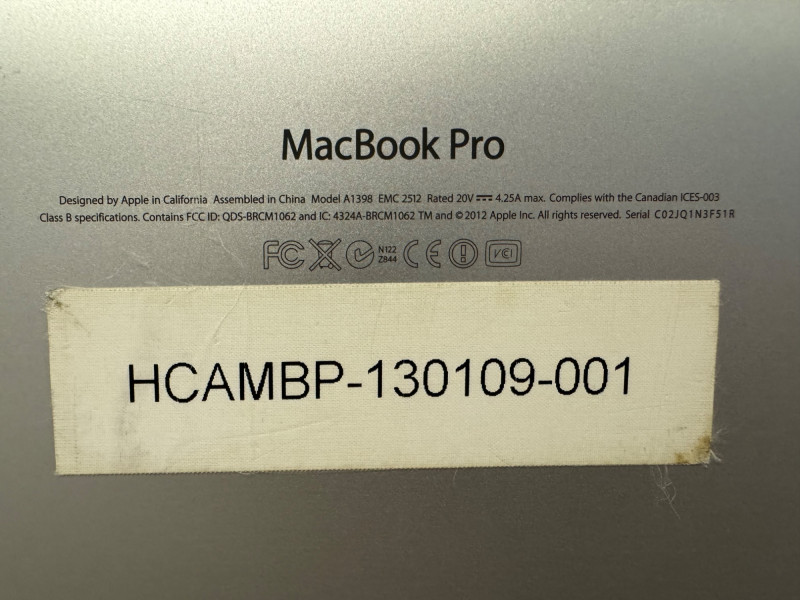 Apple MacBook Pro 15" Retina Display w/ Charger – C02JQ1N3F51R. Disclaimer: Light cosmetic wear.
