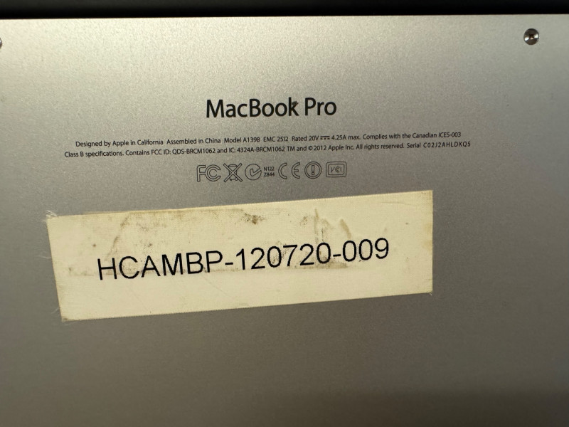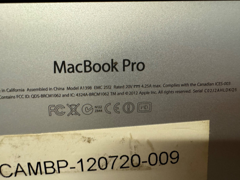 Apple MacBook Pro 15" Retina Display w/ Charger - C02J2HLDKQ5. Disclaimer: Visible wear on one corner.