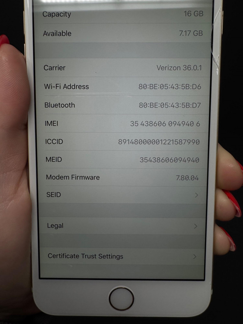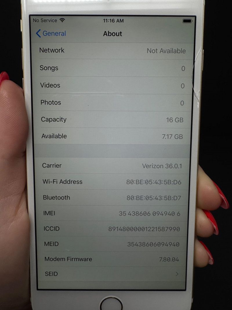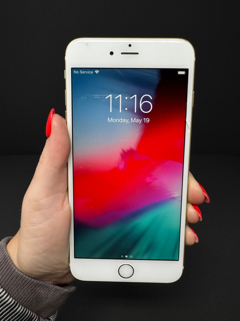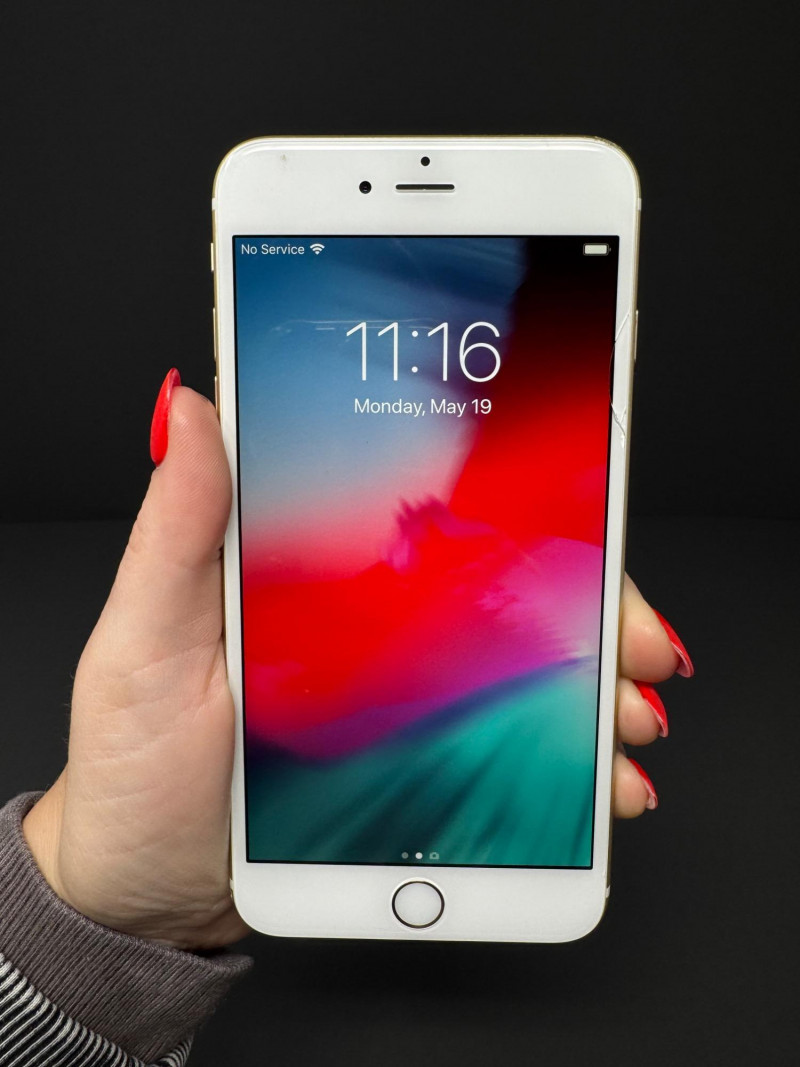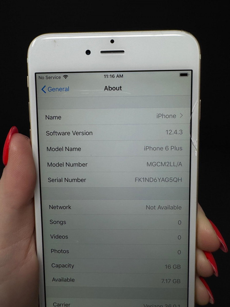 Apple iPhone 6 Plus 16 GB Gold – iOS 12.4.3, 7.2 GB Free. Features Model: iPhone 6 Plus (MGCM2LL/A) – 16 GB Gold iOS version:12.4.3 Carrier: Verizon 36.0.1 Serial number:FK1ND6YAG5QH Available storage:7.17 GB of 16 GB Condition disclaimer: All pieces are previously used and may display light, unnoted wear—smudges, marks, or small surface scratches—with minor variations from item to item. This item has a small crack to glass at upper-right corner (see photos).
