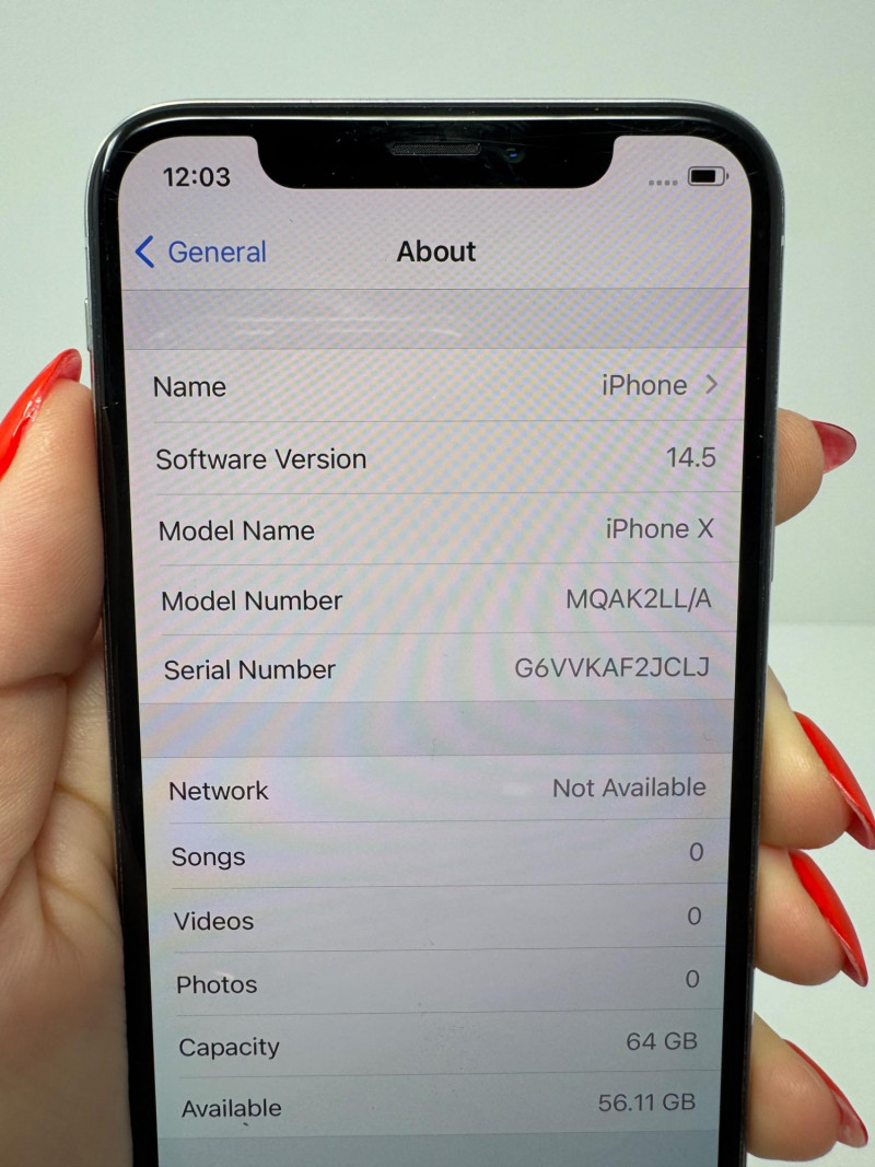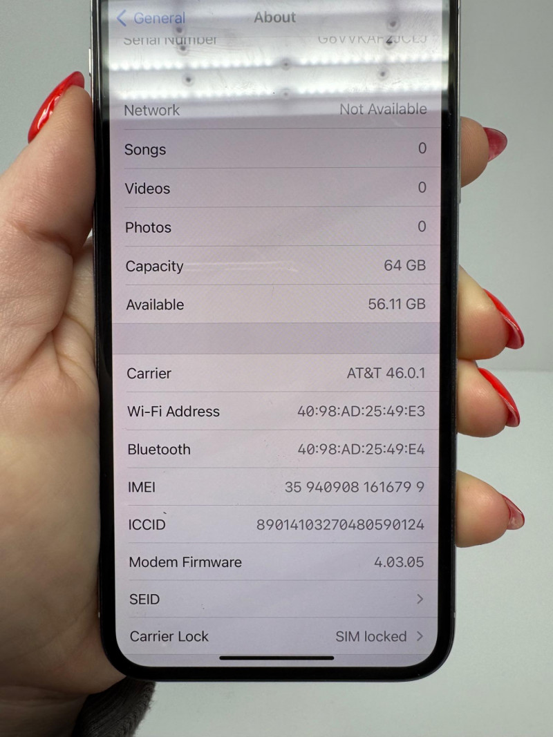 Apple iPhone X 64 GB Silver – iOS 14.5, AT&T, 56 GB Free. Features Model: iPhone X (MQAK2LL/A) – 64 GB Silver iOS version:14.5 Carrier: AT&T 46.0.1 — SIM-locked Serial number: G6VVKAF2JCLJ Available storage: 56.11 GB of 64 GB Condition disclaimer: All pieces are previously used and may display light, unnoted wear—smudges, marks, or small surface scratches—with minor variations from item to item.