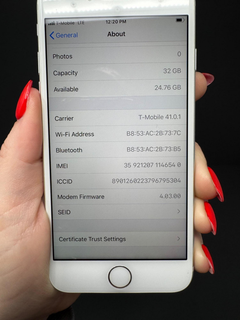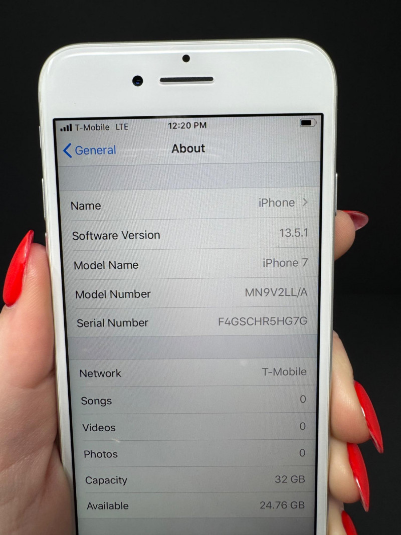 Apple iPhone 7 32GB Silver – iOS 13.5.1, T-Mobile, 24.8 GB Free. Features Model:iPhone 7 (MN9V2LL/A) – 32 GB Silver iOS version:13.5.1 Carrier:T-Mobile 41.0.1 Serial number:F4GSCHR5HG7G Available storage:24.76 GB of 32 GB Condition disclaimer: All pieces are previously used and may display light, unnoted wear—smudges, marks, or small surface scratches—with minor variations from item to item.