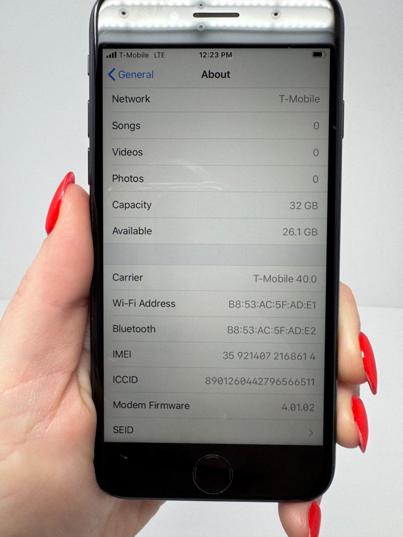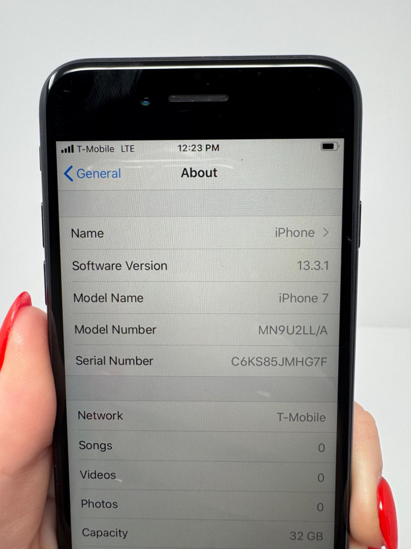 Apple iPhone 7 32 GB Black – iOS 13.3.1, T-Mobile, 26 GB Free. Features Model:iPhone 7 (MN9U2LL/A) – 32 GB Black iOS version:13.3.1 Carrier:T-Mobile 40.0 Serial number:C6KS85JMHG7F Available storage:26.1 GB of 32 GB Condition disclaimer: All pieces are previously used and may display light, unnoted wear—smudges, marks, or small surface scratches—with minor variations from item to item.