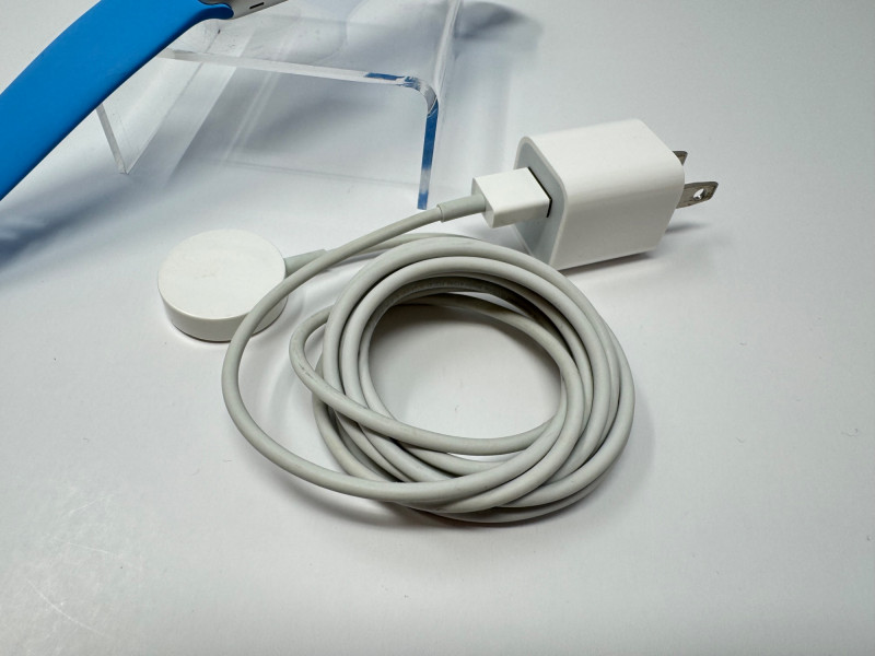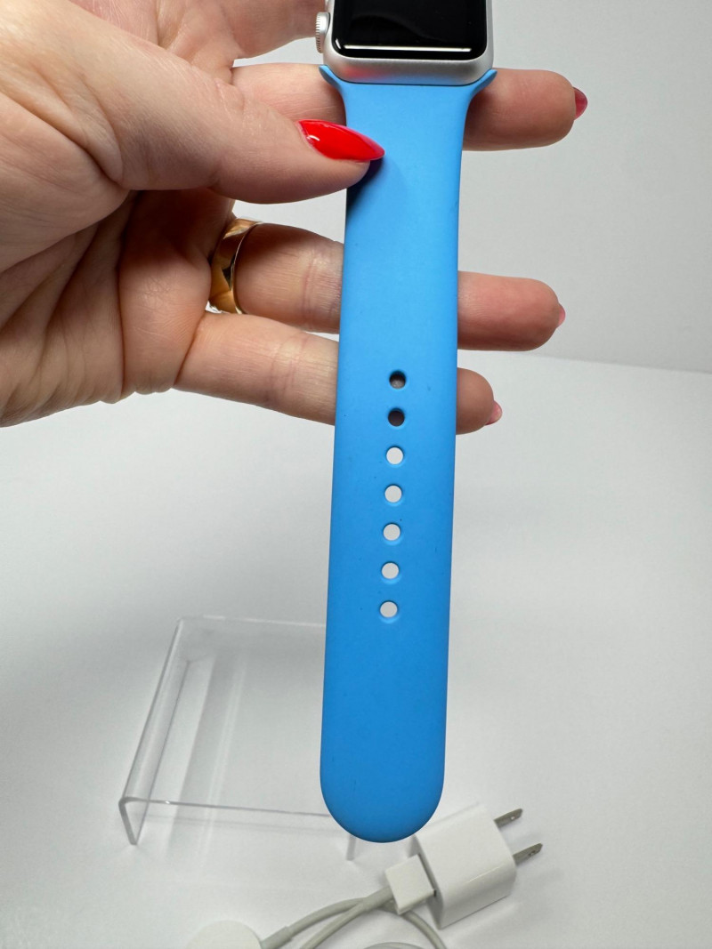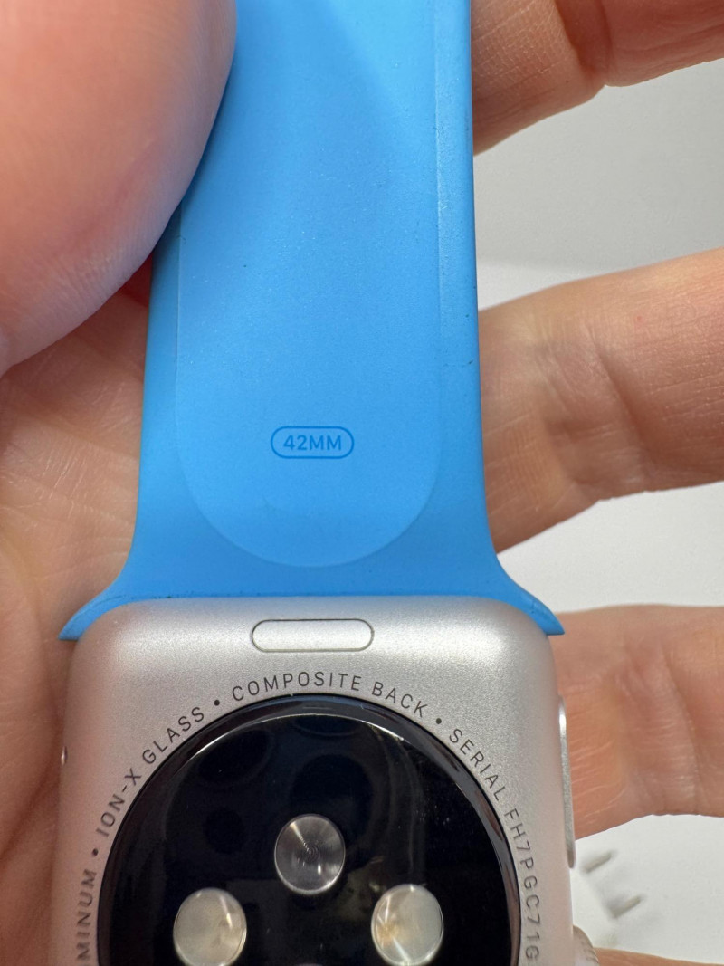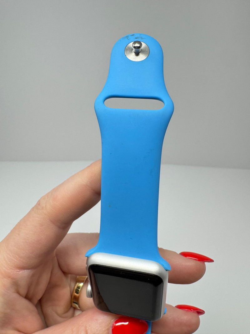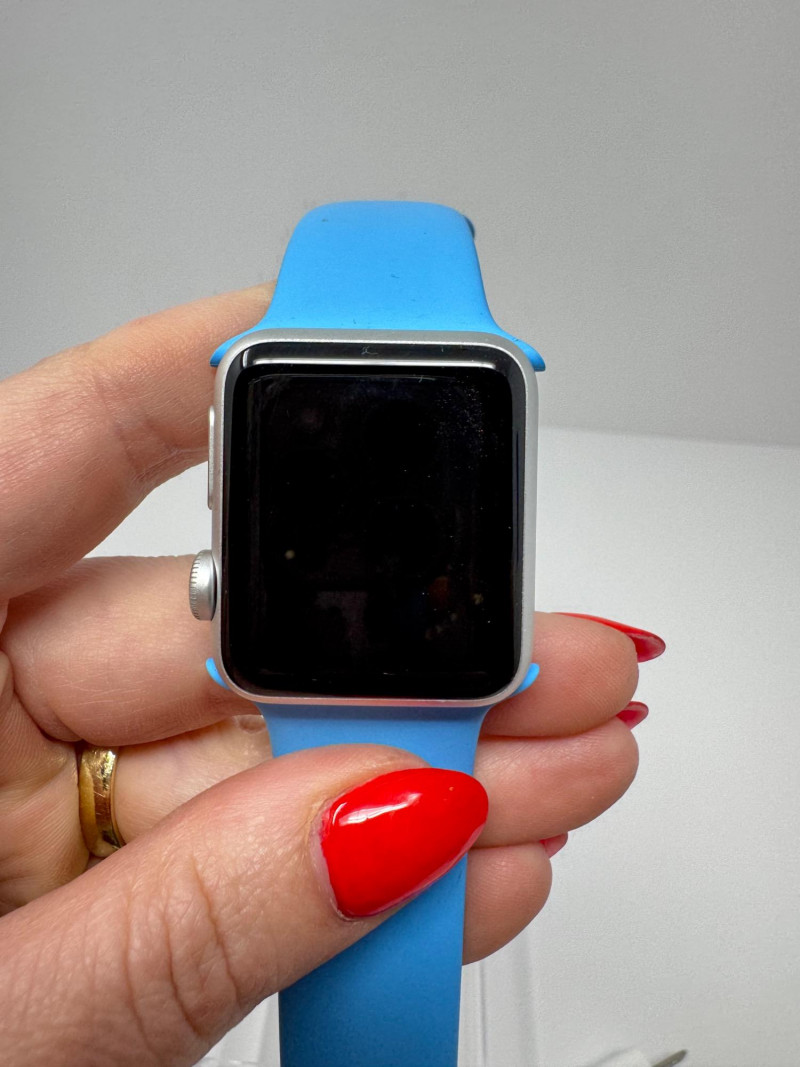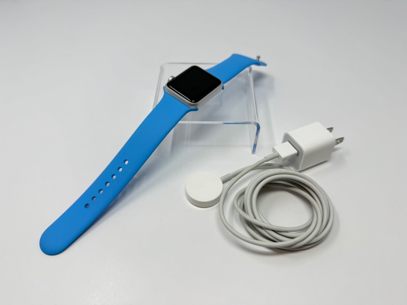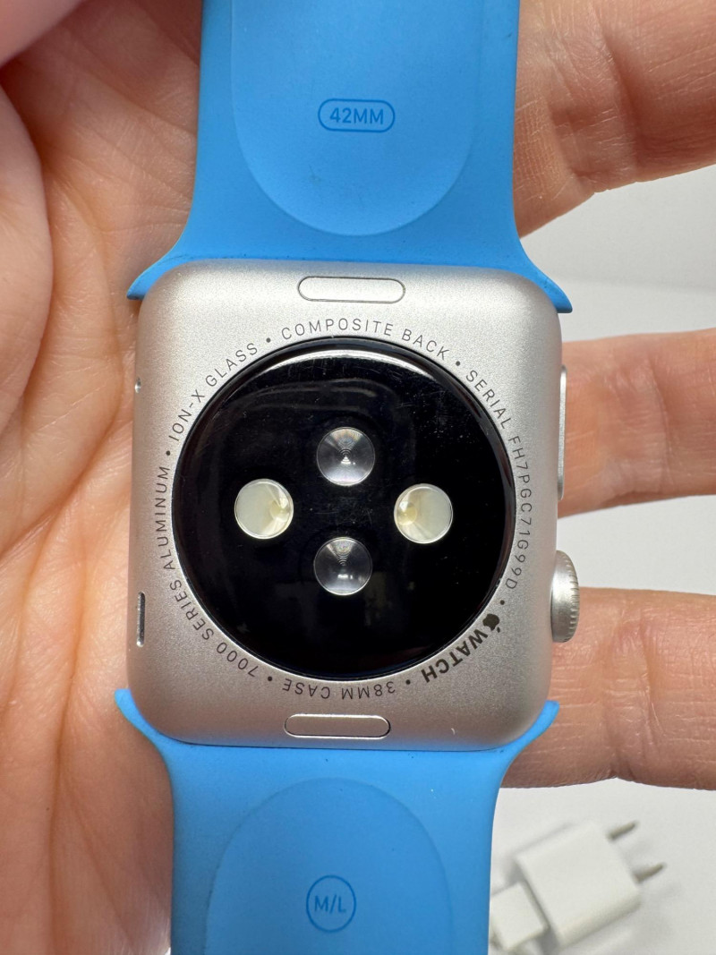 Apple Watch 38 mm Aluminum + Blue Sport Band & Charger – Works. Features Generation / case: Apple Watch (7000-series aluminum), 38 mm Display glass: Ion-X strengthened glass Band: Blue Sport Band, size M/L (marked 42 mm) Serial number:FH7PCG7T699D Includes: 1 m magnetic charging puck + USB power adapter