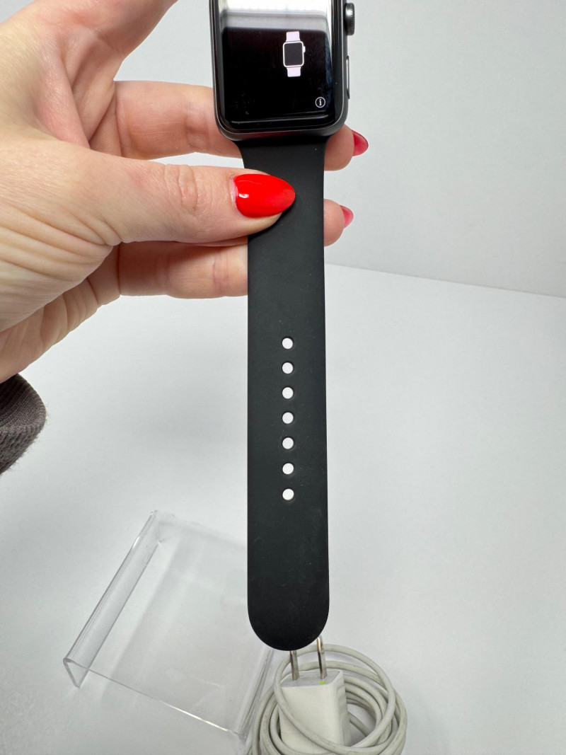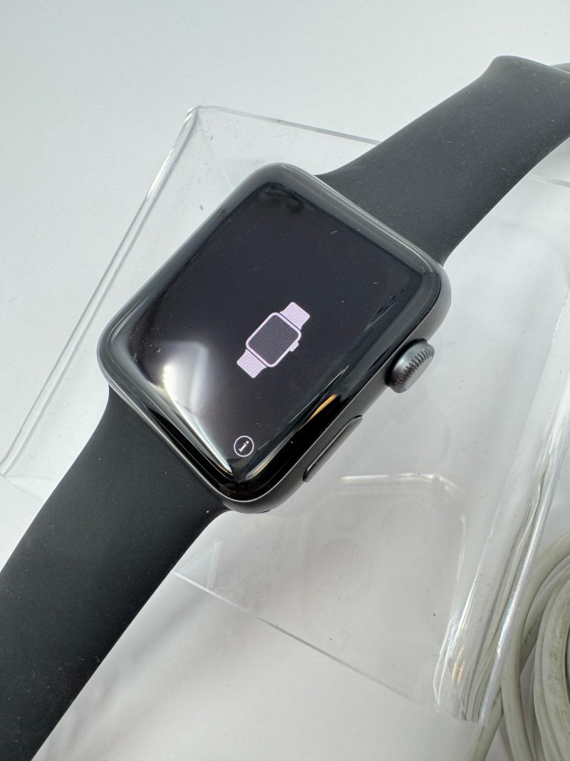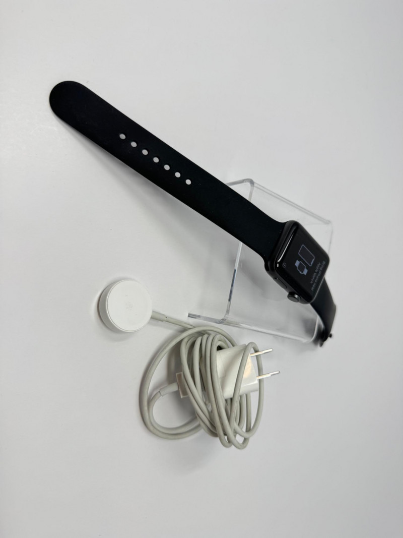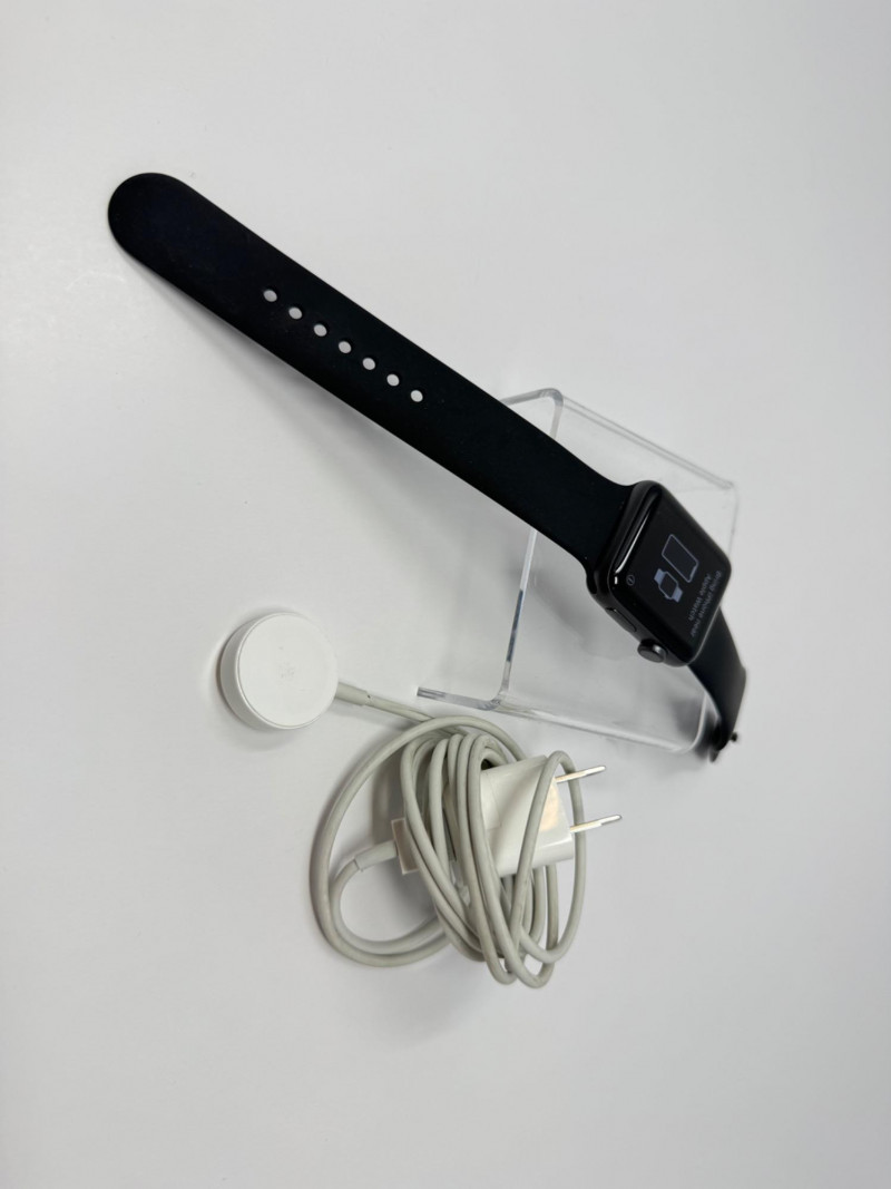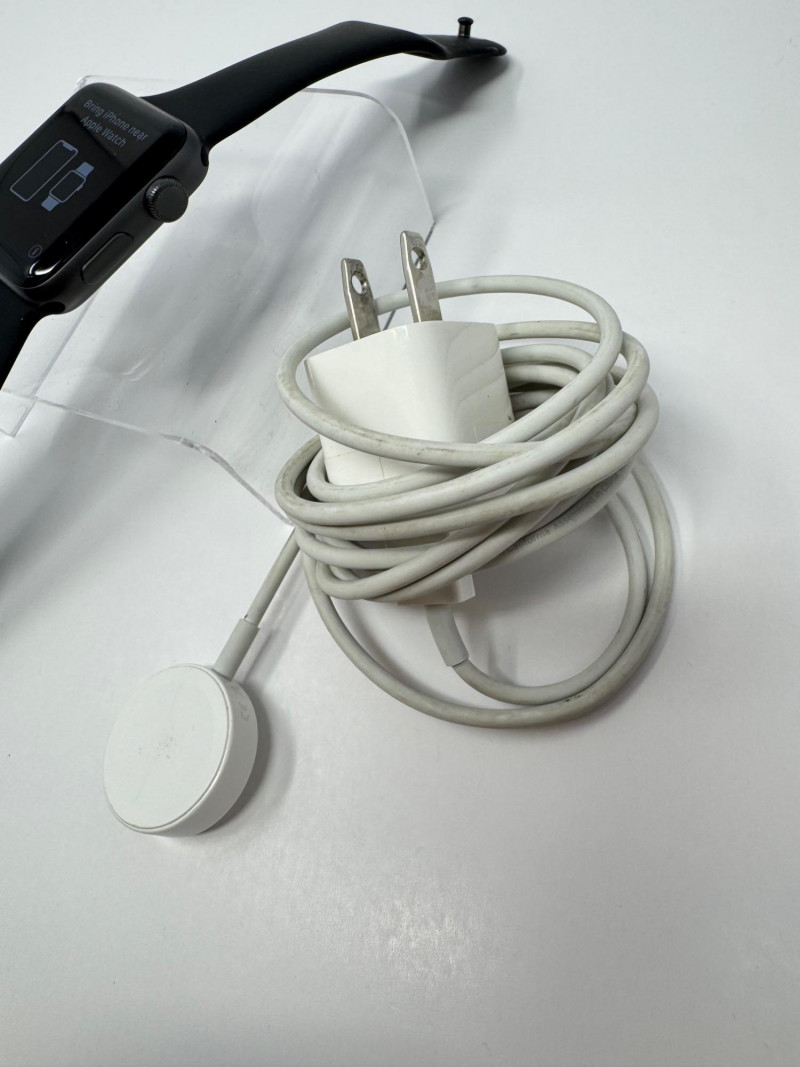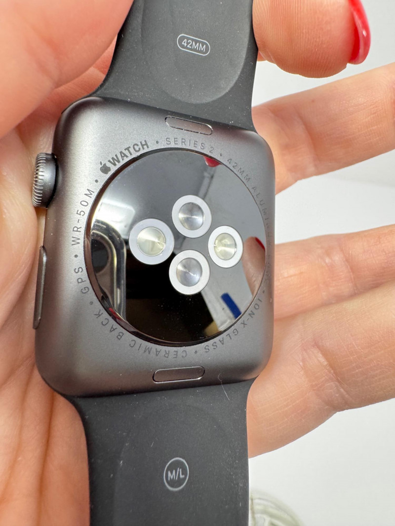 Apple Watch Series 2 GPS 42 mm Space Gray – Black Sport Band + Charger. Features Generation / case: Series 2, 42 mm space-gray aluminum, Ion-X glass Functions: Built-in GPS, WR-50 m water-resistant Band: Black Sport Band, size M/L (42 mm) Includes: Apple magnetic charging puck & USB power adapter Status: Powers on to pairing screen. Condition disclaimer: All pieces are previously used and may display light, unnoted wear—smudges, marks, or small surface scratches—with minor variations from item to item.